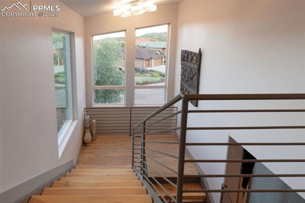 Welcome to an exquisite contemporary residence nestled in an exclusive enclave, where the natural beauty of Red Rocks Open Space unfolds right outside your door. This custom-built masterpiece boasts high-end finishes and elegant details throughout. The main level, designed with a seamless open-concept layout, features a sophisticated living room with a gas fireplace and 12-foot sliding glass doors that invite you to step onto the view deck. The chef's kitchen is exceptional, offering every luxury you could desire. Imagine hosting lavish gatherings around the kitchen island, while savoring the breathtaking views from the walkout deck. Ascend the stairs or glide up in your private elevator to your personal sanctuary. Here, the primary suite awaits, a tranquil haven with a gas fireplace, another 12-foot sliding door leading to a private deck overlooking the open space, and a spa-like ensuite bathroom. Indulge in the jetted tub or multi-jet shower. The custom-designed walk-in closet ensures your wardrobe is impeccably organized, while the adjacent laundry room offers ultimate convenience. The upper level includes a versatile flex space with windows framing awe-inspiring views that can be used for a home office, library, or gym. The lower level offers two generous guest bedrooms and a full bath. A thoughtfully designed dog wash station, located just inside the oversized three-car garage, ensures your pets are pampered after exploring the nearby trails. The garage features an RV bay and an oversized two car garage. This prime location offers effortless access to Hwy 24, making Colorado mountain weekend trips a breeze, while being just minutes away from the dining and shopping experiences of historic Manitou Springs, Downtown Colorado Springs and Old Colorado City. Included with this exceptional home are architectural plans for a 2500 sf addition featuring a luxurious spa area, exercise room, outdoor kennel area and guest suite with view deck and private entrance.
