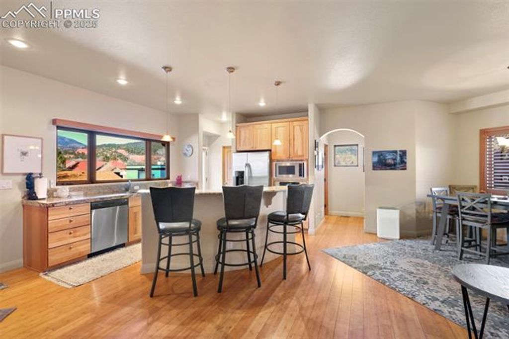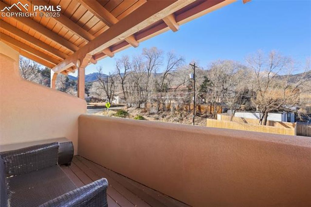 Click on the virtual tour link for a video walkthrough. Experience elevated mountain living in this exceptional Southwest-style luxury townhouse nestled in the heart of Manitou Springs, Colorado. Perfectly positioned within walking distance to vibrant downtown Manitou Springs. This home offers the rare combination of architectural character, refined finishes, and some of the most iconic views in the Front Range"”including Pikes Peak, sweeping mountain vistas, and direct views of the Manitou Incline. Designed to embrace both comfort and scenery, this thoughtfully crafted home features 2 spacious bedrooms, 2.5 bathrooms, and three private balconies, each offering a unique vantage point to soak in Colorado's natural beauty. Whether you're enjoying morning coffee and viewing the mountains or unwinding in the evening with alpenglow on Pikes Peak, every moment here feels intentional and inspired. The interior showcases solid hardwood flooring throughout the main living level and the upper primary suite, adding warmth, durability, and timeless appeal. The main level is ideal for both everyday living and entertaining, with an open, flowing layout that connects the living room with a gas fireplace, dining, and the kitchen. Enjoy cooking with the gas cooktop, wall oven, wall microwave, and beautiful granite countertops. Enjoy the dramatic mountain views while cooking in the kitchen. This townhouse includes central air conditioning and an attached 2 car garage. Upstairs, the primary suite serves as a private retreat. Complete with hardwood floors, a large walk-in closet, a well-appointed en-suite bathroom, double vanity with onyx countertop, copper vessel sinks, a large soaking tub, a spa like shower, and rooftop balcony access. Just steps from shops, restaurants, galleries, hiking trails, and mineral springs, this is a rare opportunity to own a distinctive mountain residence with unmatched walkability and unforgettable views.