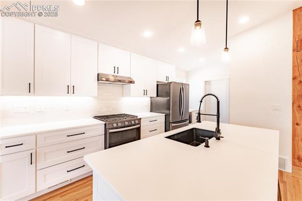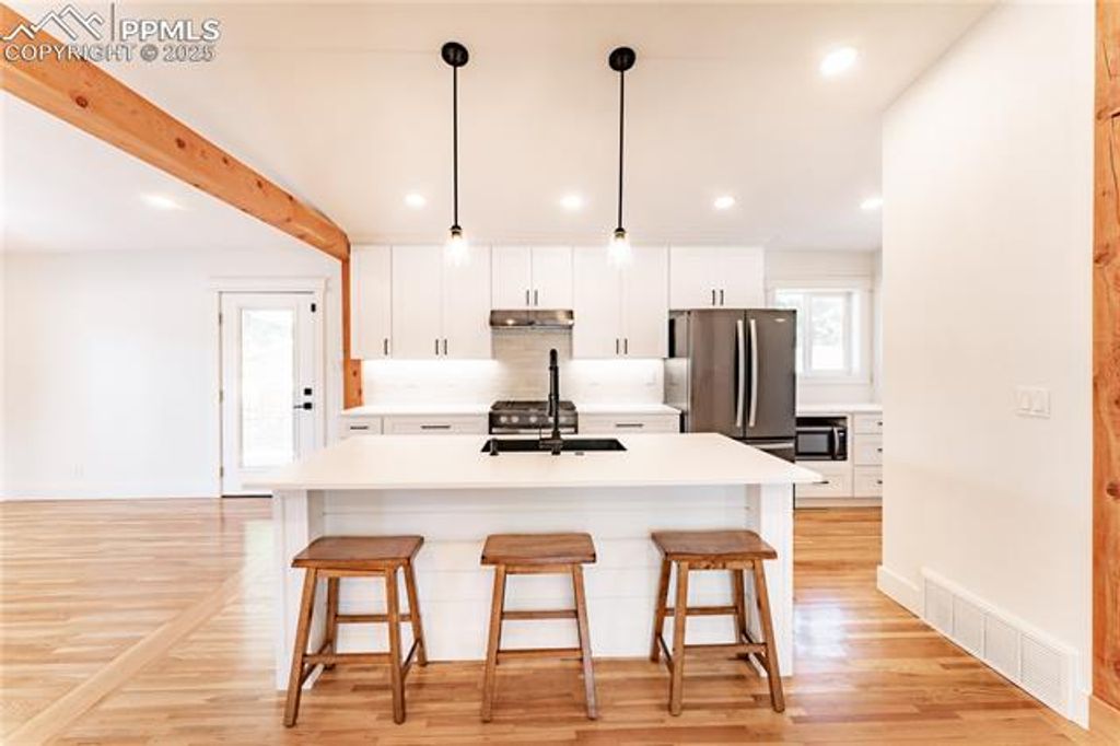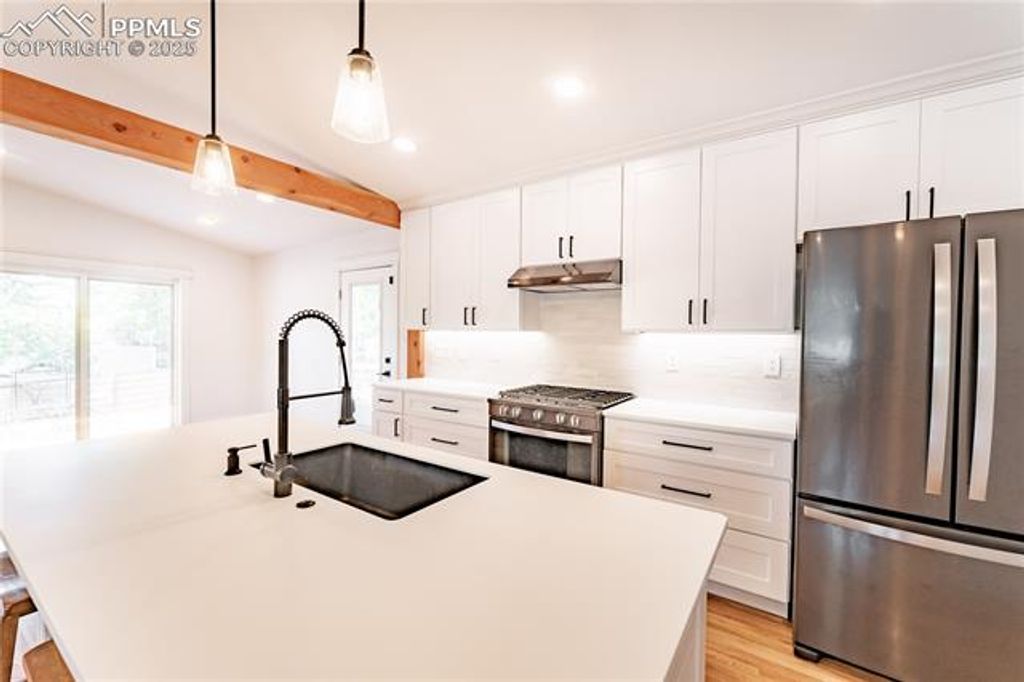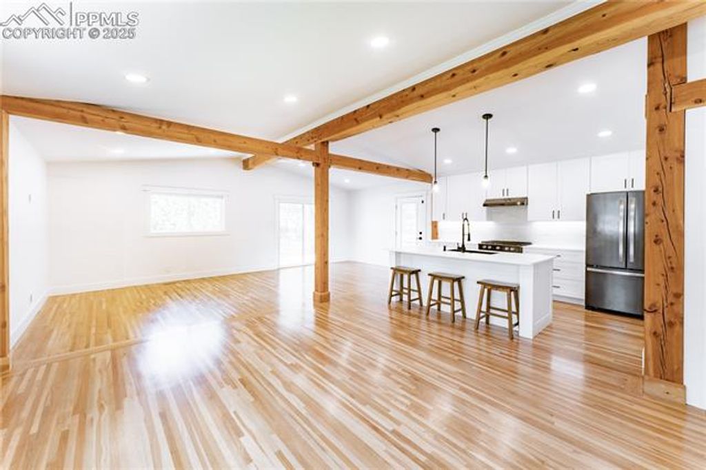 Beautifully remodeled home with 4-Car Garage Near Patty Jewett & Downtown Colorado Springs! Start 2026 off right with a truly one-of-a-kind home that blends modern comfort with timeless character. Fully transformed just five years ago, this home offers a bright, open layout accented by custom wood beams and vaulted ceilings that will make your jaw drop. The gorgeous hardwood floors throughout the main and upper levels pair perfectly with abundant natural light, creating a warm, welcoming atmosphere. The chef's kitchen is a showstopper, featuring 42" soft-close cabinets, avonite countertops, gas range, and black stainless steel appliances ideal for entertaining or enjoying quiet nights in. You'll love the rare 4-car garage setup featuring an oversized attached 2-car garage plus a detached 2-car garage accessible from the alley, perfect for extra storage, hobbies, home gym, or additional vehicles. Centrally located just minutes from Patty Jewett Golf Course, Downtown Colorado Springs, Colorado College, UCCS, and Garden of the Gods, this home offers unbeatable access to the best of the city while nestled in a charming neighborhood setting. Experience a home that stands out from the rest. Recent improvements include central air conditioning, tankless hot water heater, updated plumbing & electrical, class 4 roof, new gutters, new vinyl windows, remodeled kitchen & bathrooms, new wrap around composite deck, new fence, professional landscaping, and so much more! (Technically the fourth bedroom on the lower level is "nonconforming" as it does not have a formal closet, but there is room for one to be added if desired. There is a direct private exterior entrance to this space from the rear of the home which could make it perfect for renting out.)