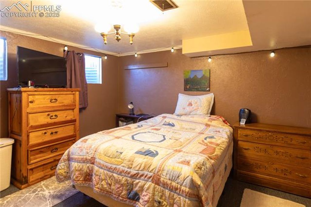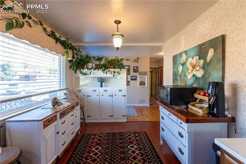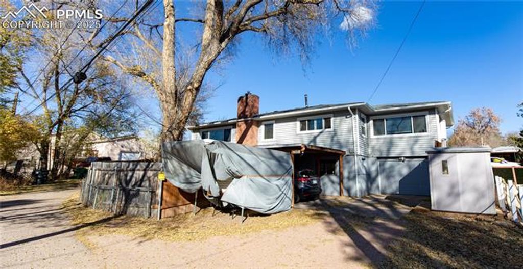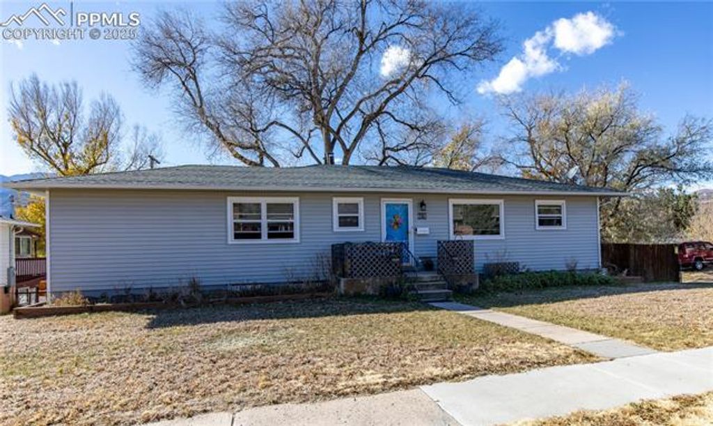 Desirable west-side walkout rancher with Pikes Peak Views! This home is a charmer! Wonderful 1950's era built-ins and custom touches include hutch/entertainment center, display cabinet, original hardwood floors throughout main level, unique wall and ceiling textures, brick fireplace converted to pellet stove and more! In addition to the unique, preserved character of the home are many modern upgrades: newer vinyl windows and siding (2021), GE dishwasher (2024), blinds (2021), newer washer & dryer, pellet stove (with huge supply of pellets included). Spacious kitchen with nook, very large living room with dining area and enormous basement family room with built-in cabinets. Accordion door in basement gives privacy for 5th bedroom (nonconforming) or numerous other uses. Basement also have large utility/laundry room with sink, cabinets, under stairs storage and included washer/dryer and freezer.There is parking behind house "” attached 1-car garage, carport, driveway and RV parking. This home is a gem!