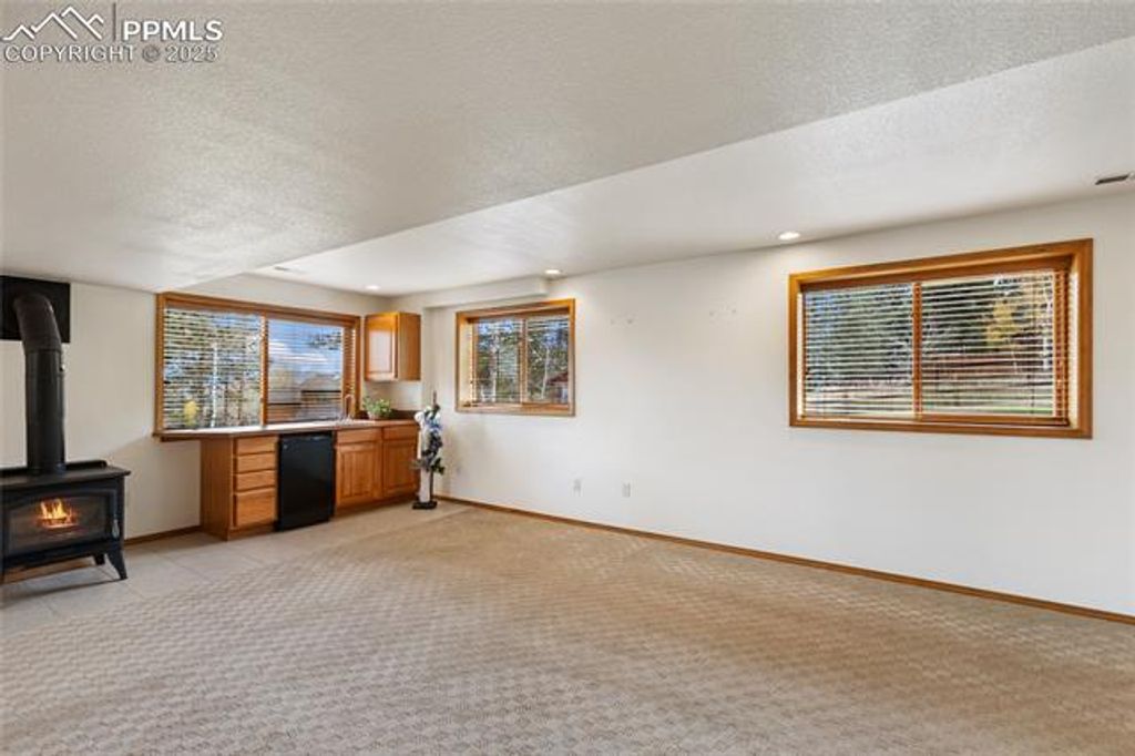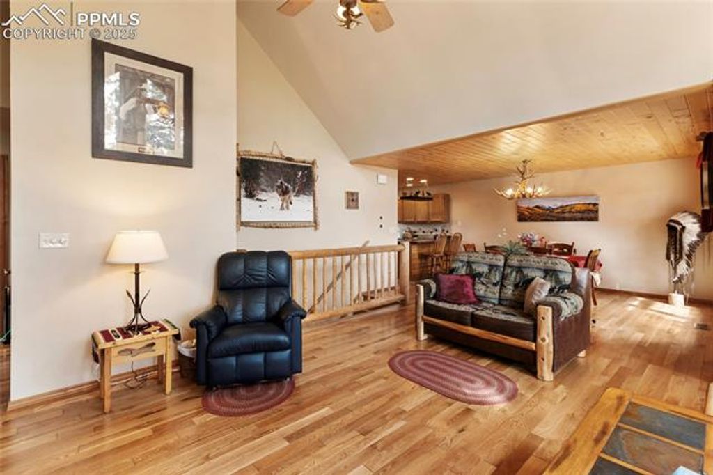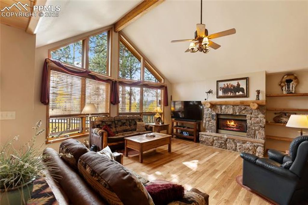 Welcome to your well-maintained home in Country Ridge Estates featuring 4 bedrooms and 3 baths in a 3,252 square foot rancher with a walkout lower level. The open floor plan connects the living area, featuring a gas fireplace, to the beautifully appointed kitchen with all new appliances. The living room and dining room both have new hardwood floors, offering ideal spaces for entertaining and family gatherings. Large windows throughout the home provide breathtaking views of the surrounding mountains and fill each room with natural light. The main level master suite serves as a private retreat with an en-suite bath, while three additional bedrooms are comfortable for family or guests. Downstairs, the lower level features a spacious 30 by 30 family room with a wood-burning stove and access to the yard, along with a full bathroom"”offering great potential for a mother-in-law suite. The oversized garage includes water, heat, and a TV. The level lot showcases views of Pikes Peak. The home is move-in ready, with lots of storage throughout and a pleasure to show.