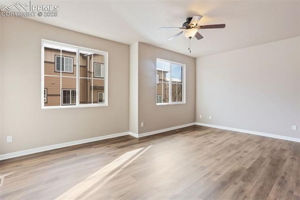 This townhome is just what you've been looking for - affordable, spacious, low maintenance, clean and move-in ready! With new interior paint and new LVP flooring on the upper level, you can move right in and add your personal touches later. The main level contains a living room, separate dining and spacious kitchen, with all appliances. There is a counter bar for additional seating or workspace. The gas fireplace in the living room keeps you cozy on winter nights and the A/C keeps you cool in summer. The upper level features two bedroom suites and a laundry room, with a washer and dryer included. The primary suite is quite large, with attached 4-piece bath and walk-in closet. The walk-in shower has a tiled seat. The secondary bedroom suite also has an attached full bath, walk-in closet and distant mountain views. The west facing entry has a covered front porch and coat closet upon entry. The east side two car garage has a door into the dining/kitchen area. The nice sized garage provides plenty of space for vehicles and storage. There is parking right outside the front door, but it is not assigned. This unit is walkable to the pool, shopping, dining and fitness. Wayfinder Coffee is a popular gathering spot for coffee, tea, dining and themed activities. This complex has easy access to the Powers corridor, schools, UCCS, parks, trails and all that Cottonwood Creek has to offer.