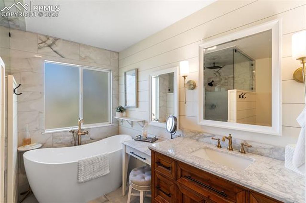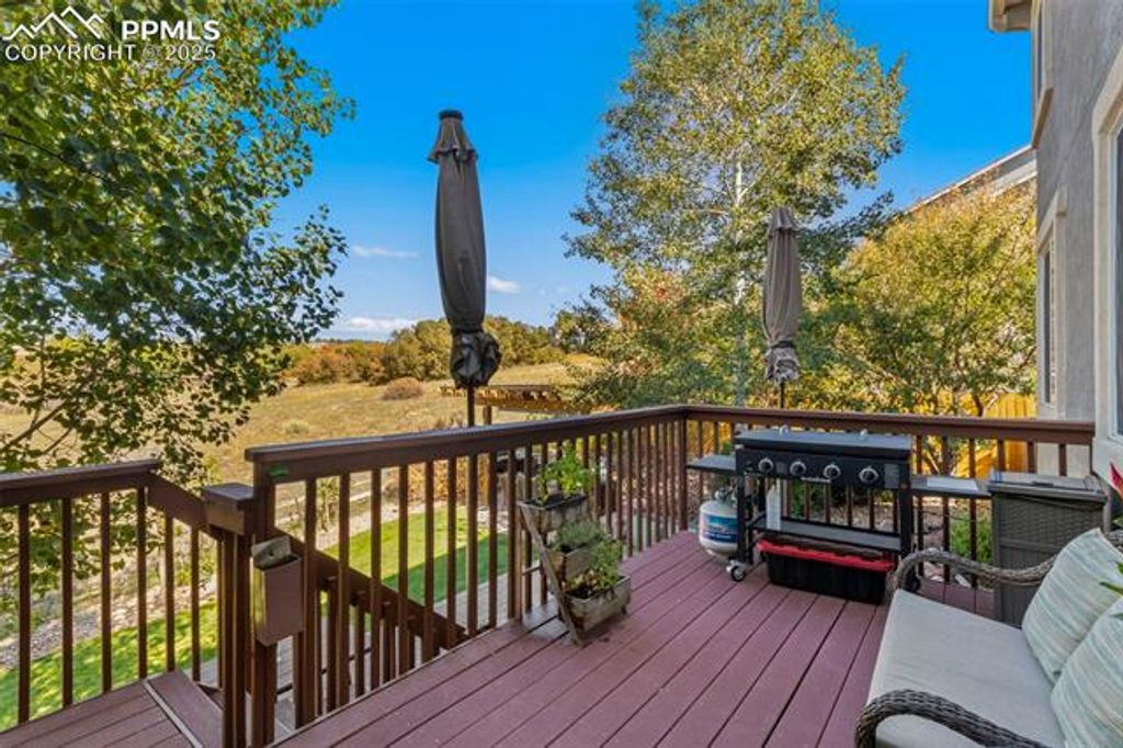 Welcome Home to this one-owner, move-in-ready, immaculate home in Struthers Ranch! If you love outdoor living with Views, Views, Views...this is your place! The backyard will let you experience all Colorado seasons to the fullest! Featuring a gas or wood burning fireplace, pergola, gas fire pit, water feature, mutiple level stone patio's wood deck, raised bed garden areas, fenced in side yard with a shed, lots of grass, three apple trees, one cherry tree, lilac bushes, among other mature landscape, and views into the open space where you can watch the sunsets, or the animals walking by! A Colorado Dream!! Upon entering the home, you will be greeted by hardwood floors, a formal dining area, and a spacious kitchen featuring upgraded cabinets, stainless steel appliances, an eat-in area, and an island with barstools that seamlessly connect to the living room, complete with a gas fireplace perfect for cozy nights. Double French doors will lead to a private office, rounding out the main level. The primary bedroom is located upstairs with a gorgeously remodeled spa-like 5-piece bath. An oversized shower with a rainhead, plus two additional shower heads, a soaking tub, double vanities, a make-up area, and a walk-in closet. There are three additional bedrooms upstairs with a remodeled full bath featuring two sinks. A laundry room, complete with a sink, rounds out this level. The garden-level basement features a large family room and a pool table, which is included with the home. There are two more bedrooms, one is very large and can double as a secondary office. There is also an additional full bath and storage area. Located in Northgate, this home is close to USAFA and offers a quick drive to Colorado Springs or Denver. You will not want to miss this gem! Take a look today!