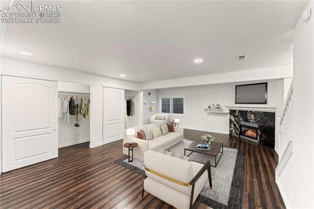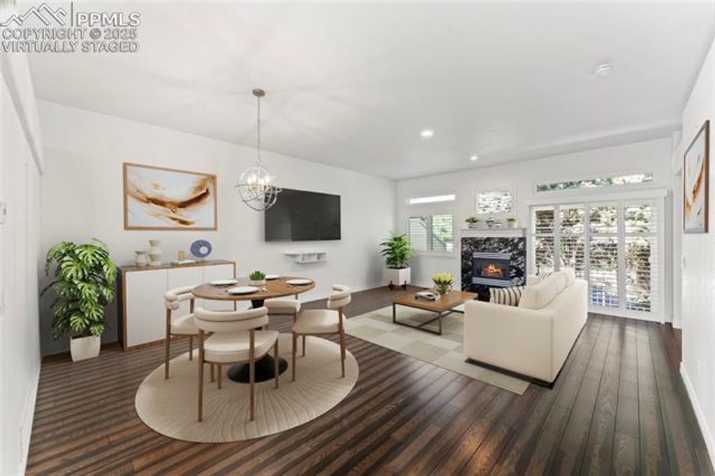 Welcome to this beautifully updated townhome in the desirable Broadmoor Glen neighborhood. Updates since 2020 include new flooring and paint throughout, new kitchen counters and appliances, master bathroom completely remodeled and more. This townhome boasts a spacious floor plan with luxury kitchen including new stainless steel Kitchen Aid appliances. The attached two stall garage has plenty of room for two vehicles and storage. Enter from the garage into the dining room and kitchen area. The main front entry is wonderfully landscaped and has a gated patio that enters into the large living space with a fireplace and walkout to the back patio. With two generously sized bedrooms upstairs and downstairs there is plenty of room for everyone. The master suite includes a five piece bath and walk in closet while each bedroom offers plenty of closet space. Downstairs is another large living space with a fireplace. Storage abounds in this townhome especially in the lower level with multiple closets and areas to store decorations and equipment for hobbies of all kinds. Close to Fort Carson, shopping, Cheyenne Mountain schools and easy access to I-25 make this townhome a must see.