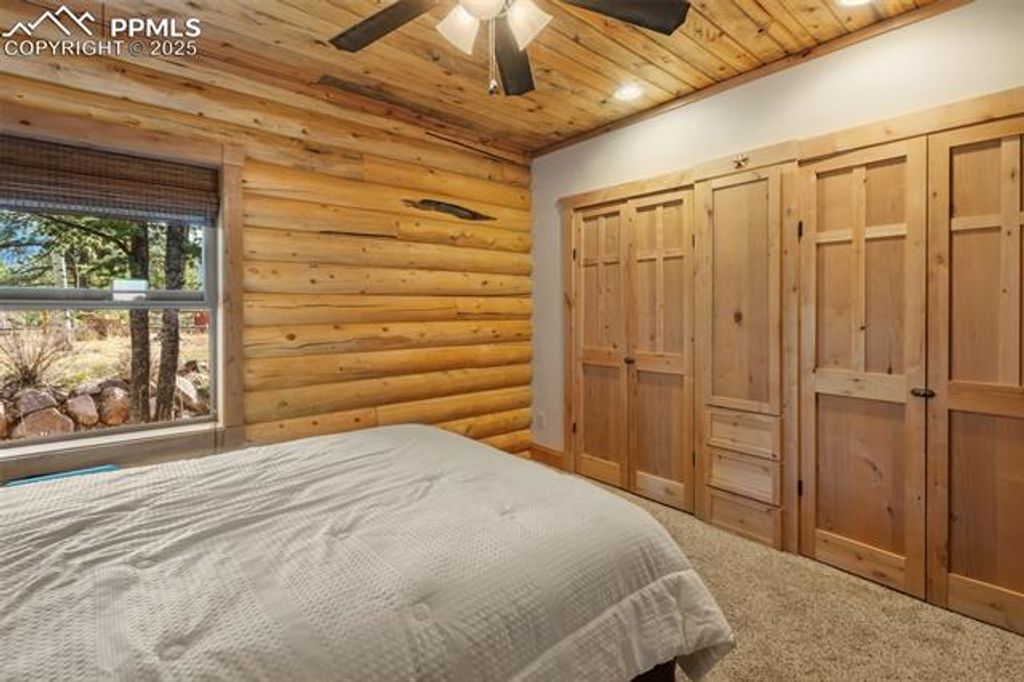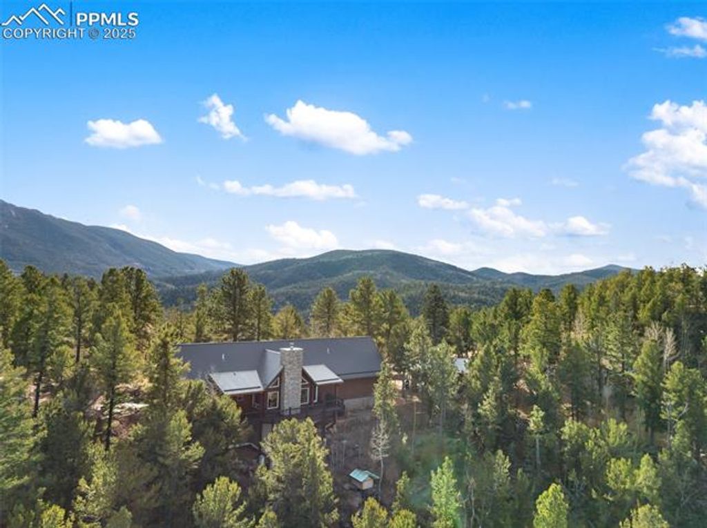 Charming Custom Built Log Home with Sweeping Mountain Views Discover the beauty of Colorado living in this handcrafted 2- bedroom, 2-bath log home, nestled on 3.75 acres of pristine land with breathtaking 360º vistas, including Sentinel Point at Iconic Pikes Peak. This retreat blends rustic charm with modern comfort, featuring; engineered hardwood floors, leathered granite countertops, beautifully crafted custom-built cabinetry, double ovens, with additional wine cooler and separate freezer built into the cabinetry. The Dacor 6 burner gas range adorns the 6' by 52" Island and makes the kitchen a Chef's dream perfect for entertaining or just cooking that gourmet meal. The open concept Kitchen, Dining and Great Room, filled with natural light and the floor to ceiling stone fireplace showcases the warmth of authentic log construction. Step outside to enjoy the expansive deck and explore your private acreage, embraced by nature and overlooking unobstructed majestic mountain landscapes including views of the Collegiate and Sangre de Cristo ranges. The oversized 24x24 attached double car garage and a 30x24 detached, insulated, log-sided workshop offers versatile space for hobbies, storage, or creative pursuits. Whether you're seeking a full-time residence, a vacation escape, or a peaceful retreat, this one-of-a-kind property offers craftsmanship, comfort, and a deep connection to the land.