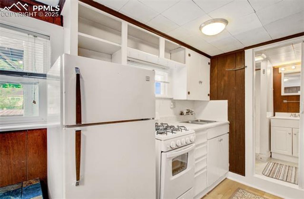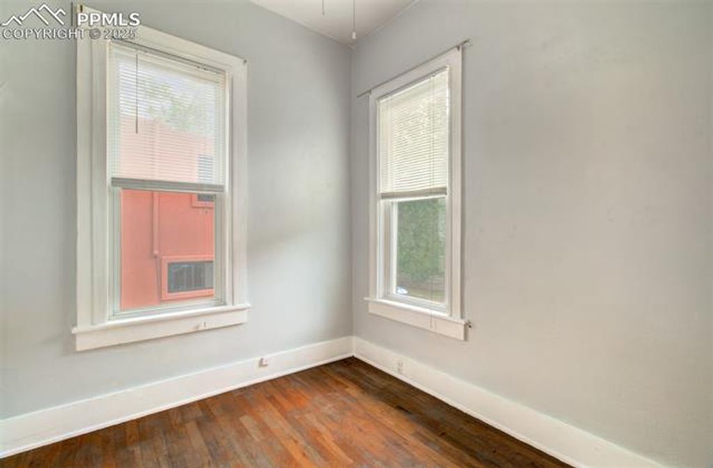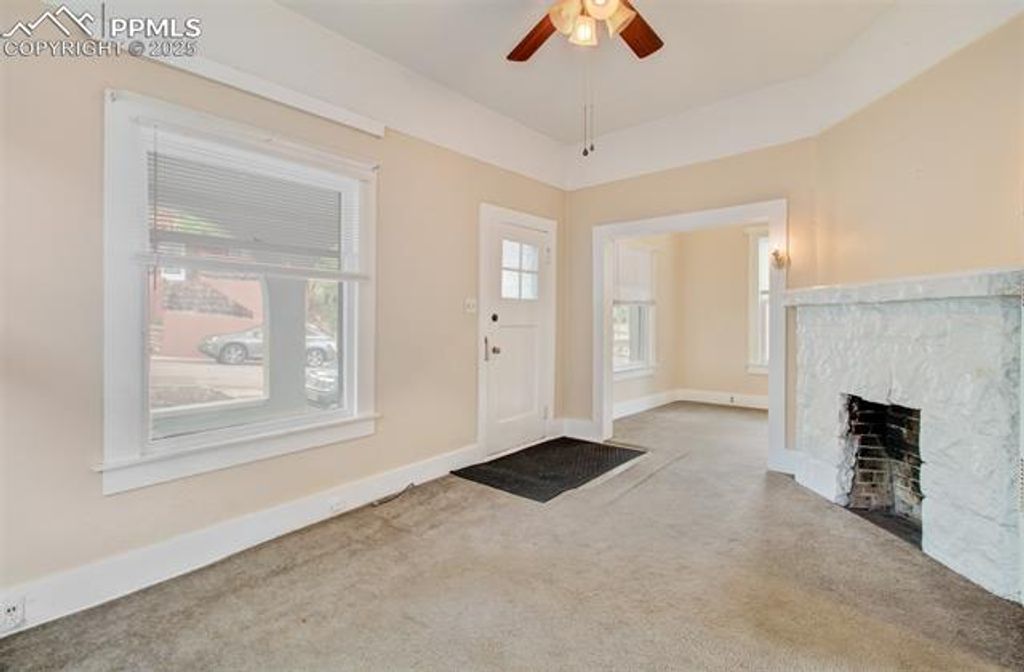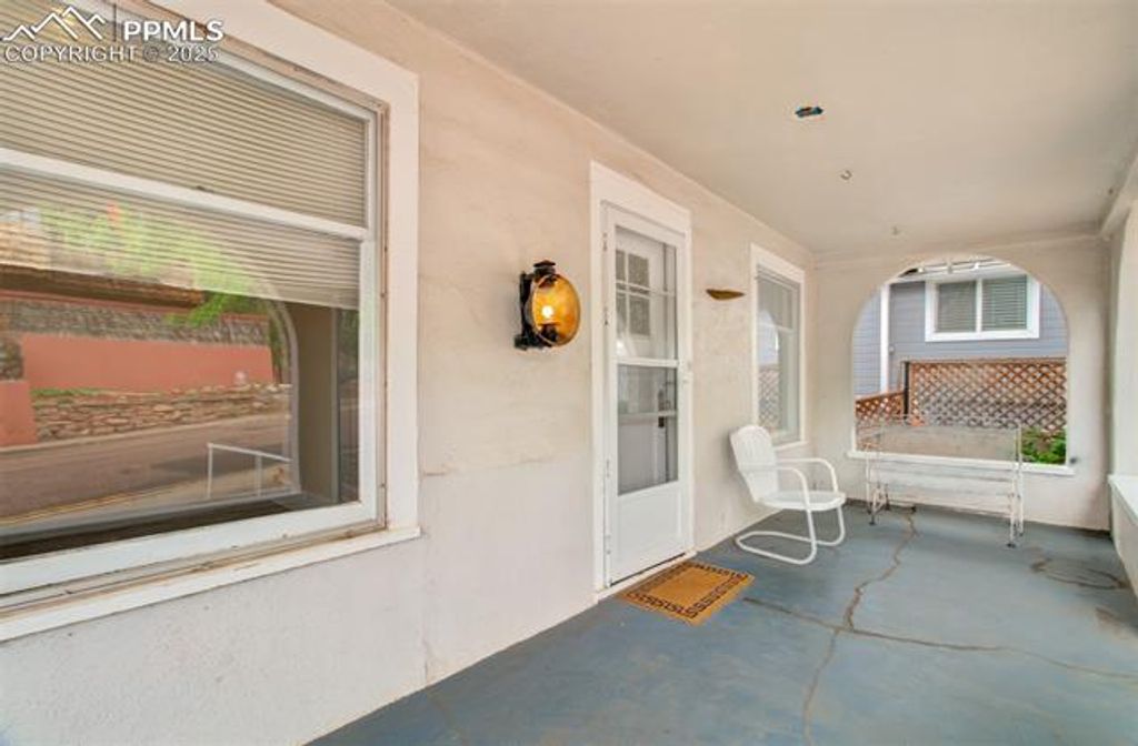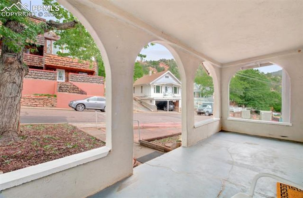 Turn of the century stucco home that has a turret and a full covered front porch. The main level is one apartment with high ceilings, and a carpeted living room that has a stone fireplace. A study off of the living room could easily be converted into a bedroom. Both rooms have hardwood floors under the carpet. The kitchen features lots of cabinets, a range oven, dishwasher, and refrigerator and has plenty of room for a kitchen table. An enclosed porch off of the kitchen can act as a mud room or could be converted to laundry space. A bedroom off of the kitchen has wood floors and has a 3/4 bath adjoining the room that includes closet space for clothing. The main level has two wall furnaces to keep the home cozy in the fall and winter. A concrete pad out front allows for off street parking. The lower unit is more like an efficiency apartment. There is a small kitchen, a living room, and a bedroom. A 3/4 bathroom is off of the kitchen. The kitchen has a range oven and a refrigerator. A brick paver pad off the door to the unit can be a patio or off street parking for this unit. There is a cloths line in the backyard. A door off the back of the home accesses the basement where the water heater and shelving for storage abounds. A common area washer and dryer area could be located here. The roof is a hail resistant roof and is approximately 6 years old. Utilities are included in the monthly rent. Excellent long term rental history. Walking distance to downtown Manitou Springs is just a few blocks away.