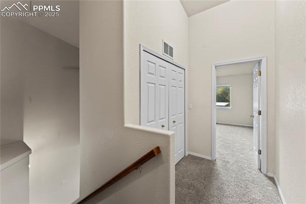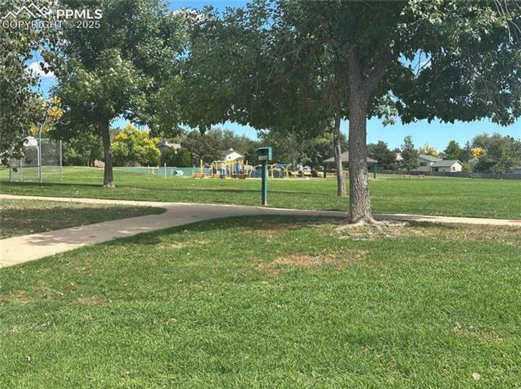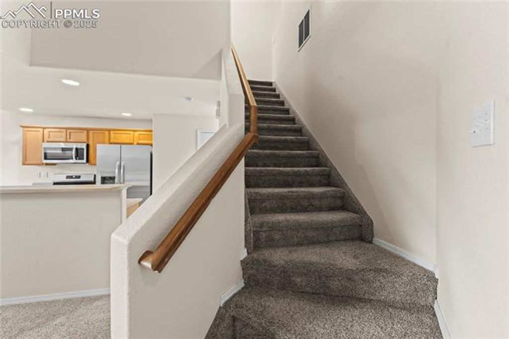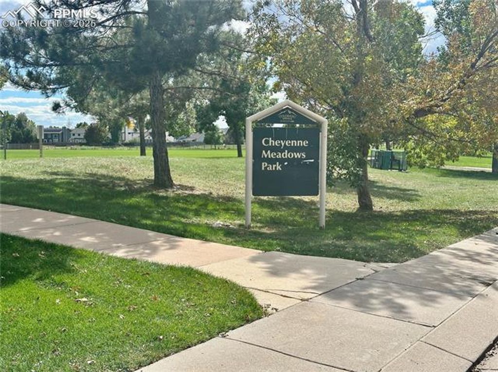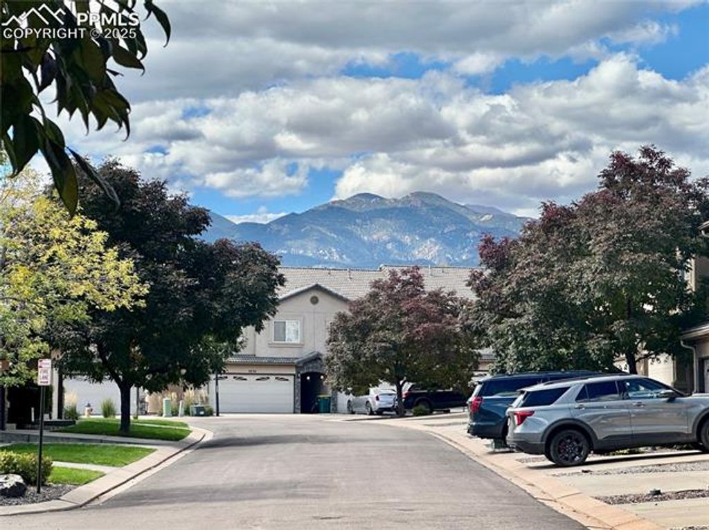 Beautiful townhome community with spectacular views of Cheyenne Mountain and the front range. Stucco exterior and tile roofs give the community a polished look! The main level includes a bright open floorpan with a cozy living room that includes built in shelving, windows that have wonderful Cheyenne Mountain views and a gas fireplace. The living room connects to the kitchen and dining area which boast brand new stainless appliances, a large breakfast bar and a walk out to your own private patio with no neighbors right behind you. A convenient half bath and door to the spacious two car garage finish out the main. Upstairs you will find the primary bedroom with attached bath to your left and a large walk in closet. You get those beautiful mountain views from the upstairs windows too! Two other bedrooms and a full bath are included on the upper level as well as a convenient upper level laundry area. The grounds are immaculate and well taken care of and right across the street is beautiful Cheyenne Meadows park. Close to schools, the park, hiking, shopping, dining and entertainment and a five minute drive to Fort Carson!! This could be your new home!!