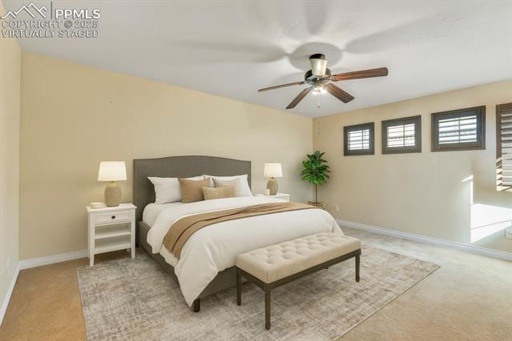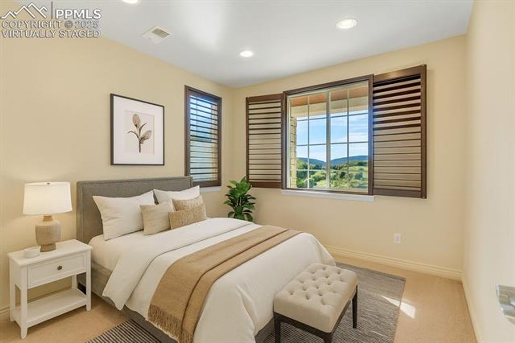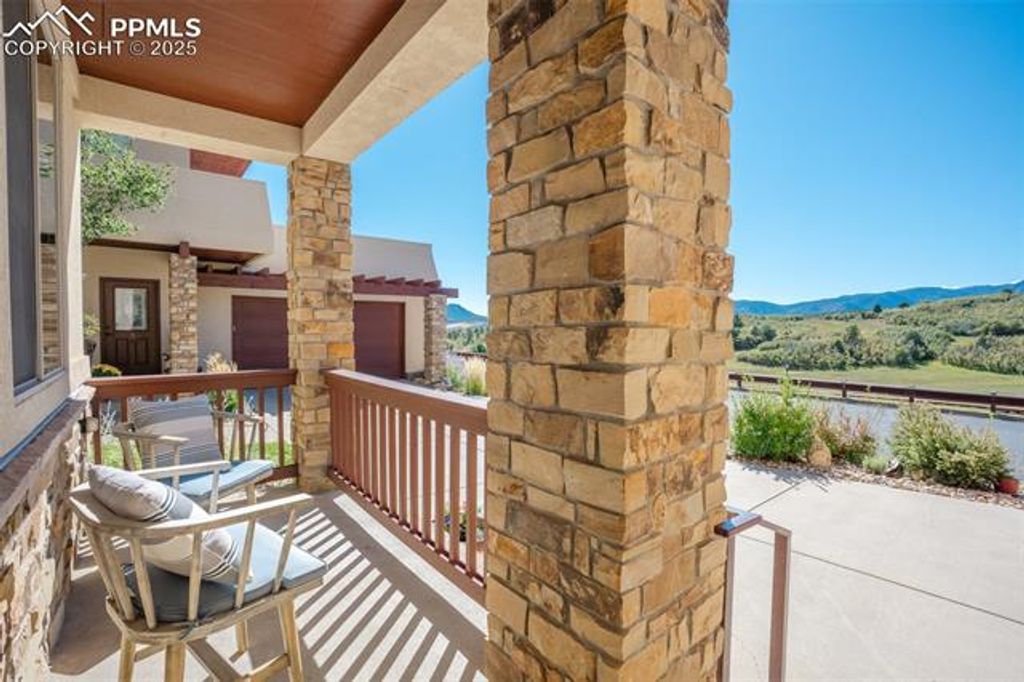 Welcome home to breathtaking Colorado views! From the moment you enter the foyer with its soaring two-story ceiling, you'll feel the spacious elegance this home offers. The inviting living room features plush carpeting, custom wood shutter window coverings, a cozy gas fireplace with tile surround, and ceiling fan. The updated kitchen is a chef's delight with beautiful LVP flooring, stunning quartz countertops, stainless steel appliances, center island with seating, and a large pantry. A light-filled dining room with LVP flooring, chandelier, and sliding glass doors opens to the outdoor living space"” perfect for entertaining. The main level primary suite offers comfort and privacy with a spacious bedroom, custom shutters, and a luxurious five-piece en-suite bath complete with dual sinks, soaking tub, walk-in shower, and a generous walk-in closet. A second bedroom, full bath, and convenient laundry/mud room complete the main level. Upstairs, the loft is bathed in natural light and provides sliding glass access to an upper balcony showcasing incredible panoramic views. Another spacious bedroom with walk-in closet, ceiling fan, and full bath make this level ideal for guests or family. Whether relaxing indoors or enjoying evenings on the deck or balcony, this home was designed to maximize its stunning mountain and neighborhood views. Low-maintenance community with no yard work required, this home lets you focus on the finer things in life. Only 1/2 mile from the award-winning Perry Park Country Club, accessible by golf cart, allowing you to take in the stunning scenery along the way.