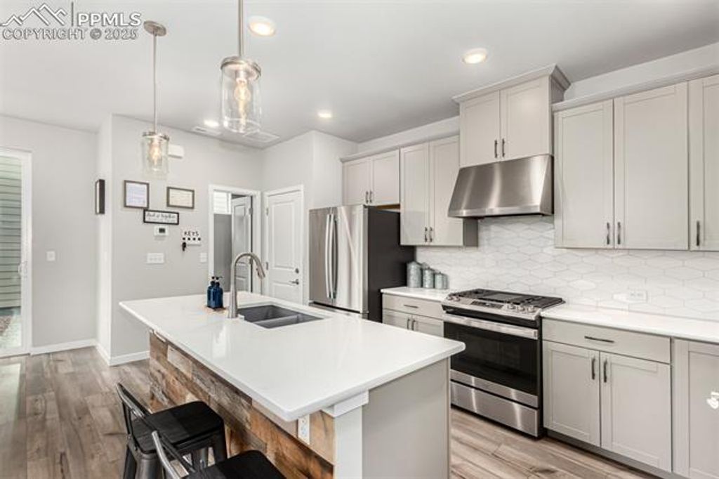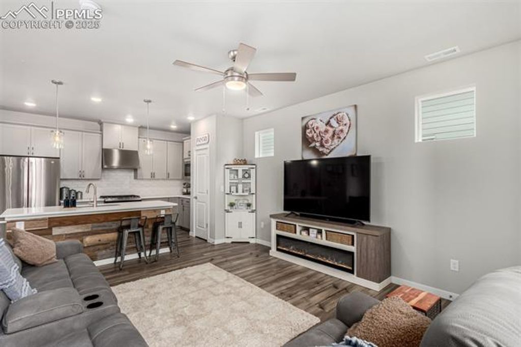 Modern design and thoughtful craftsmanship define this contemporary home built in 2023. A confident facade of clean architectural lines and low-maintenance xeriscaping creates a striking first impression, blending style with environmental mindfulness. Inside, wide-plank flooring welcomes guests into an open and connected main living area where natural light and movement flow seamlessly from entry to gathering spaces. The spacious living room opens effortlessly to the outdoors through an expansive glass door, fostering a sense of continuity between interior and exterior living. At the heart of the home, the kitchen offers understated sophistication - gray shaker cabinetry pairs with crisp white quartz counters, a timeless subway tile backsplash, and stainless steel appliances. The shiplap-faced island adds a rustic yet refined focal point, offering additional prep and seating space, while a walk-in pantry introduces a layer of practical elegance. Upstairs, the serene primary suite feels like a private sanctuary, anchored by a statement fireplace and framed by soft natural light through abundant windows. The ensuite bath reflects a modern spa aesthetic with dual undermount sinks, quartz surfaces, gray cabinetry, and a walk-in shower complete with a rainfall showerhead. Two additional bedrooms combine light and functionality, complemented by generous closet storage. A flexible loft space provides room for quiet retreat, work, or creative pursuits. Outdoors, a private and charming greenspace offers a simple yet inviting extension of the home. A two-car attached garage enhances daily convenience. This residence blends contemporary design with a sense of warmth and balance, an ideal setting for those seeking a home that feels both current and enduring.