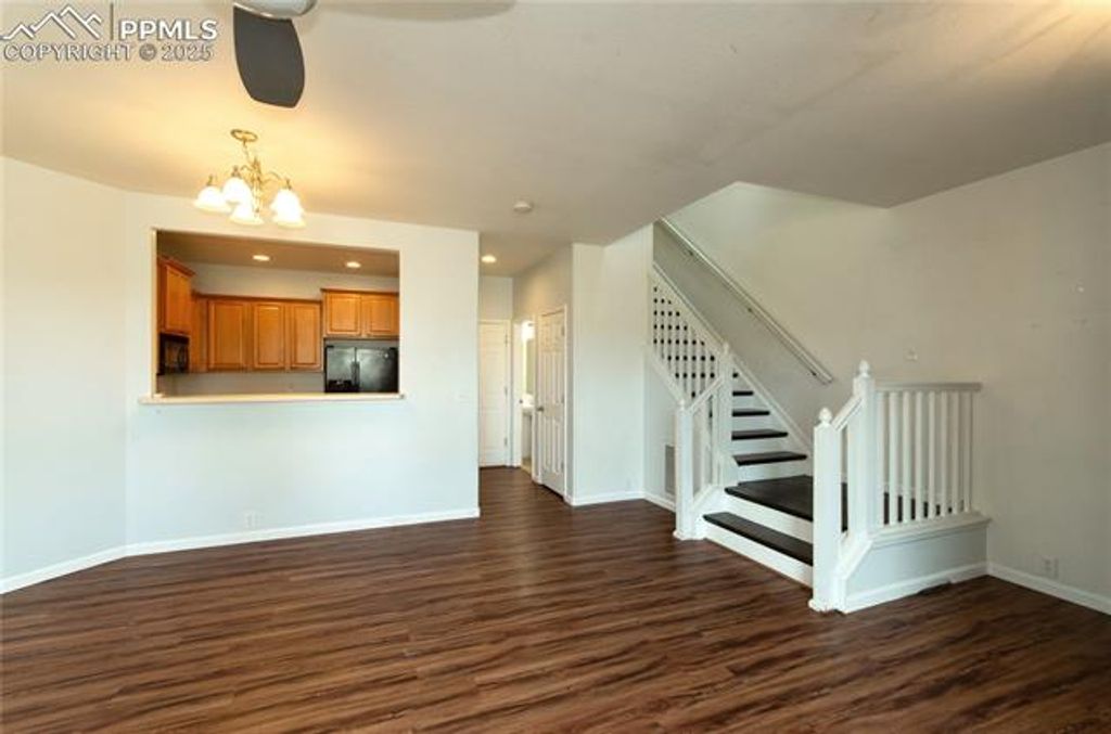 Practical, easy-living floorplan with laminate Great Room with ceiling fan, walk-in to Kitchen from Garage. Hardwood Kitchen with eating bar and pass thru to Dining Area. Guest 1/2 Bath on Main, hardwood stairs with landing. Two Bedrooms and two full Baths upstairs, large Primary Bedroom with walk-in closet. ensuite full Bath with double vanities, secondary Bedroom, hallway full Bath, Laundry with included Samsung appliances. Central AC, both Bedrooms with ceiling fans, 2022 water heater. New roof, stucco and stone exterior. Guest parking right outside the door. Mountain Views, property fronts to small open space area for pets. Easy access to nearby walking and riding trails. Community also features its own grassy dog park. Super convenient location just steps to Lewis Palmer HS, minutes to I-25, Monument shopping, dining and recreation, YMCA and USAFA. Come take a look at this great property!