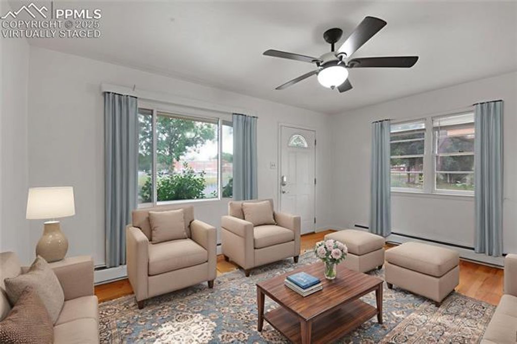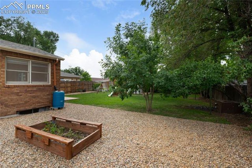 This charming brick ranch offers comfort, space, and convenience in a wonderful location across from a school and near several parks and open spaces. The oversized, level backyard is a true oasis with mature trees, garden boxes, a patio, and a dedicated garden area, all supported by a strong irrigation well for easy watering. Inside, you'll find both a living room and a family room on the main level, showcasing beautiful hardwood floors and a cozy fireplace with a floor-to-ceiling brick surround. The kitchen is bright and functional, featuring ample cabinetry and a range with double ovens. Three main-level bedrooms are served by a full and a half bath, while the finished basement adds a second family room"”perfect for a play area, home office, or media room"”as well as a spacious laundry room and excellent storage. Thoughtful updates include a new roof (2022), sump pump (2021), well pump (2023), and newer sliding and entry doors. The backyard landscaping was refreshed in 2021, and the east fence was installed in 2018. With quick access to hiking and biking trails, shops, restaurants, and I-25, this home is move-in ready and waiting for you. 3 virtually staged photos.