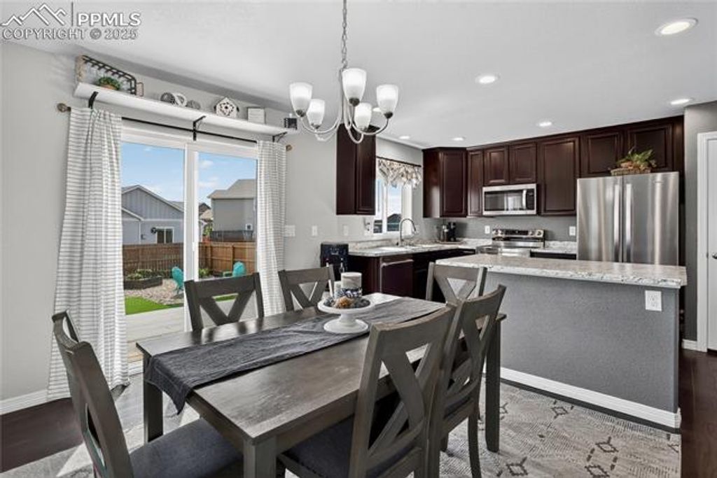 A welcoming front porch introduces this well-maintained home in Meridian Ranch. Inside, natural light fills an open main level grounded by new carpet in the living room and wood-inspired flooring in adjoining spaces. The eat-in kitchen showcases a generous center island, new shelving in the pantry, and a new stove and dishwasher. Sliding glass doors extend the living space outdoors to a custom Trex deck, overlooking a xeriscaped backyard with garden beds and turf designed for recreation. Upstairs, each bedroom is brightened by wide windows. The primary suite is enhanced by vaulted ceilings, a spacious closet, and mountain views. The en-suite bath features dual vanities, a tiled tub, and thoughtful finishes. Recent upgrades include an updated entryway floor in 2024, & a new water heater, landscaping improvements, and new carpet, appliances, and back steps (2025). The attached 2-car garage provides additional storage with shelving. Recreational living extends beyond the backyard with community parks, trails, a pool, and a new recreation and fitness center. Everyday conveniences are close at hand with schools, dining, and shopping just moments away.