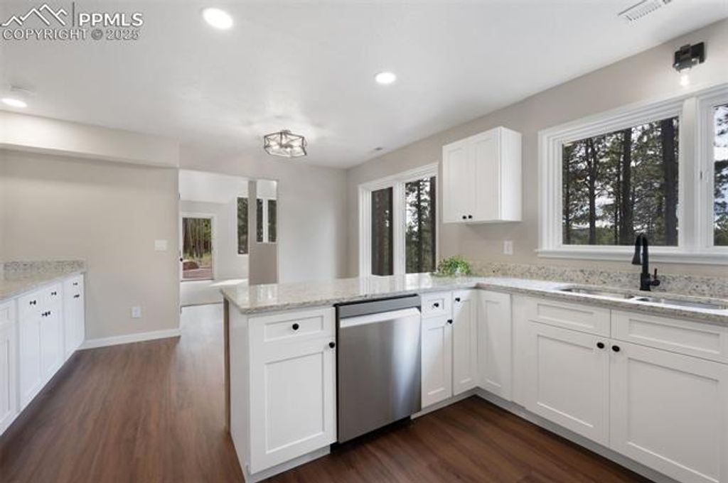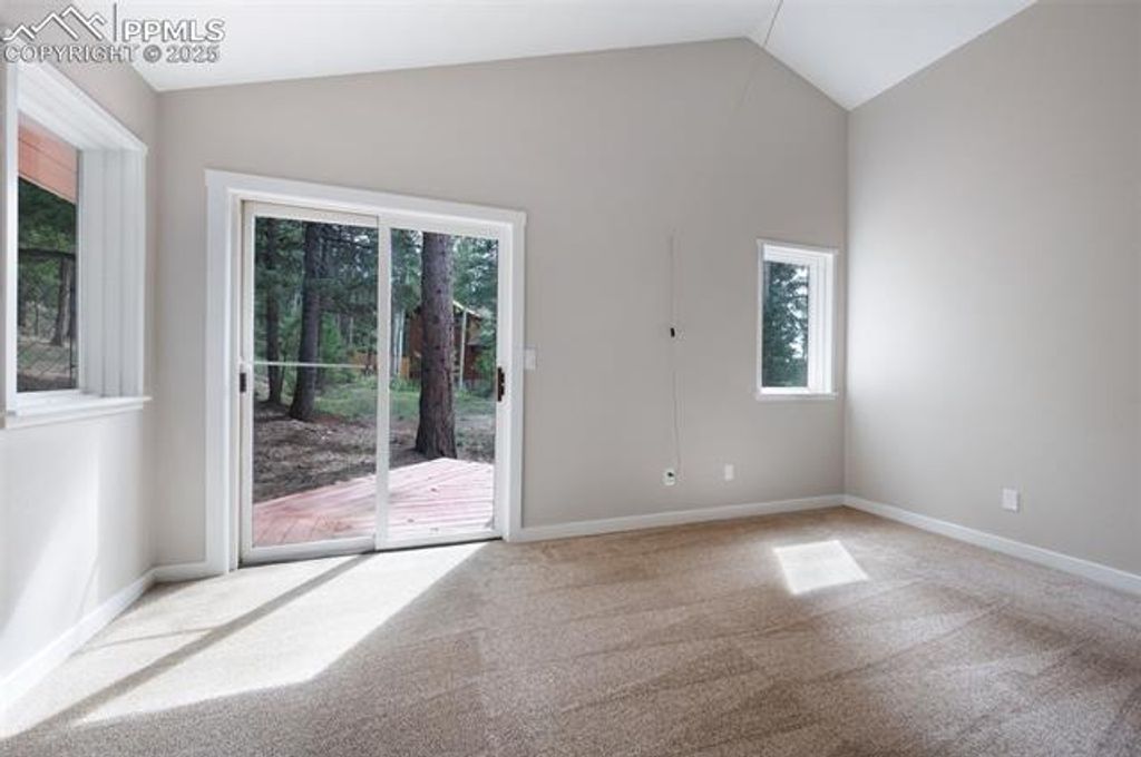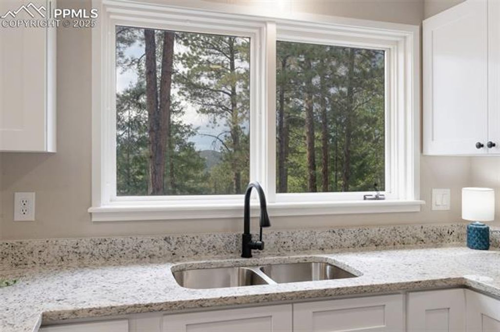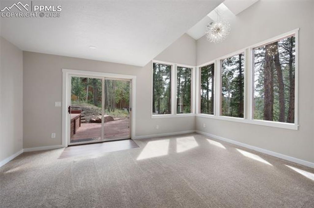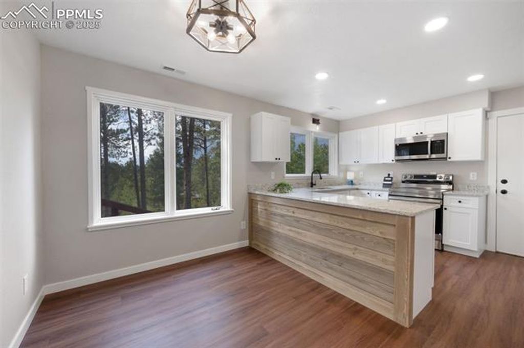 Experience the true mountain lifestyle: Discover tranquility in this charming, updated 3-bedroom, 2-bath single-family home. In this quiet neighborhood, the sounds of city life are replaced by the gentle rustle of the breeze through the pine needles and the calls of local wildlife, offering a genuine retreat from the hustle and bustle. Enjoy unparalleled views from every window and direct access to BLM land from the backyard. A spacious deck with a built-in chimenea is perfect for enjoying the ourtdoors. The exterior boasts a new stain, while the interior features fresh paint, new flooring, updated lighting, a renovated kitchen, the bathrooms have been fully updated, and the kitchen appliances are all brand new. A cozy wood-burning stove provides warmth on chilly evenings, and a paved driveway ensures easy access. This home is the of both worlds...you'll enjoy the privacy and peace of a true mountain escape, coupled with the ease of having amenities nearby as you're only minutes away from the shops and services of Woodland Park.