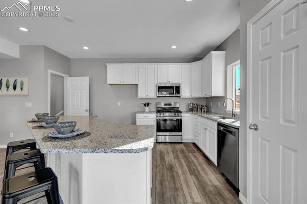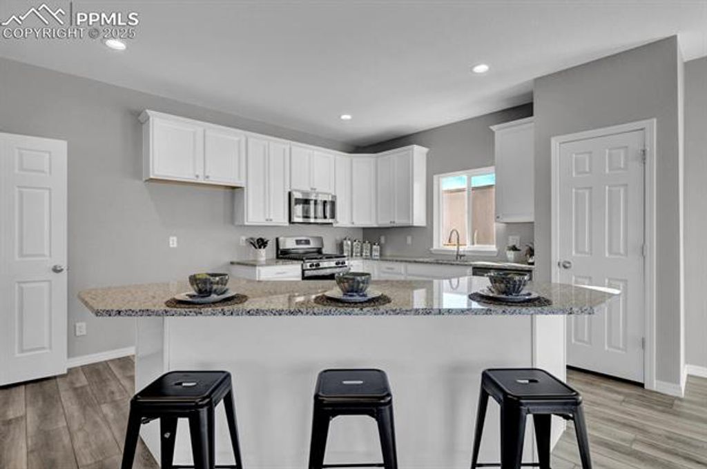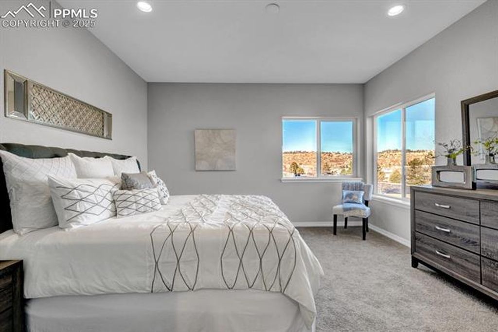 New construction located in Southwest Colorado Springs' new Creekwalk neighborhood. Near internationally acclaimed destination The Broadmoor, Today's Terrace at Creekwalk offers a contemporary home design in a coveted location. Select your favorite finish colors, and builder will complete within 60 days of contract. Modern exterior elevation welcomes you into this two-story with 5 bedrooms, 4 bathrooms, a 2 car garage, and a full finished basement! Featuring nine-foot ceilings on both the main and upper levels, the home includes central air conditioning, tankless water heater, and your choice of finishes throughout. Main level standard features include beautiful and long-lasting luxury vinyl floor and generous can lighting placement, with a gas fireplace in the living room and sliding door to the back yard from the dining room. Luxurious island, quartz counters, shaker style cabinets, and custom full tile backsplash will accentuate the kitchen along with stainless steel appliances, extended height 42 inch upper cabinetry, and pantry. The main level includes an additional bedroom at the front of the house, which would make an excellent office space. The powder room is nearby. Owner's suite upstairs offer both a walk-in closet plus a second closet, and an attached bathroom with double sinks and a walk-in shower. You'll catch some nice mountain views from the primary bedroom too! Laundry is upstairs with the three bedrooms. The basement offers a fifth bedroom with walk-in closet, full bathroom, wet bar, and family room. Today's Terrace at Creekwalk is convenient to I-25, Hwy 115, and a wide array of the newest shopping, dining and more exciting nearby amenities. This is an HOA-free community! Move in within 2 months!