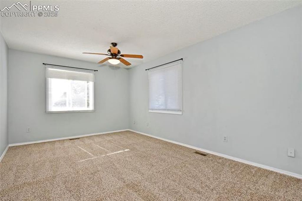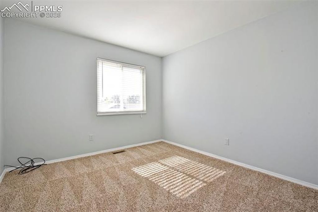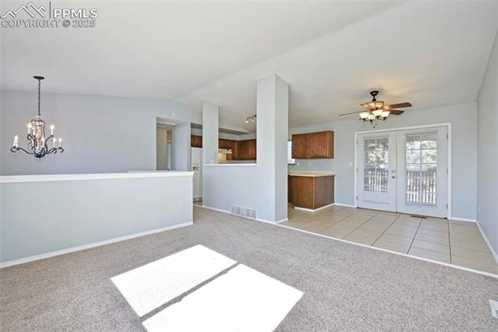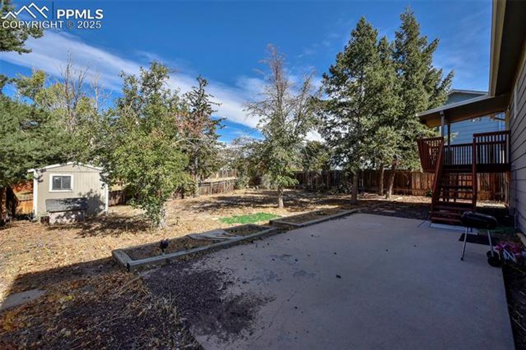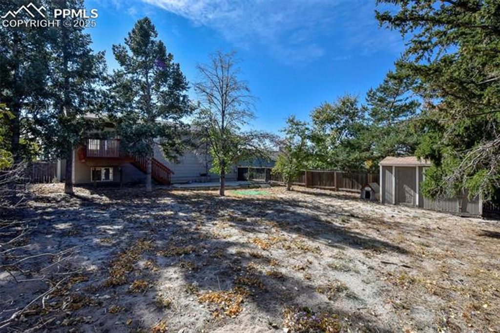 HUGE BACKYARD, located in Academy Schools District D20. This 3 bed, 2 bath, bi-level home has a large, attached 2 car garage. On the upper floor, an open concept kitchen, dining, and living room opens to the elevated deck overlooking the yard. The primary bedroom has a walk in closet and direct access to the shared bathroom. The lower level has a cozy family room with a fireplace and the 3rd bedroom, laundry and 3/4 bath. The large fenced in backyard features a patio, raised garden beds and a storage shed. D20 Schools: Frontier Elementary, Timberview Middle, Liberty High School.