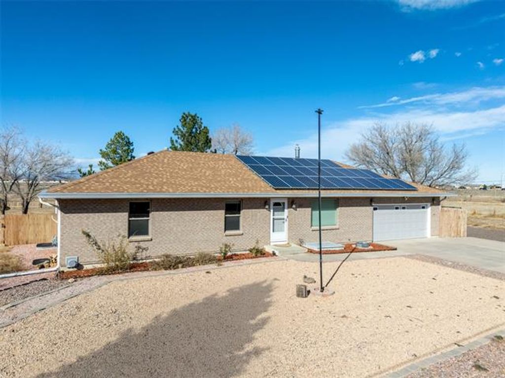 Beautiful brick Pueblo West rancher located minutes from Pueblo, with easy access to Hwy 50, Pueblo Blvd and I-25! Move in ready home is situated on over 2 acres. Inside, you will find updated vinal flooring throughout the main level, a roomy living room with gas fireplace, updated windows letting in lots of light to brighten the mountain views and new paint throughout. Basement includes a large family room with gas fireplace and lots of room for storage. Numerous other upgrades include new roof, new a/c, new water heater, gutters and patio door. Solar system to keep bills down is owned outright. New septic system. Property is a mechanic's dream with 2 car attached garage plus 4+ car detached garage/shop with 30 amp service and lots of RV, boat, etc., storage. Front yard is nicely xeriscaped, back yard is fenced and has a nice covered patio, mature trees and storage shed.
