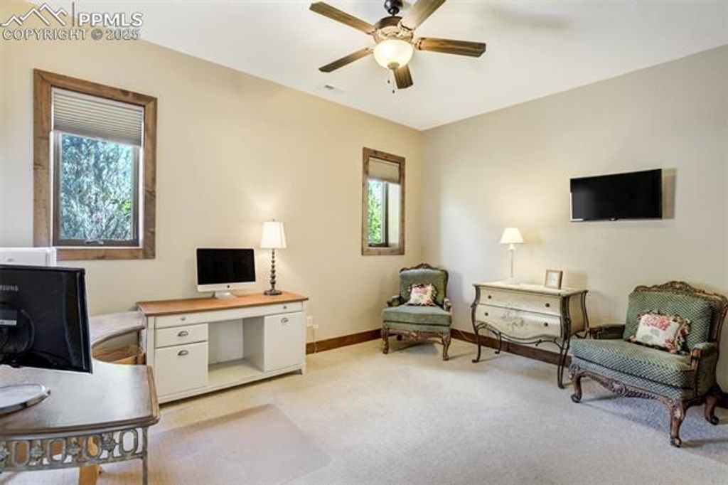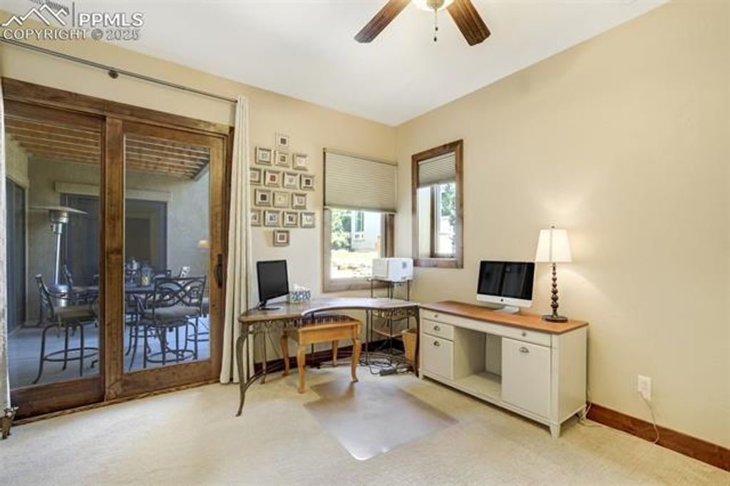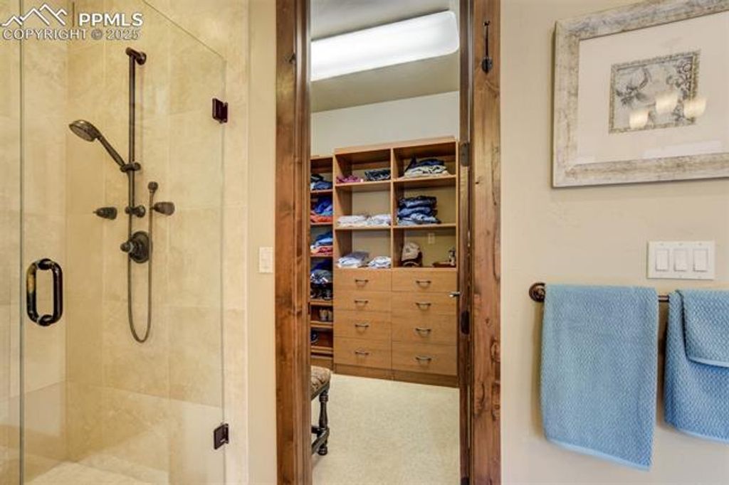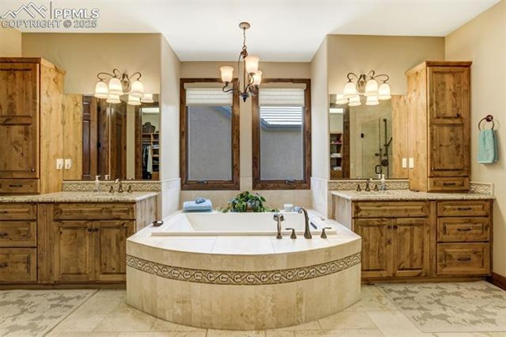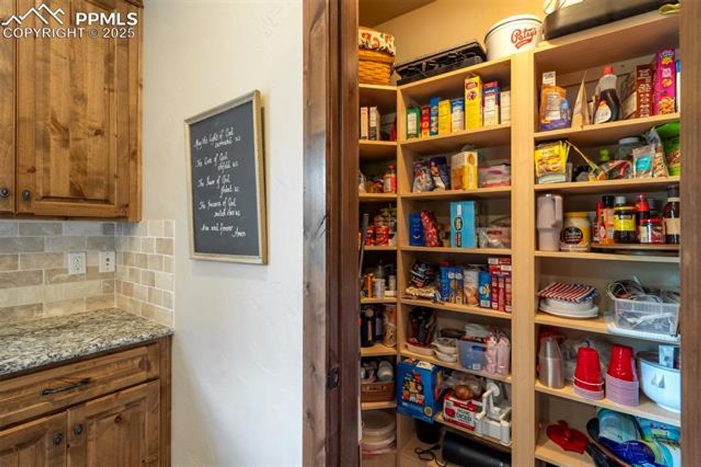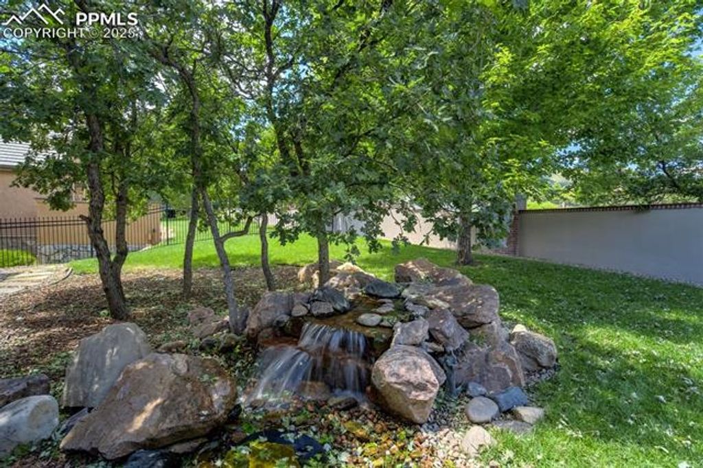 Welcome to a rare gem in the gated community of The Village at Stratton Preserve. Located in the award winning Cheyenne Mountain School District, this custom-built 5-bed, 4-bath home offers over 5,200 square feet of luxurious living space, blending timeless design with modern amenities. The gourmet kitchen features Wolf, Sub-Zero, and Bosch appliances, granite countertops, and custom maple cabinetry, perfect for entertaining or everyday elegance. The main-level primary suite is a private retreat with dual walk-in closets and a spa-inspired five-piece bath with heated floors. A guest suite on the main level provides flexibility for multi-generational living. Enjoy three distinct outdoor spaces, including two fireplaces and a tranquil waterfall feature, all backing to open space and mature trees. The finished basement includes a wet bar, media area, and additional bedrooms. A unique stairway from the garage to the basement adds convenience, and the 3-car garage includes a Level 2 EV charger. HOA-maintained landscaping of both the front and rear yard ensures effortless curb appeal. Located near trails and recreation, this home offers privacy, luxury, and lifestyle in one of Colorado Springs' most desirable neighborhoods