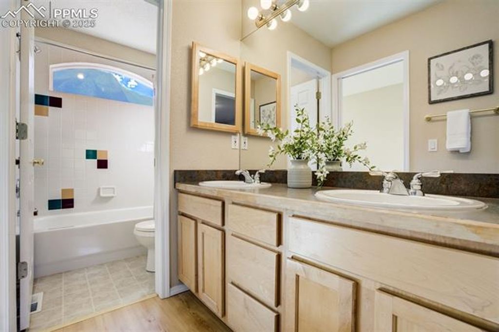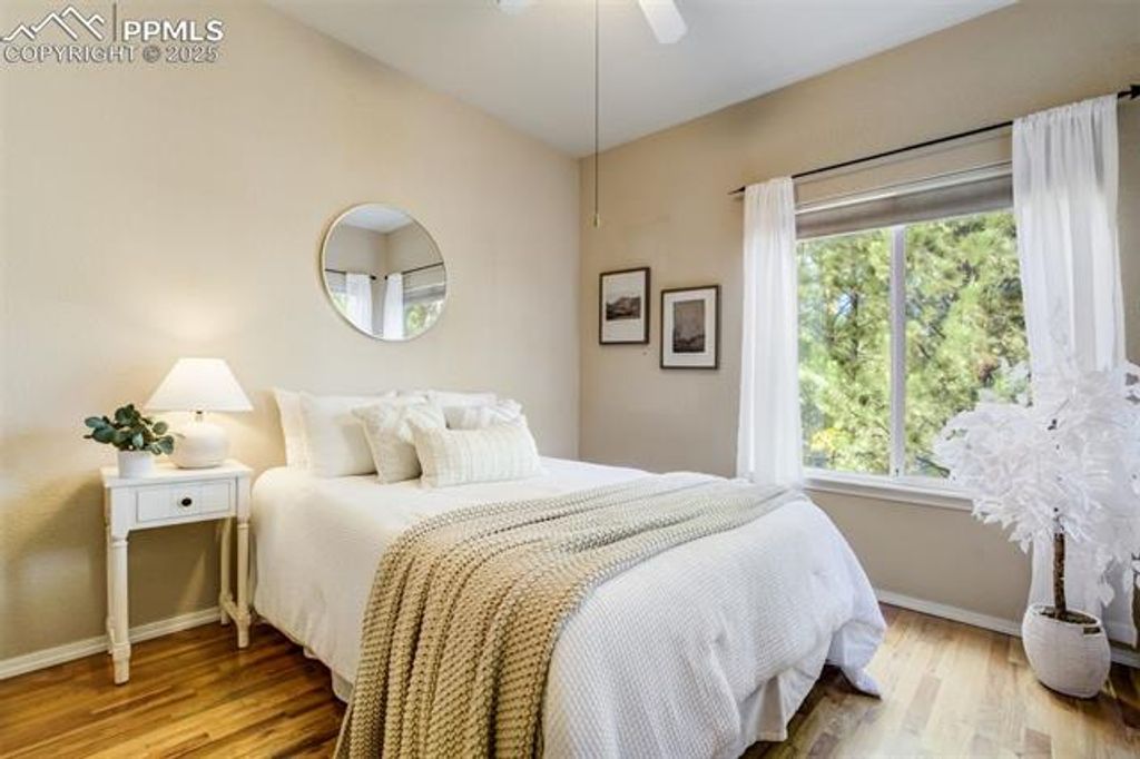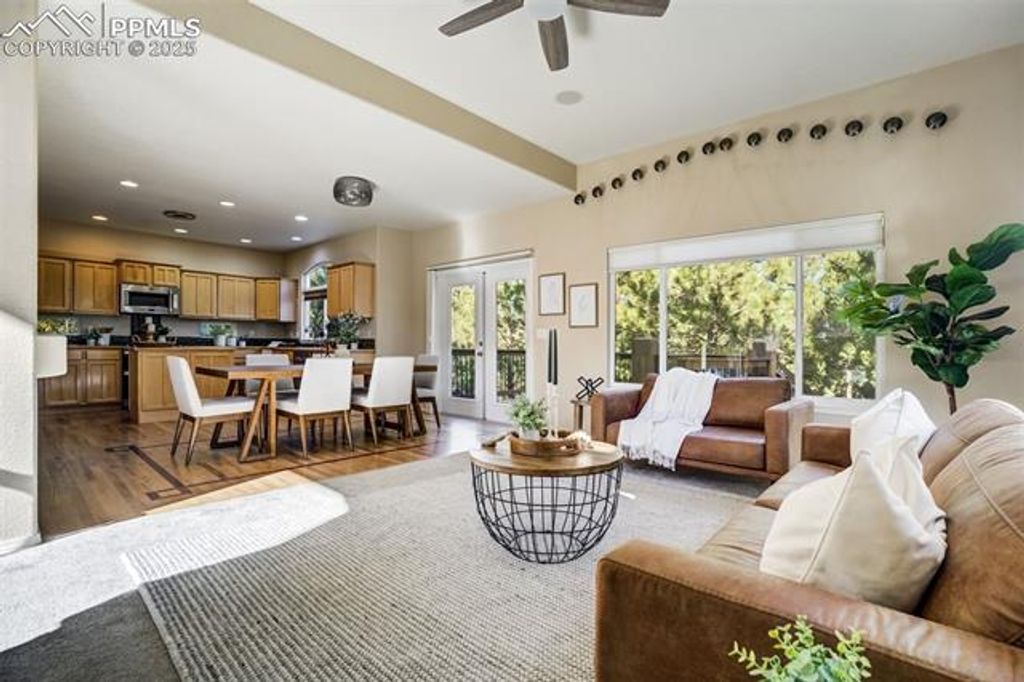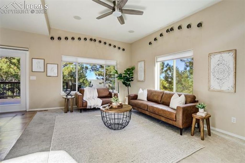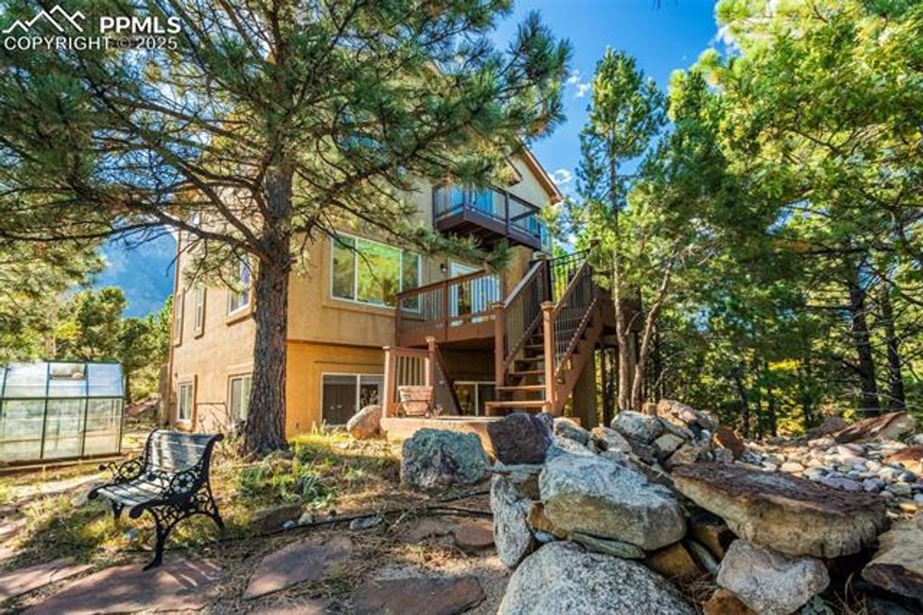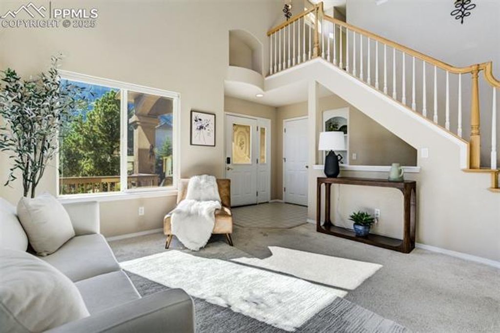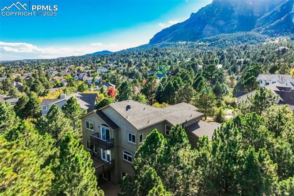Breathtaking Cheyenne Mountain and City Views! Welcome home to this beautiful Saddletree Home in The Spires, ready for your personal touch and design inspiration. The 16' x 10' front porch welcomes you with stunning mountain vistas. Step inside to soaring ceilings as the living room flows seamlessly into the family room with pass through gas fireplace. The dining area opens to a composite deck, perfect for evening sunsets. The kitchen offers abundant cabinet and counter space for the home chef. Counter height windows provide an abundance of natural light. A main-level bedroom provides flexibility for a home office or creative space, and the laundry room and powder bath are conveniently located on this level. Upstairs you'll find two spacious bedrooms, with adjoining four-piece bath. The primary suite features a private 6' x 10' deck with sweeping city views, a generous walk-in closet, and a luxurious five-piece bath with jetted tub. The finished basement level offers incredible versatility "” a large family room that walks out to a 23' x 17' stamped concrete patio with a tranquil pond, two additional bedrooms, and a ¾ bath. With a second laundry area and kitchenette, this space can easily function as a private guest suite or rental opportunity. Outdoor living is exceptional "” enjoy an outdoor sink, greenhouse, and multiple patios that invite you to take in the natural surroundings. A flat driveway landing provides easy access as you enter the oversized 3 car garage. Come experience all this Broadmoor-area gem has to offer "” stunning views, flexible spaces, and endless potential!