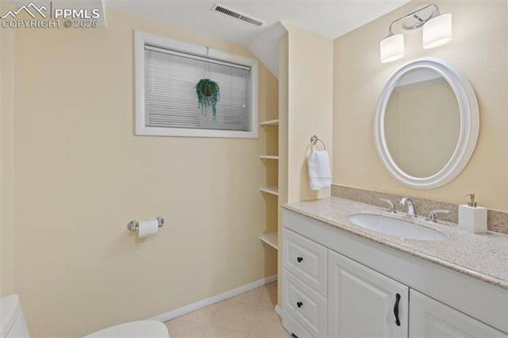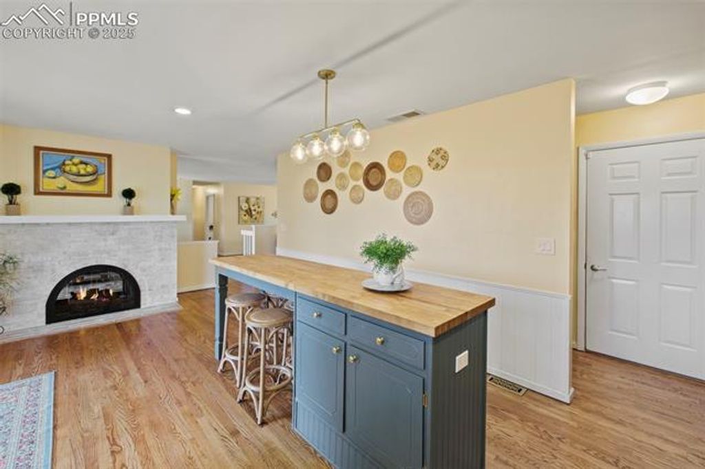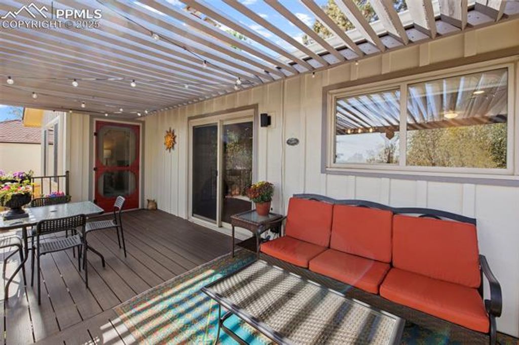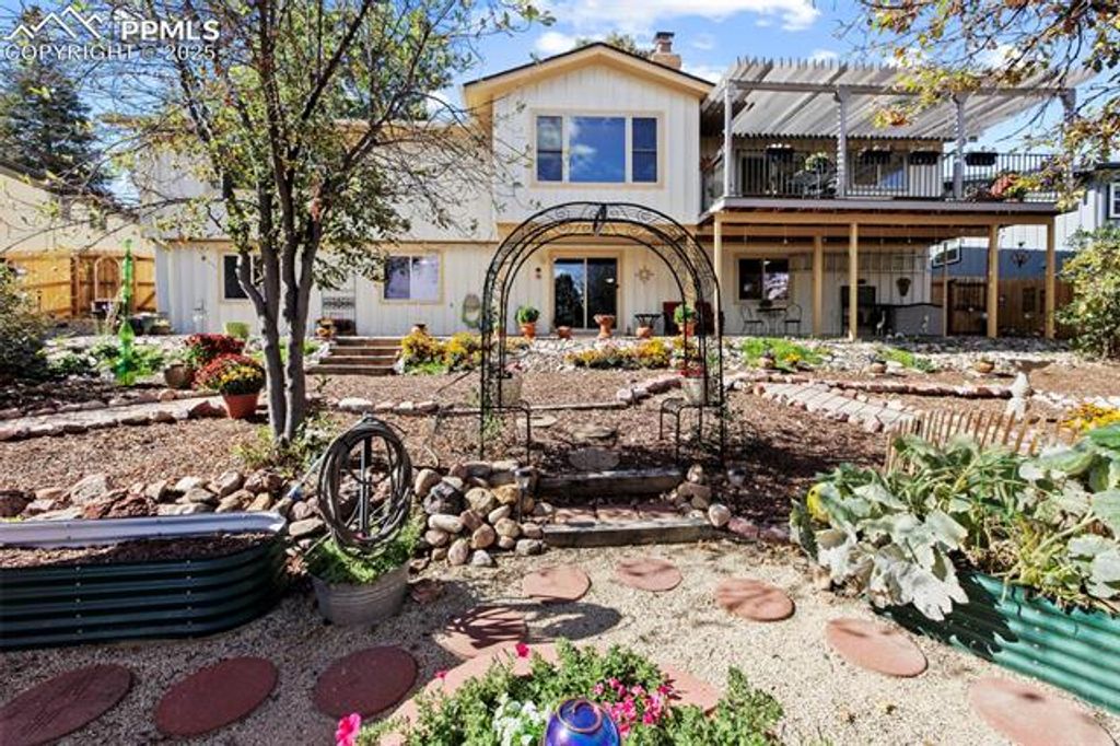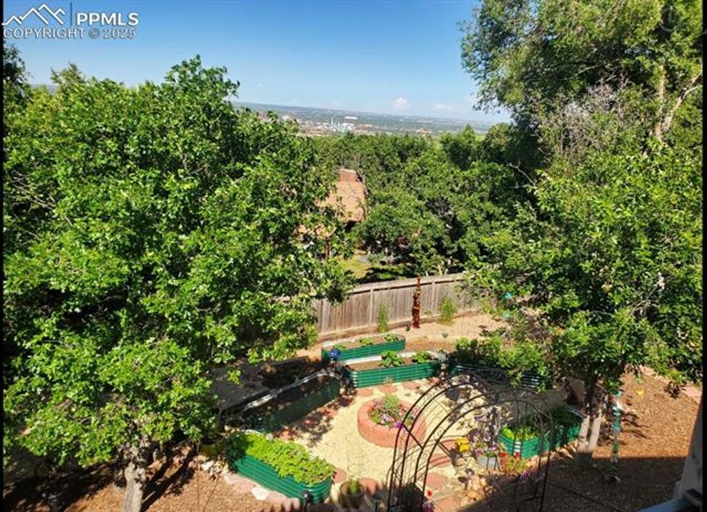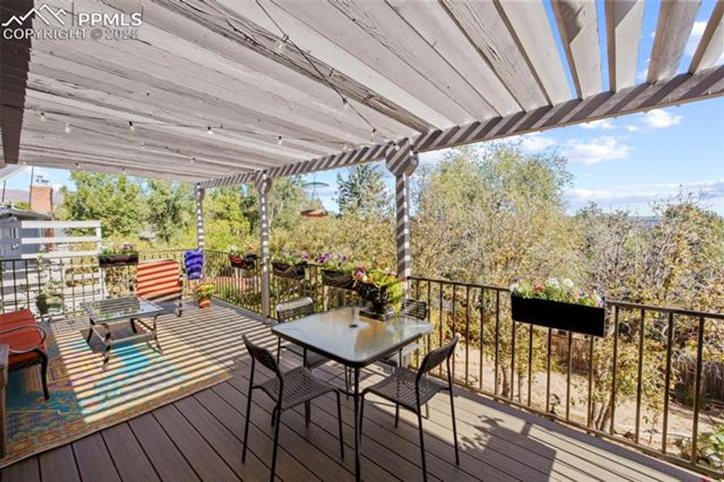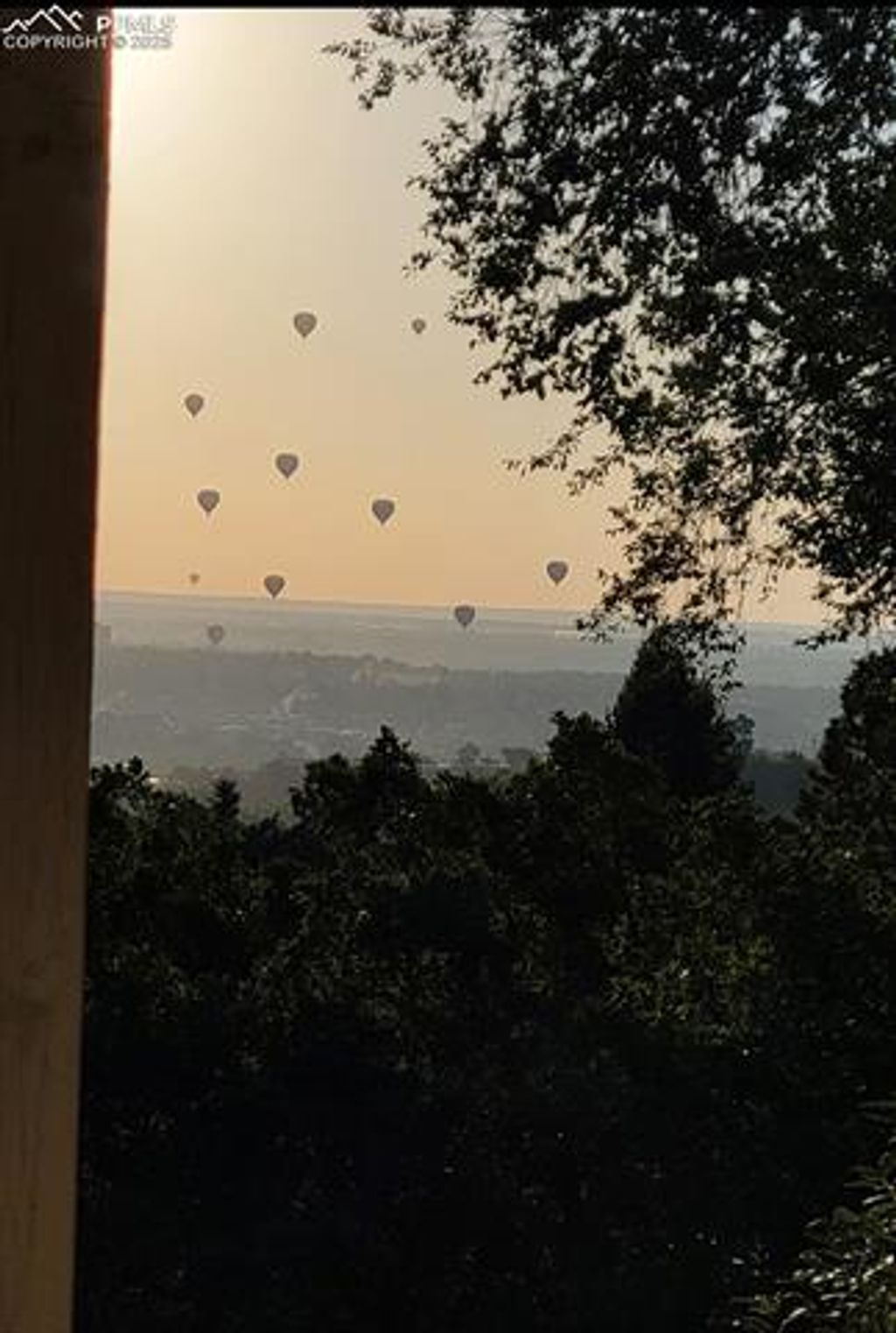 Nestled in the peaceful foothills of Skyway Park and embraced by mature trees for privacy, this one-of-a-kind mid-century rancher offers breathtaking panoramic city views from both upper and lower levels. Located in the award-winning Cheyenne Mountain D12 School District and just minutes from the historic Broadmoor Hotel, Cheyenne Mountain Zoo, and Garden of the Gods, this home delivers mountain serenity with city convenience. Step inside to a light-filled living space where expansive windows frame seasonal scenery and natural light flows across warm wood floors. A double-sided gas fireplace connects the living and dining rooms, and soothing sounds from the in-ground front fountain add to the home's tranquil atmosphere. The expansive kitchen is designed for entertaining with an 8-foot butcher block island, stainless steel appliances, a gas range, dual pantries, coffee station, custom-painted cabinets, and a tile mural backsplash. Walkouts from both the kitchen and living room lead to a low-maintenance composite deck with built-in lighting"”ideal for dining, relaxing, and taking in the views. The spacious main-level primary suite features a large walk-in closet, dual vanities, a jetted tub, walk-in shower, and abundant cabinetry. The walkout basement includes a large family room with a wood-burning fireplace, guest suite with private bath, laundry with folding station and sink, and a flexible bonus space currently used as a gym and art studio"”easily convertible to two bedrooms. The beautifully landscaped backyard includes raised organic garden beds, a newer shed, a lower patio, and ample wildlife watching. Recent updates include a brand-new Class 4 roof, gutter guards, furnace, newer wood flooring, and faux wood laminate on the lower level. With more than 50 miles of trails just outside your door, and an oversized 2-car garage with epoxy floor and workshop space, this home truly has it all.