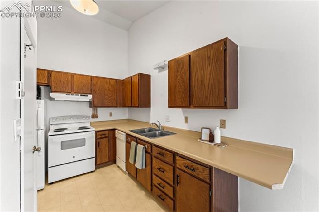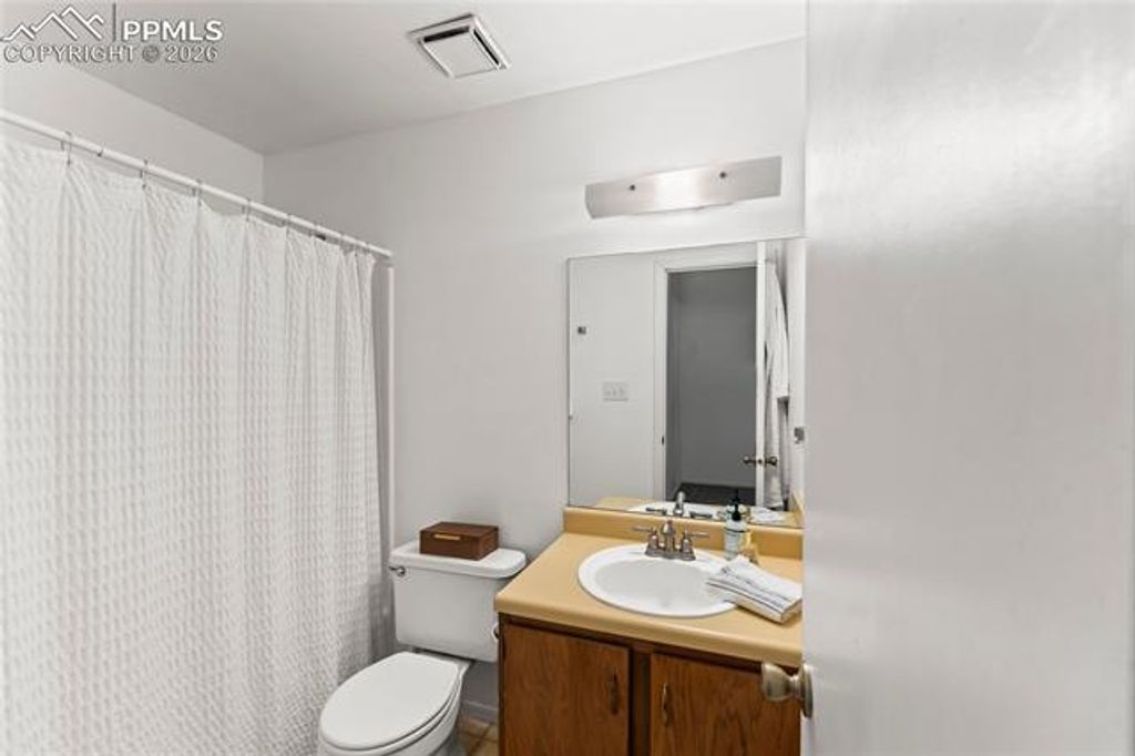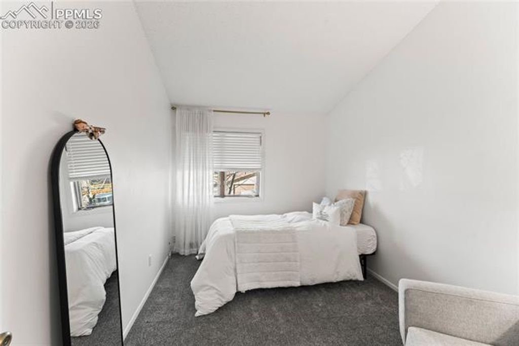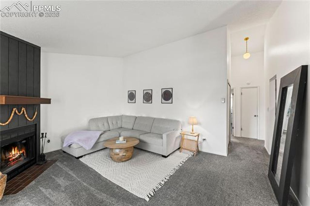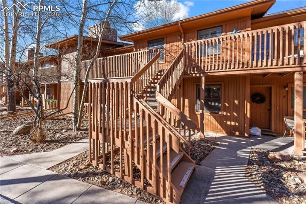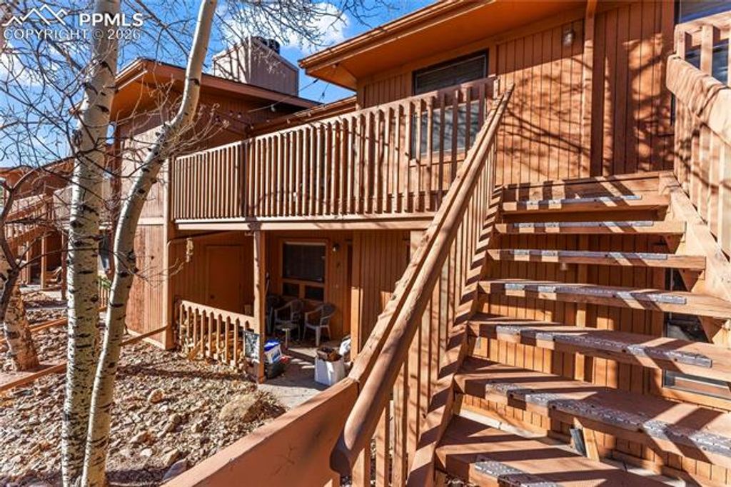 This charming condo with stunning Pikes Peak views is full of potential and ready to be transformed into a truly special retreat. Recently spruced up with fresh paint, the home feels bright, clean, and welcoming from the moment you step inside. The cozy living room features a wood-burning fireplace and flows seamlessly into a generously sized dining area, creating a warm and inviting space to relax or entertain. Just off the dining area is an efficient galley kitchen offering ample counter space, abundant cabinetry, and a pantry for added storage. The spacious primary bedroom includes a wall of closet storage and a private 3/4 bath, while the second bedroom offers a large walk-in closet and easy access to the nearby full hall bath. A conveniently located laundry closet sits just outside both bedrooms. Recent updates include newer plush carpet and a water heater, adding immediate value and comfort. Step out onto the inviting deck to enjoy sweeping views of Pikes Peak and overlook the beautifully maintained common courtyard, complete with mature aspens, grills, and picnic tables. To top it off, the detached garage for this unit is one of the larger garages in the complex"”an added bonus rarely found. This condo is a fantastic opportunity to add your personal touch and create a mountain-inspired home with incredible views.