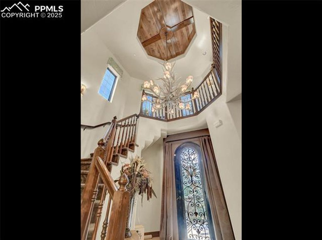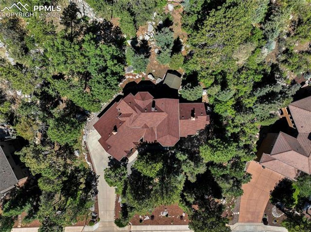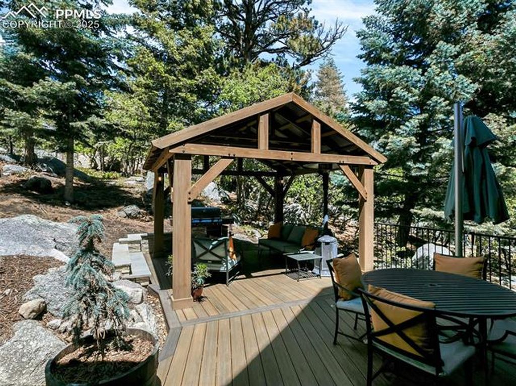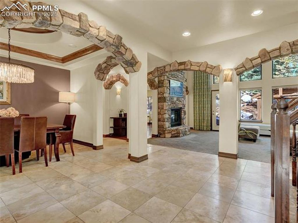 Welcome to this custom home in The Spires Broadmoor on .61 acres. This home feels like a Colorado estate nestled in a wooded environment of pines, boulders & privacy. The back yard space offers an extraordinary space for entertainment or quiet time under the solid cedar covered gazebo with electricity & grill. The front wrought iron door greets you as it opens to a foyer of travertine floors with a mosic in-lay, antler chandelier, hand trolled walls & arch ways accented with stone. From the foyer is a formal dining room with coffered wood inlay ceiling. In the living/great room the ceiling & windows soar to a 20' height adjoining the beamed ceiling caputring a forested atmosperere. The second floor has 2 beds/1 bath. Gourmet kitchen remodel in 2015 has Brazilian hardwood floors, newer Bosch appliances. The primary bathroom of travertine flooring with mosaic inlays, jetted tub, shower and seperate sinks. Lower level has a bar area, wine rack, additional bedroom/bath, French doors to office with a 2-way fireplace seen from adjacent room with walk out. The lower level theater is complete with leather chairs, speakers and projector. Surround speakers on the main level kitchen, living room bedroom & outside. All interior doors are solid wood. All closets have built in drawer sets. Lower level roof has gutter guards. Home includes sprinkler system, recirculation hot water for master bath, 3 car+garage for storage or workshop. Hot & cold water in garage with coated floors, heating. Laundry room is large with ample cabinetry, travertine flooring & quartz counter tops. Ethernet wired & centralized Unifi enterprise router gateway, POE wired cameras, built in Wi-fi boxes. 2020 furnace and humidifier. Extras: Security cameras, outdoor umbrella, built in BBQ. Basement server and camera wired & ring bell. Cinema beamer, sound receiver & speakers, all on site appliances, garage work desk & shelves. 4 kitchen barstoods, glass dining table, 1 bench & 2 dining chairs plus more.
