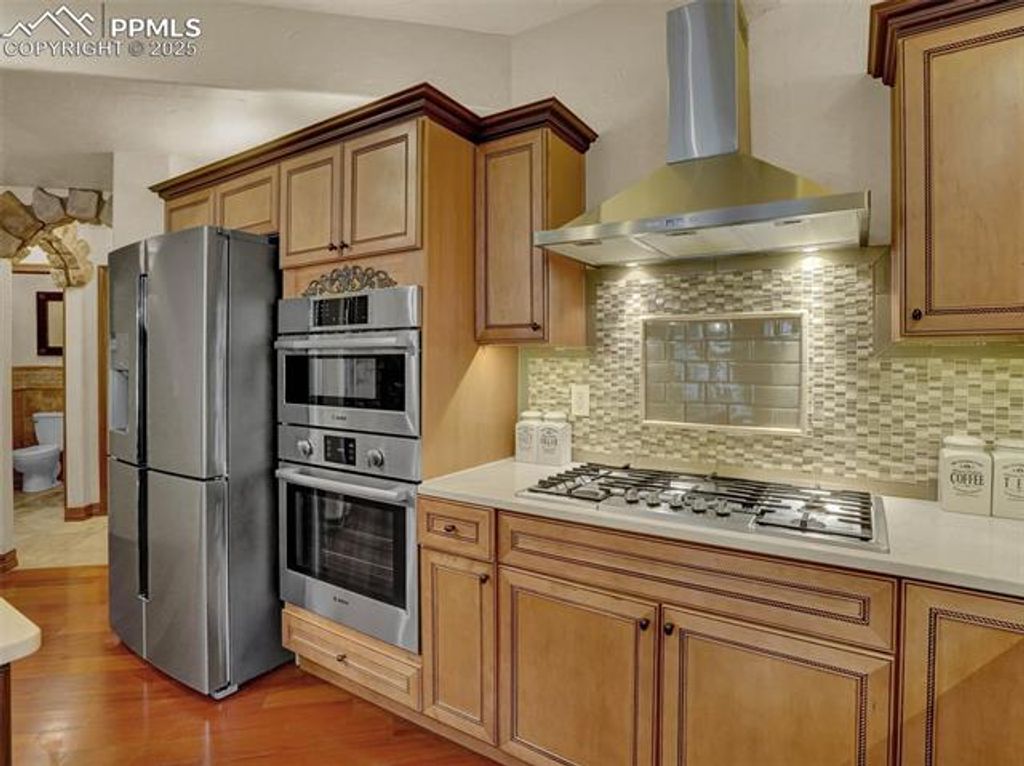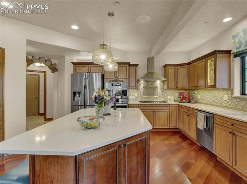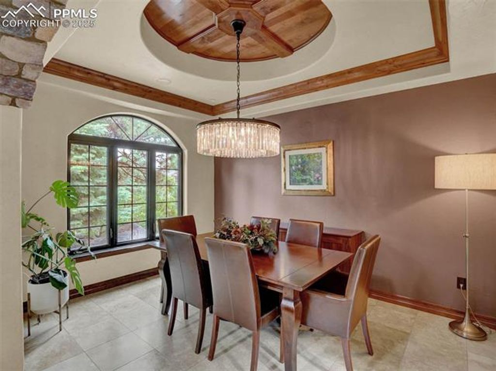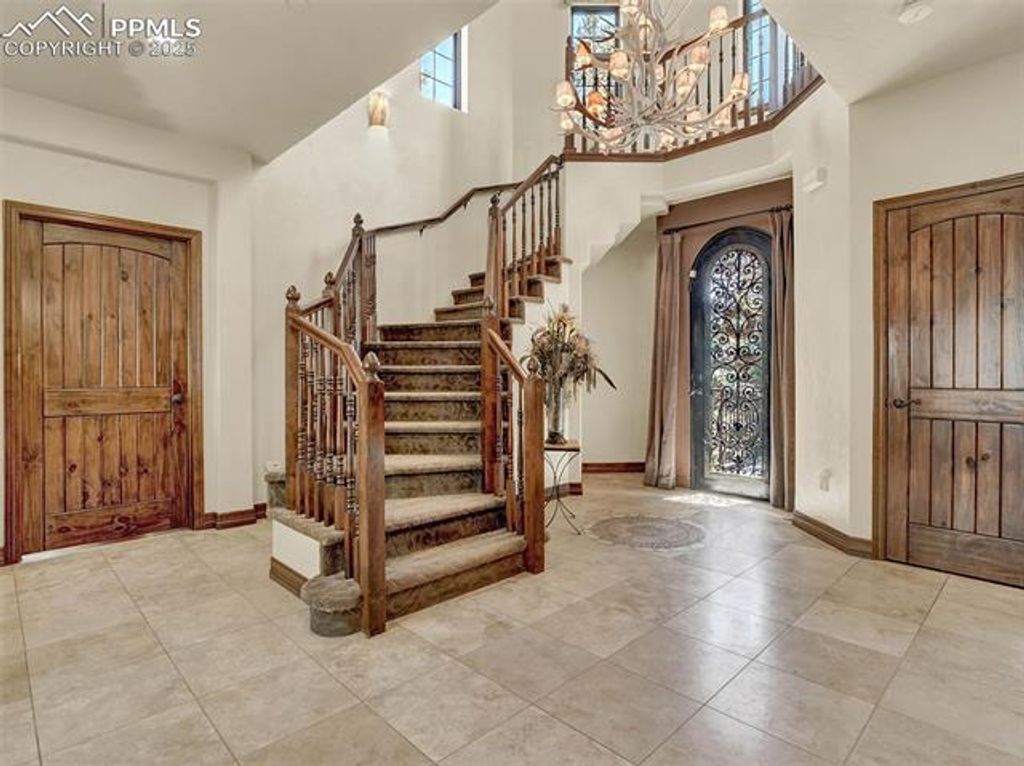 Welcome to this custom home in The Spires Broadmoor on .61 acres. This home feels like a Colorado estate nestled in a wooded environment of pines, boulders & privacy. The back yard space offers an extraordinary space for entertainment or quiet time under the solid cedar covered gazebo with electricity & grill. The front wrought iron door greets you as it opens to a foyer of travertine floors with a mosic in-lay, antler chandelier, hand trolled walls & arch ways accented with stone. From the foyer is a formal dining room with coffered wood inlay ceiling. In the living/great room the ceiling & windows soar to a 20' height adjoining the beamed ceiling caputring a forested atmosperere. The second floor has 2 beds/1 bath. Gourmet kitchen remodel in 2015 has Brazilian hardwood floors, newer Bosch appliances. The primary bathroom of travertine flooring with mosaic inlays, jetted tub, shower and seperate sinks. Lower level has a bar area, wine rack, additional bedroom/bath, French doors to office with a 2-way fireplace seen from adjacent room with walk out. The lower level theater is complete with leather chairs, speakers and projector. Surround speakers on the main level kitchen, living room bedroom & outside. All interior doors are solid wood. All closets have built in drawer sets. Lower level roof has gutter guards. Home includes sprinkler system, recirculation hot water for master bath, 3 car+garage for storage or workshop. Hot & cold water in garage with coated floors, heating. Laundry room is large with ample cabinetry, travertine flooring & quartz counter tops. Ethernet wired & centralized Unifi enterprise router gateway, POE wired cameras, built in Wi-fi boxes. 2020 furnace and humidifier. Extras: Security cameras, outdoor umbrella, built in BBQ. Basement server and camera wired & ring bell. Cinema beamer, sound receiver & speakers, all on site appliances, garage work desk & shelves. 4 kitchen barstoods, glass dining table, 1 bench & 2 dining chairs plus more.