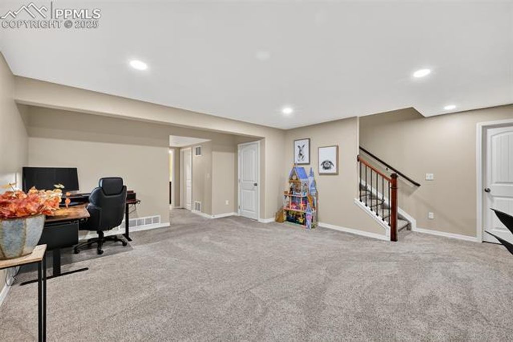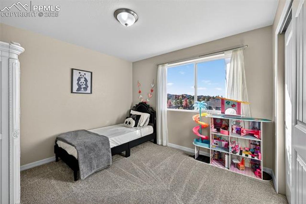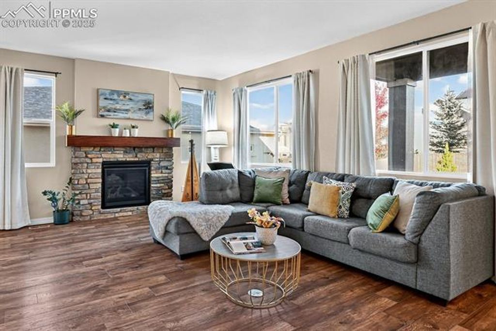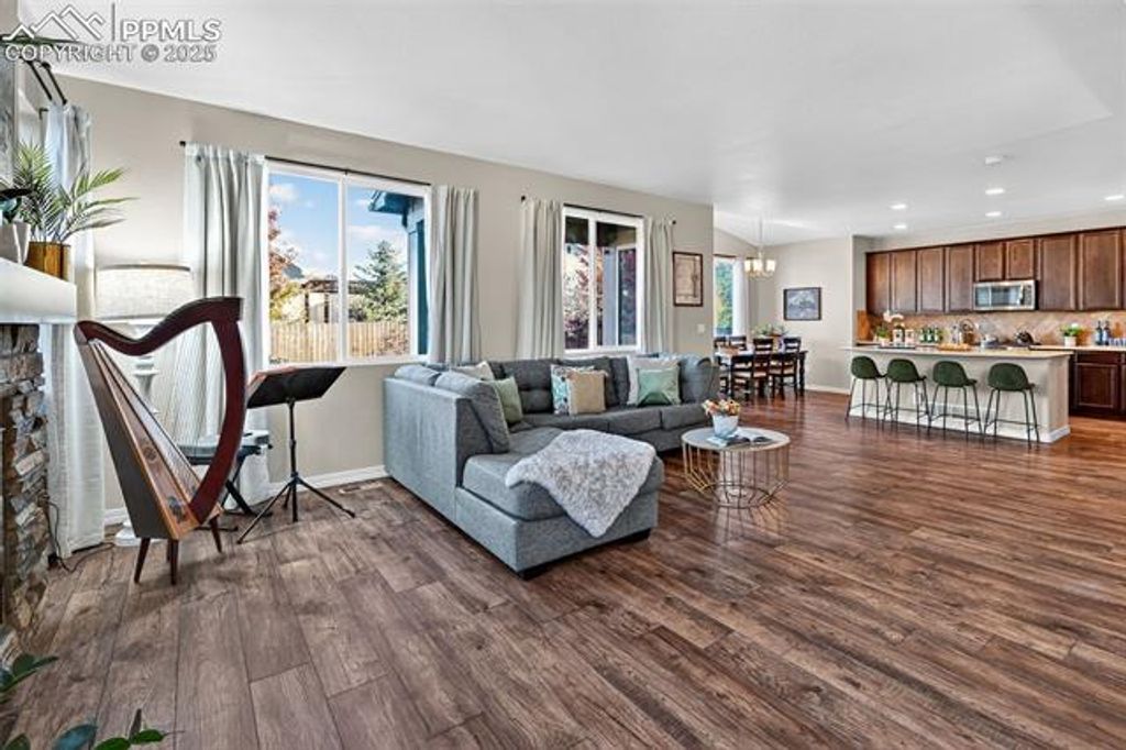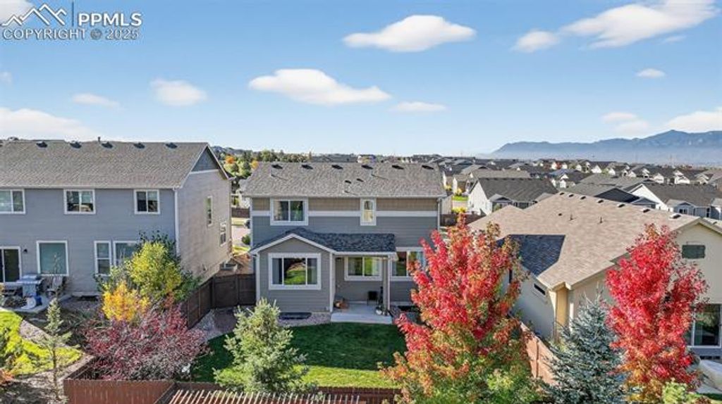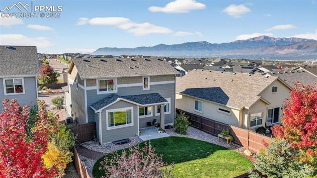 Located less than 100' from Encompass Heights Elementary: one of the newest cutting-edge schools in the award-winning D20 School District. You can feel the pride of ownership the moment you arrive. From the front porch enjoy a front row seat to Pikes Peak and majestic front range views.Beau tifully landscaped with roses, lilacs, raspberries, blackberries, grapes, lime tree, strawberries, Chinese lilies & MORE! Enter the open floor plan featuring a wall of windows that fills the space with natural light, and gleaming LVP wood flooring. Cozy stone fireplace with wood mantel is a highlight of this space. Half bath on this level includes beautiful tile floor & quartz counter. Kitchen boasts quartz counters, gas stove, oversized island, plenty of cabinet space, generous walk in pantry & tile backsplash! Fully fenced, meticulously maintained & private backyard is a sanctuary with extended covered back patio, mature shade trees & raised garden beds. Up the iron spindle stairs, you will find views of the front range from the vaulted eyebrow windows. Master retreat with attached bath features gorgeous shower tile with bench, stacked stone backsplash, quartz counters, dual vanity & walk-in closet. Two additional bedrooms, full bath & conveniently located laundry complete this level, with views of the front range from the front bedrooms. Downstairs is bright with plenty of space & storage. Highlights include: oversized recreation room, 4th bedroom for guests & full bathroom. Smart Thermostat, Fiber Optic & Cat 5, insulated garage door, Brand New carpet with upgraded pad and pet barrier, modern electrical panel with plenty of space to power future projects. Highly coveted North Fork neighborhood with Mushroom pocket Park, is perfectly situated near main arteries getting you quickly to Peterson, Schriever, and Air Force Academy. Less than 5 min from Children's Hospital, Memorial North Hospital, St Francis Hospital, Pikes Peak College, parks, trails, restaurants, shopping & MORE!