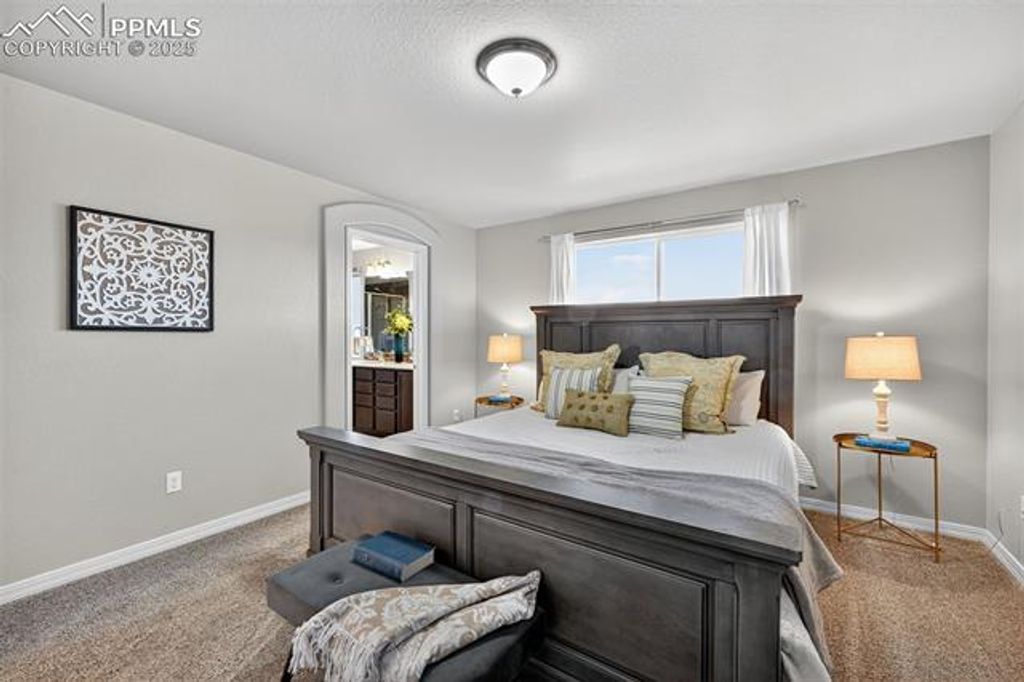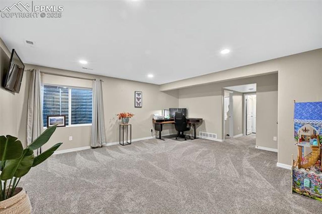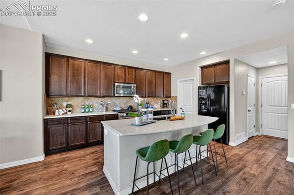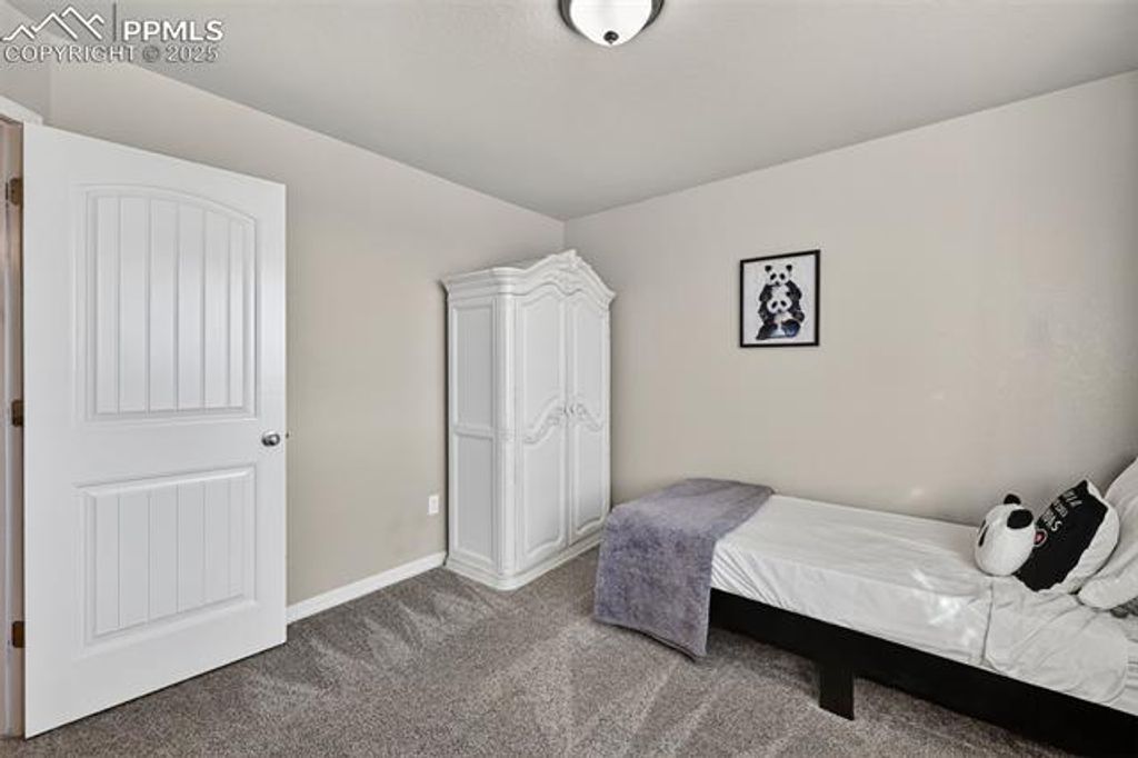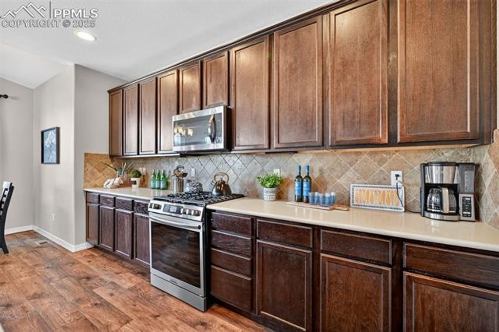 Located less than 100' from Encompass Heights Elementary: one of the newest cutting-edge schools in the award-winning D20 School District. You can feel the pride of ownership the moment you arrive. From the front porch enjoy a front row seat to Pikes Peak and majestic front range views.Beau tifully landscaped with roses, lilacs, raspberries, blackberries, grapes, lime tree, strawberries, Chinese lilies & MORE! Enter the open floor plan featuring a wall of windows that fills the space with natural light, and gleaming LVP wood flooring. Cozy stone fireplace with wood mantel is a highlight of this space. Half bath on this level includes beautiful tile floor & quartz counter. Kitchen boasts quartz counters, gas stove, oversized island, plenty of cabinet space, generous walk in pantry & tile backsplash! Fully fenced, meticulously maintained & private backyard is a sanctuary with extended covered back patio, mature shade trees & raised garden beds. Up the iron spindle stairs, you will find views of the front range from the vaulted eyebrow windows. Master retreat with attached bath features gorgeous shower tile with bench, stacked stone backsplash, quartz counters, dual vanity & walk-in closet. Two additional bedrooms, full bath & conveniently located laundry complete this level, with views of the front range from the front bedrooms. Downstairs is bright with plenty of space & storage. Highlights include: oversized recreation room, 4th bedroom for guests & full bathroom. Smart Thermostat, Fiber Optic & Cat 5, insulated garage door, Brand New carpet with upgraded pad and pet barrier, modern electrical panel with plenty of space to power future projects. Highly coveted North Fork neighborhood with Mushroom pocket Park, is perfectly situated near main arteries getting you quickly to Peterson, Schriever, and Air Force Academy. Less than 5 min from Children's Hospital, Memorial North Hospital, St Francis Hospital, Pikes Peak College, parks, trails, restaurants, shopping & MORE!