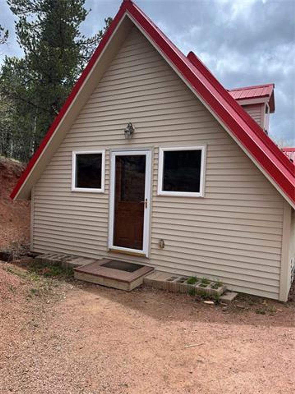 This sweet adorable Chalet style home sits up above the road nestled in the aspen and pine trees offering some GRAND views and a bit of privacy! This home has NEW paint of exterior trim and all of the interior , sports a metal roof , vinyl siding and windows and a Trex deck ! Deck expands the living area right off the living room and a GREAT place to enjoy the view and wonderful Colorado fresh air! You'll find a nice chain link pen for pets (and or kids? garden?)right off the back deck. Entering through the back of the house is the "other room" with some built in cabinets and laundry area! Super area for added sleeping area, office, crafts or just whatever your imagine can see! Main level bed and bath off the hallway leading to kitchen with pantry and Water heater closet and then into the large Livingroom (with dining area) sporting a wood stove to take the chill off & cut down on those heating bills! Livingroom also has a ceiling fan and lots of windows for big open brightness.. Up the stairs is an open loft /bedroom(no closet) with dormer windows and a little landing overlooking living room could sport a desk or reading chair or??? With some new flooring ( BEING INSTALLED NEXT WEEK) this place will be a GREAT short or full time home! Cripple Creek Mountain Estates offers a Club House with indoor pool , exercise room loaded with equipment and playground for you and your guests use! You're just a few miles from historic town of Cripple Creek for lots of dining and diverse entertainment and shopping! And then your less then an hour into Woodland Park for even more shopping and dining with Divide and Florissant offering a little of all on your way.. Come check it out...