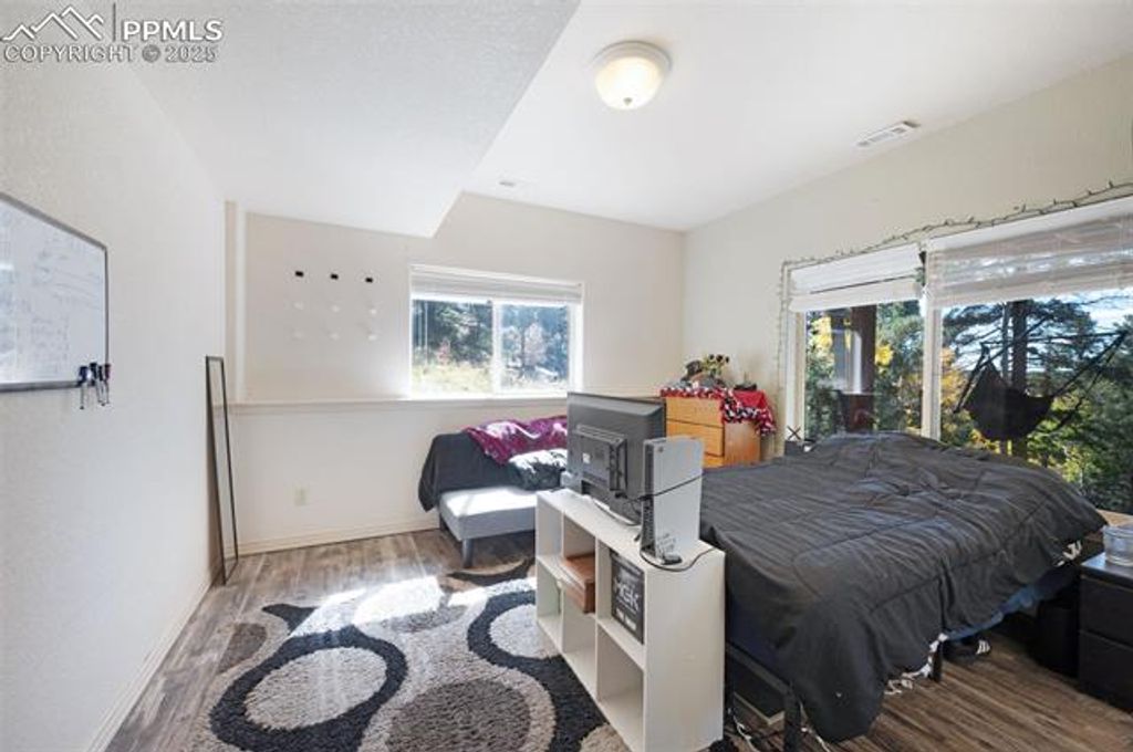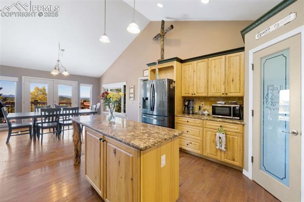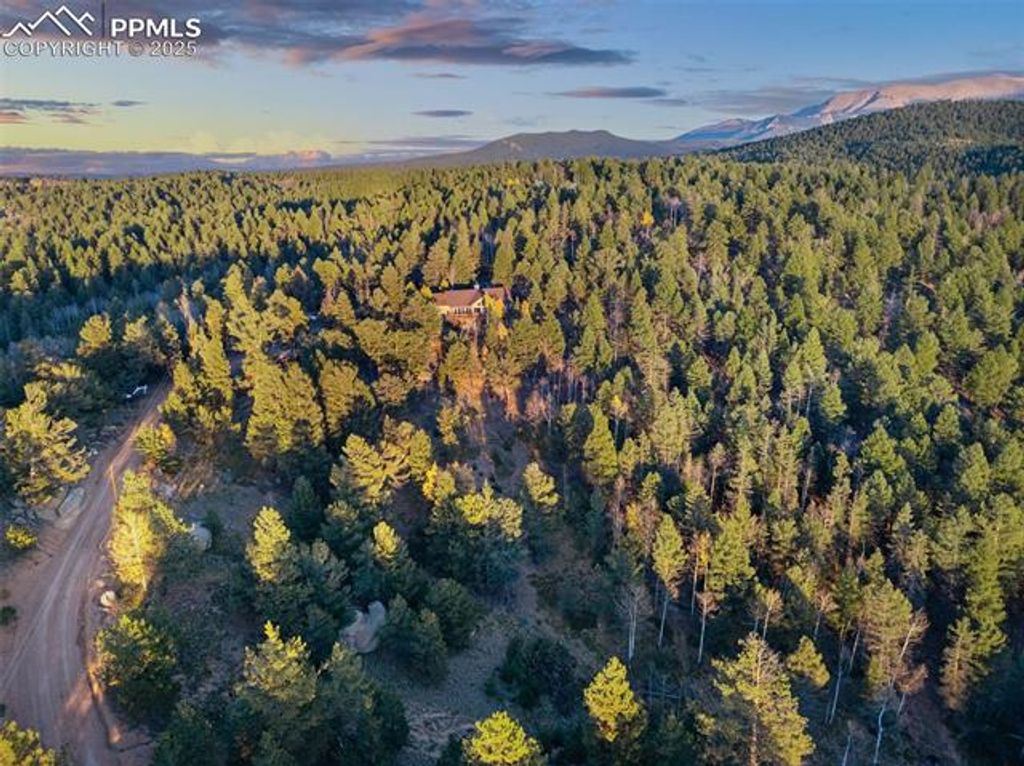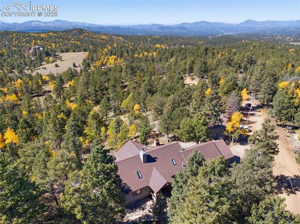 Discover your ultimate mountain retreat on 35 private acres just 15 minutes from Divide, CO. This expansive ranch home sits on a private road and is zoned A1, making it ideal for horses, toys, and outdoor adventures. Vaulted log beam ceilings, oak hardwood floors, and a cozy fireplace anchor the beautifully appointed main living area. The light-filled, open-concept design seamlessly connects the living, dining, and kitchen areas, while a wall of windows and a large west-facing deck attached to the primary suite provide sweeping mountain views and unforgettable sunsets. The gourmet kitchen features granite countertops, wood cabinetry, a center island, pantry, and butler's pantry, offering abundant storage and the perfect space for meal prep. The main-level primary suite boasts walk-out deck access, an adjoining bathroom, and a generous walk-in closet. Downstairs, custom banisters and river rock stairs lead to a spacious family room with a wood-burning stove that opens to a lower patio with a hot tub and a custom stone outdoor fireplace"”perfect for entertaining. Three additional bedrooms, a full bath with double vanity and shower/tub combo, and a convenient laundry area round out the lower level. Outside, the property offers a mix of open pasture and forested land across the road, allowing for horses and plenty of recreational space. A fully functional chicken coop is one of several well-maintained outbuildings, adding charm and utility to this mountain homestead. There's also a 100-yard shooting range, a greenhouse, trails for hiking or off-road exploration, a disc golf course, and a children's playground area, making it a true outdoor enthusiast's paradise. Ample vehicle and toy storage includes an attached oversized 2-car garage, two detached 2-car garages, and additional sheds. Secluded yet accessible, this mountain haven blends rustic charm with modern comforts.