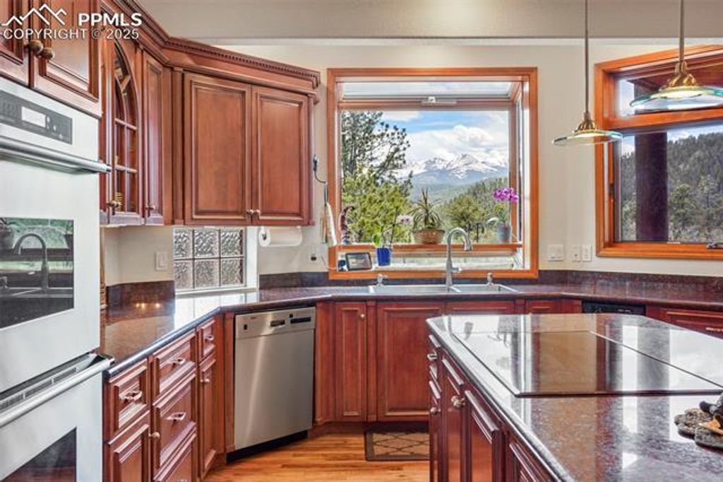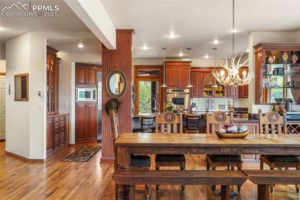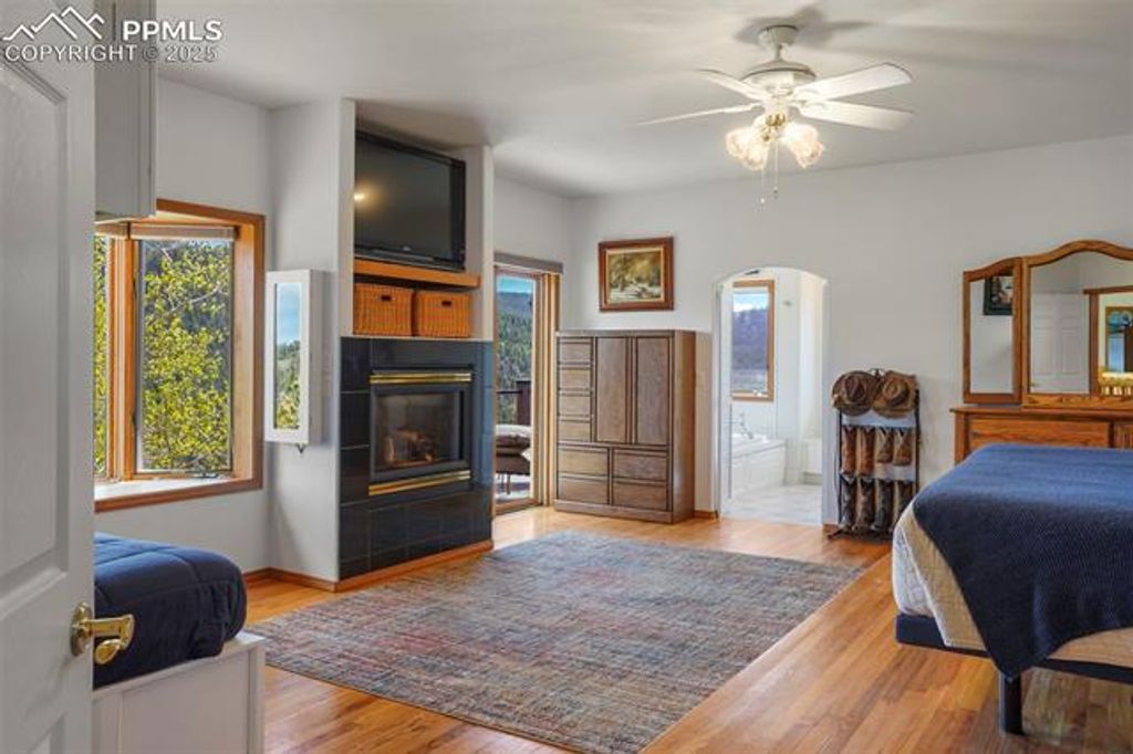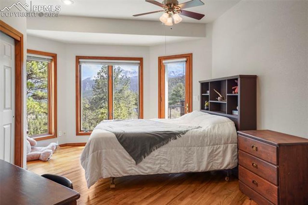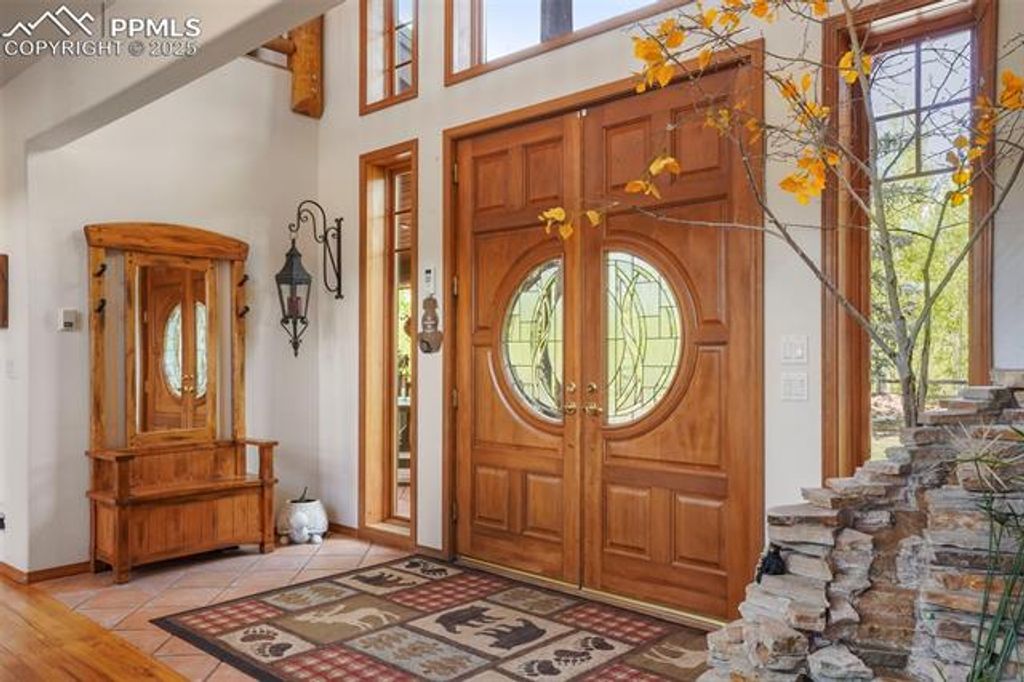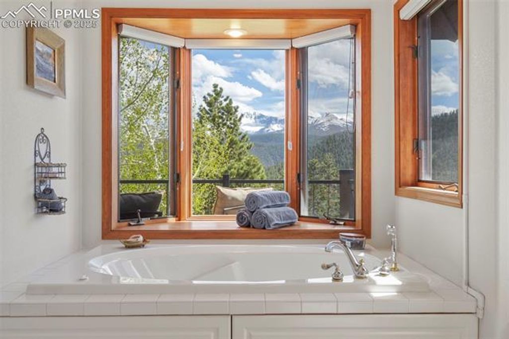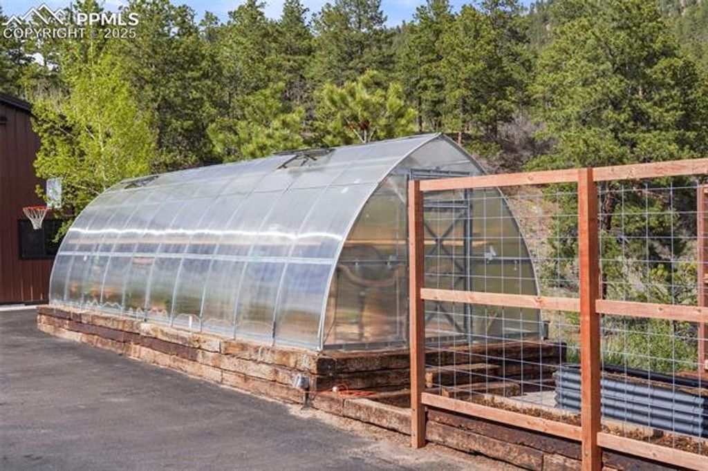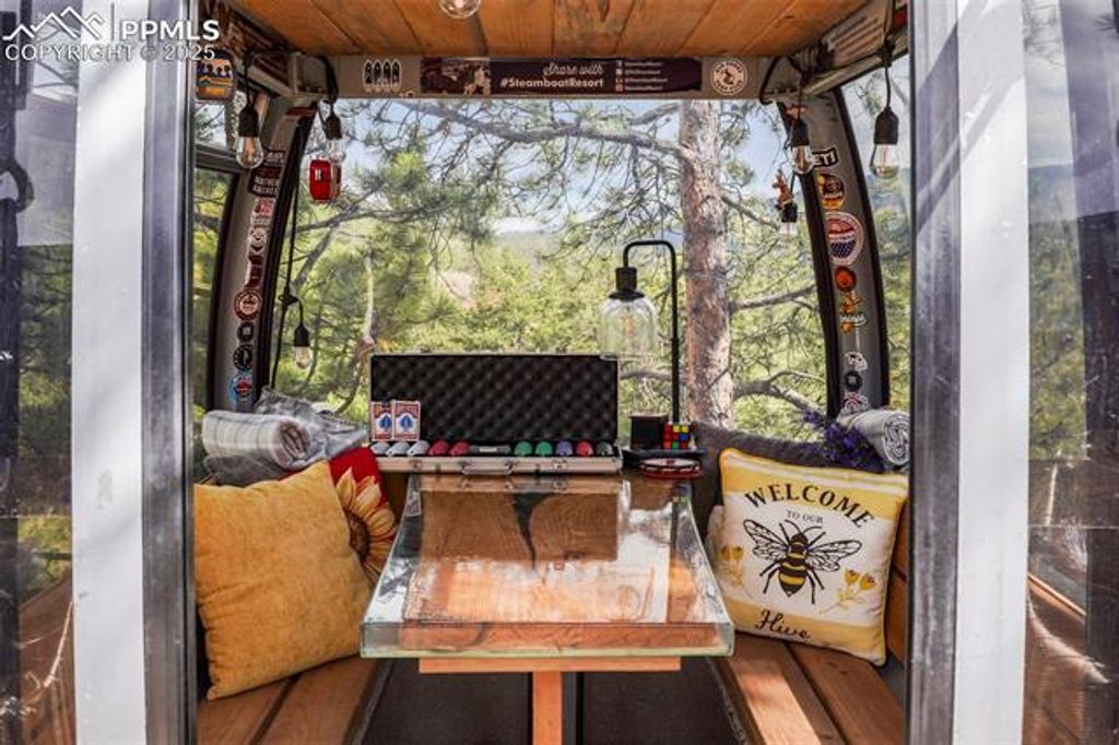 Situated on 3.02-acres, within the city limits of Woodland Park, CO this stunning estate boasts breathtaking views of Pikes Peak and offers private access to the National Forest, perfect for outdoor enthusiasts. Conveniently located just minutes from all modern amenities, this home offers a peaceful atmosphere. The centerpiece of the property is a beautiful 5,497 square foot mountain lodge-style home featuring six bedrooms and six bathrooms that provides ample space and comfort. The residence was thoughtfully designed to maximize the panoramic mountain vistas from nearly every room. The heart of the home boasts soaring cathedral ceilings in the great room with charming log accents and an inviting fireplace, creating a welcoming atmosphere. The gourmet kitchen is sure to impress even the most discerning chefs. The home provides two master suites and a guest suite. The main floor master suite is currently utilized as a recreation and game room. This portion of the home includes a five-piece bath, walk-in closet, an bedroom/office and dedicated workout room. The second floor hosts the second primary suite, 2 additional bedrooms with attached bathrooms and walk-outs to deck space, and a quiet office. The guest suite contains a convenient kitchenette, dedicated bathroom, small study, and a bedroom with access to a deck rounds out the second floor. Outdoor highlights include a newly added and custom-designed 36x64 heated RV shop/garage, a Planta greenhouse, a resort-style fire pit, and large swim spa. Adding a touch of charm, is a creatively repurposed gondola from Steamboat Springs Ski Resort, providing a memorable hangout spot. This combination of characteristics is extremely rare in the Woodland Park market. Colorado Springs is a short fifteen minute drive to the east, and the Colorado Springs Airport is easily accessible within a forty-five-minute drive. Recreation abounds here as this is a vacation destination. This is a truly exceptional Colorado estate!