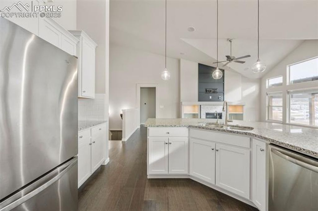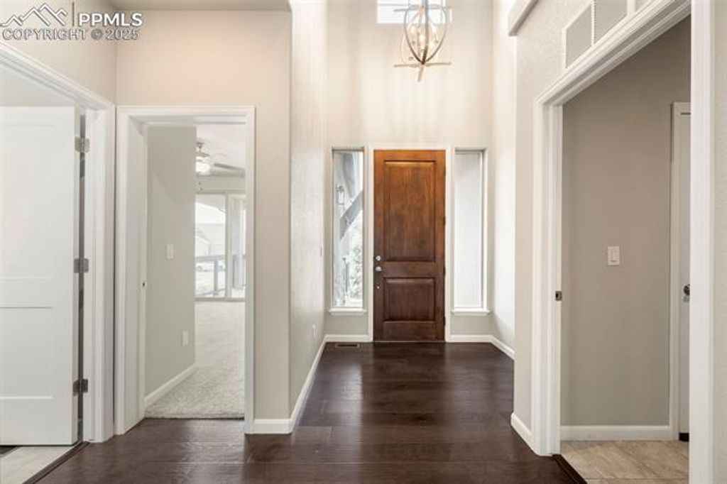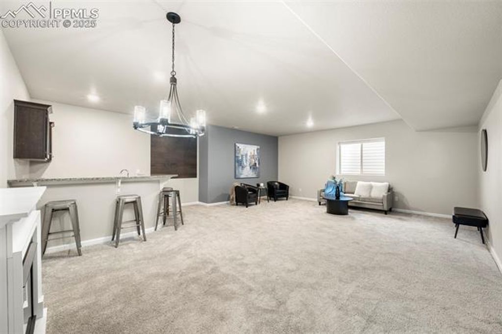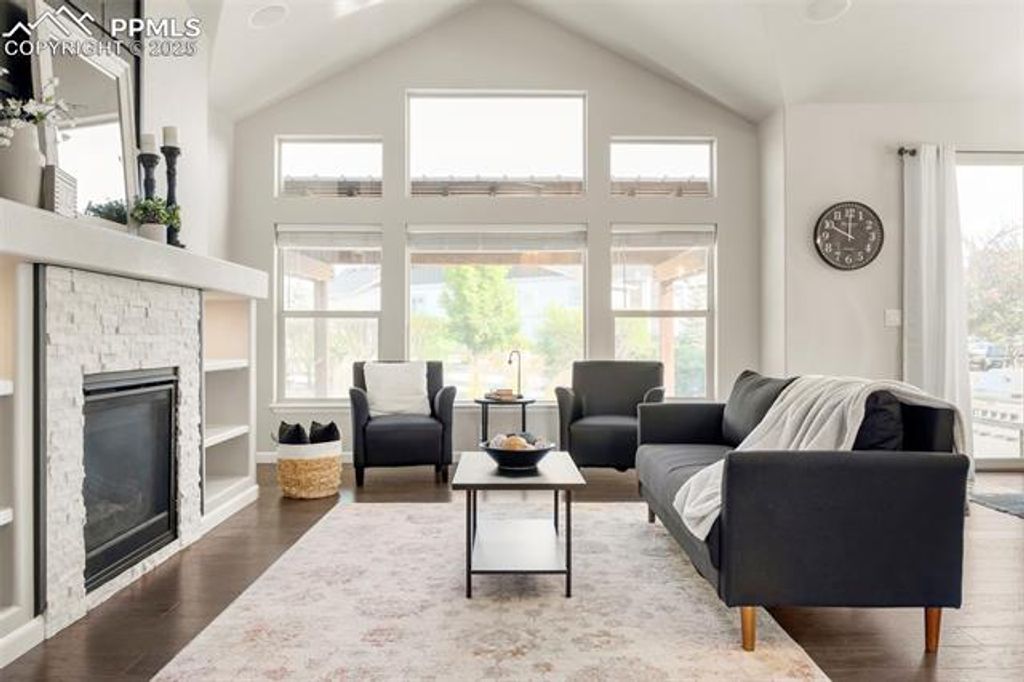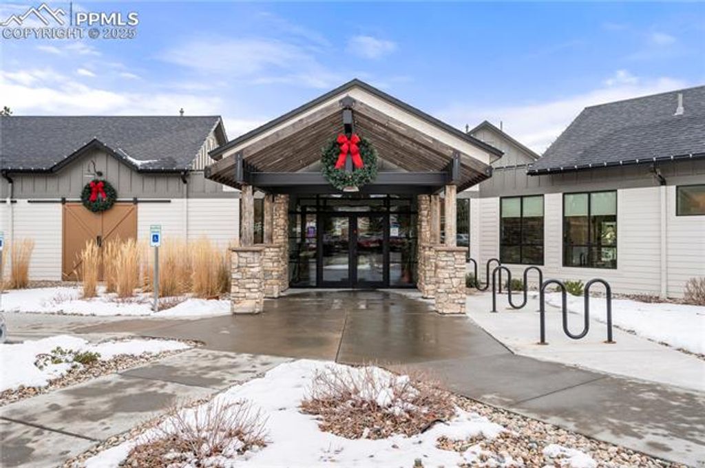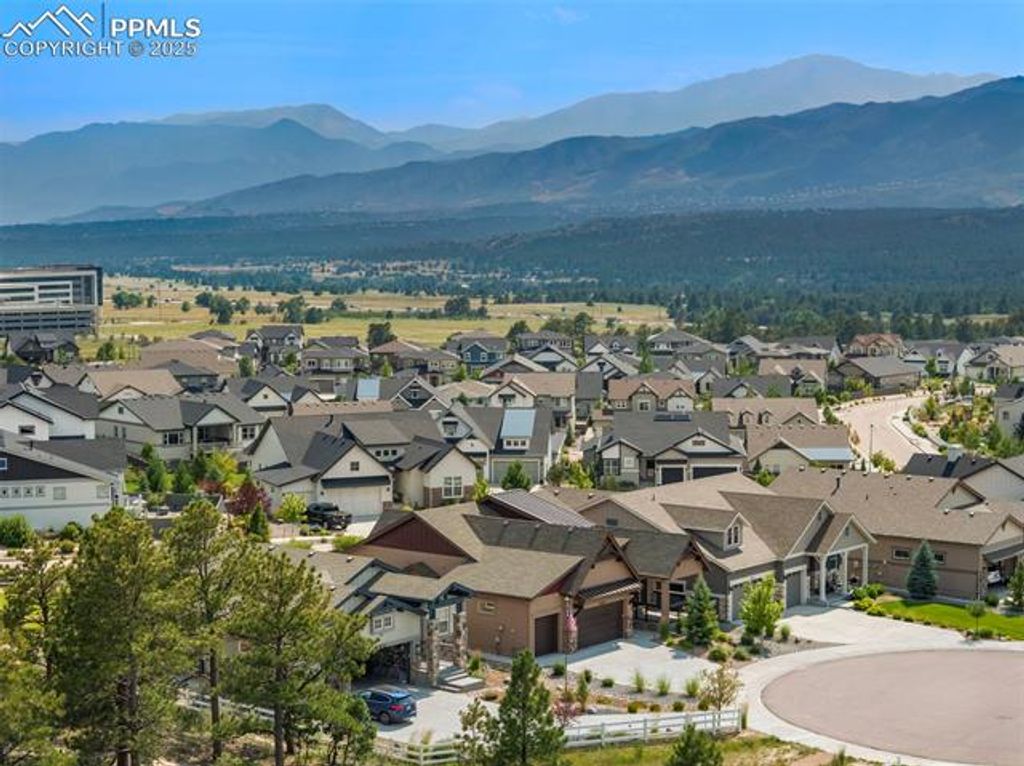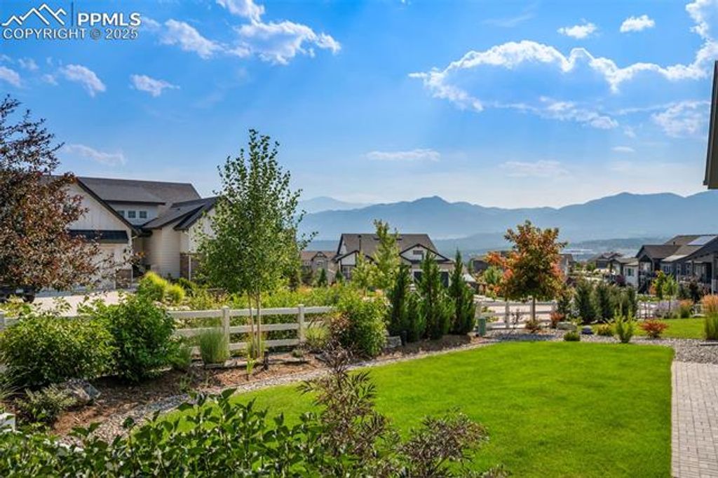 Welcome to a thoughtfully upgraded and move-in ready home offering privacy, stunning mountain views, and exceptional outdoor living in the highly sought-after Farm at Northgate & D-20. With five bedrooms and three bathrooms, this home blends modern comfort with purposeful design across two spacious levels. Rate incentive buydown available. A custom 12'x12' covered front patio addition adds charm and privacy, creating the perfect spot for a quiet retreat or a welcoming guest entrance. Inside, the main level features engineered hardwood flooring, designer lighting, and a spacious great room with vaulted ceilings, a gas fireplace, and built-in surround sound. The gourmet kitchen includes granite counters, premium appliances, soft-close cabinetry, a large island, instant hot water, and a walk-in pantry. Upstairs, the primary suite offers breathtaking views of Pikes Peak and a five-piece bath with frameless glass shower, two shower heads, dual vanities, and a custom walk-in closet. Two additional bedrooms share a full hallway bath, and the upper-level laundry room includes built-in cabinetry and a utility sink for added convenience. The finished basement features 9-foot ceilings, a stylish wet bar, electric fireplace, expansive recreation room, two additional bedrooms, a full bathroom, and a dedicated gym or flex space. Step outside to enjoy the best of Colorado living with a covered pergola, natural gas-connected KitchenAid grill, privacy shades, and an expansive patio overlooking Pikes Peak with direct access to the Compassion Trail and neighborhood path system. Additional highlights include an oversized three-car garage, central air conditioning, and a large outdoor storage shed. Located on a quiet and highly desirable private street in The Farm and walking distance to The Gathering Place, community pool, fitness center, parks, and trails. With quick access to I-25, Interquest, USAFA, and award-winning schools, this home is a must-see.