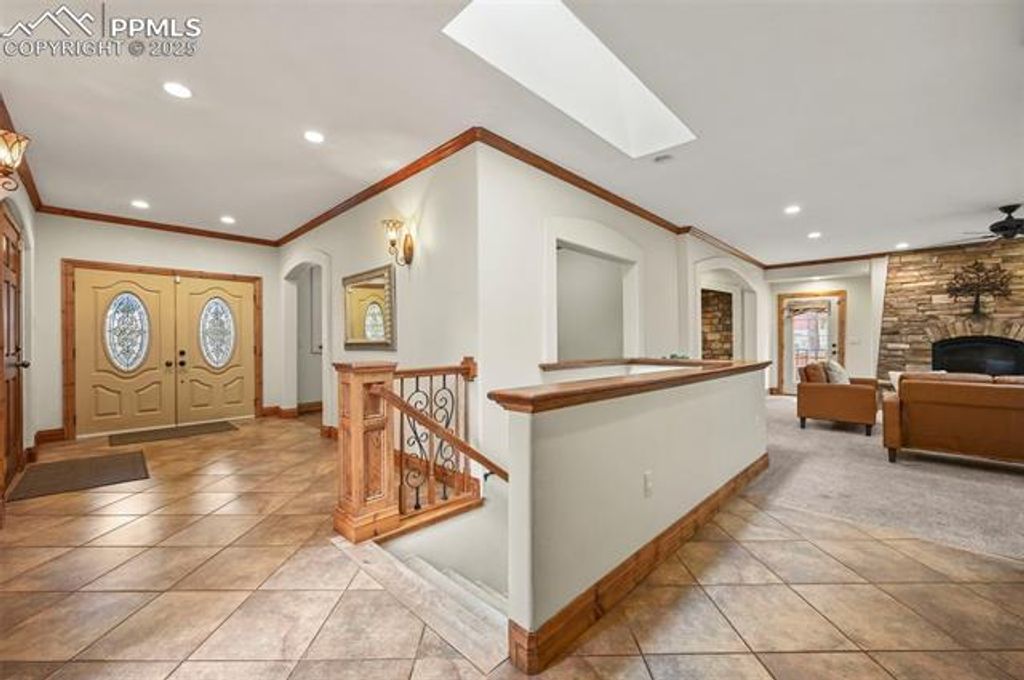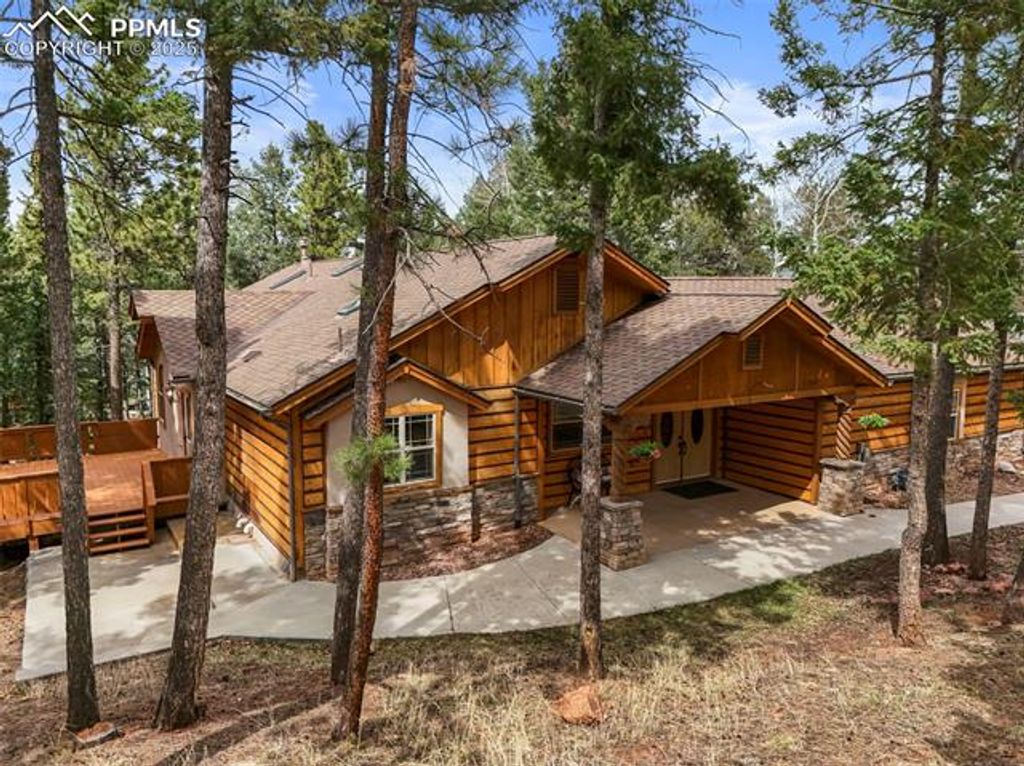 Nestled among towering pines on a fully fenced lot, this custom Woodland Park home captures the essence of Colorado living. Built as the personal residence of a custom home builder, it features hand-hewn log siding with authentic chinking and stone accents that set a warm, rustic tone throughout. Inside, an open-concept layout is perfect for everyday living and entertaining. The gourmet kitchen features Viking Professional stainless appliances, granite countertops, soft-close cabinetry, and a large eat-in island. A formal dining room just off the kitchen offers space for hosting. The main-level living area includes a natural gas stone fireplace and walks out to a serene patio. The spacious main-level primary suite has its own gas fireplace, skylights, a luxurious five-piece bath with a soaking tub and tiled walk-in shower, dual vanities, and a huge walk-in closet. A convenient half bath and laundry area complete the main floor"”designed for true no-step living. The home is heated by a boiler system with in-floor radiant heat, and the main floor includes central A/C. The oversized two-car garage has its own boiler heat on a thermostat, built-in workbenches, and a 220V outlet for welding or tools. Downstairs, the walk-out basement provides a full second living area with three bedrooms (each with walk-in closets), a full hall bath, and one en suite bedroom with its own bath. A large flex space works well for storage, a gym, or hobbies, and the lower patio is wired for a hot tub. Additional features include a radon mitigation system and whole-house vacuum. Located in a quiet neighborhood just minutes from downtown Woodland Park, this home is the perfect blend of comfort, space, and rustic elegance. Schedule your tour today and experience it in person!