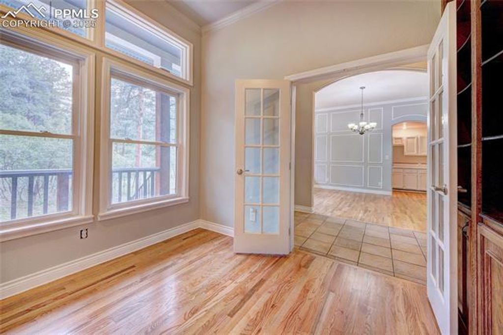 Imagine a story-book custom home nestled in pine trees and scrub oak on almost 1 acre in prestigious Perry Park! The beautiful flat lot adds lots of privacy with varying types of trees. Home backs to open space! Approaching the home you notice fresh paint, wood windows and composite decking. Steps leading to a grand entrance. You walk up to a wrap-around deck (3 sides of the house). Once inside you are invited to a warm entrance with hardwood flooring, an office with french doors, a formal dining room and a living room with gas fireplace. The 9' ceilings and natural lighting make a statement! The updated kitchen has a gas stove, stainless steel appliances, door to the deck and breakfast area, a pantry, butler's pantry and convenient half-bath! Then down the hall is the master bedroom, hardwood floors with a huge walk-in closet. Adjacent is a custom bath with walk-in shower, with deep soaking tub, double vanity and another door to the deck! Downstairs are two ample bedrooms, a family room with outside access, a full bath and utility room. The boiler provides efficient gas in floor radiant heat, heating including the garage! Plenty of room for RVs, golf-carts, toys, etc. with no HOA! Put this on the TOP of your list!
