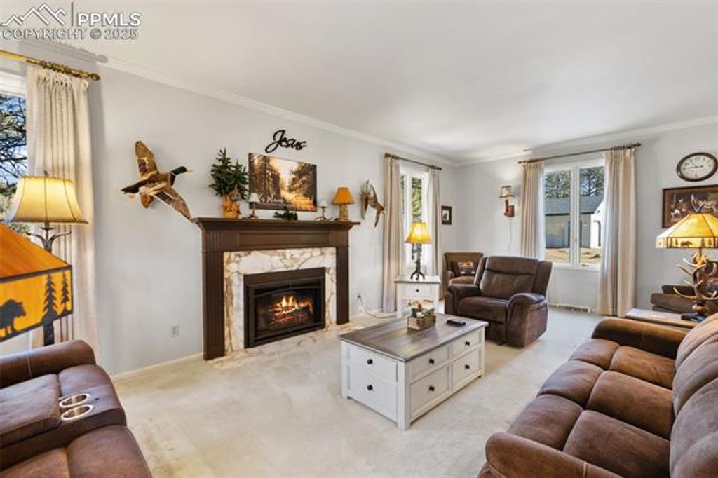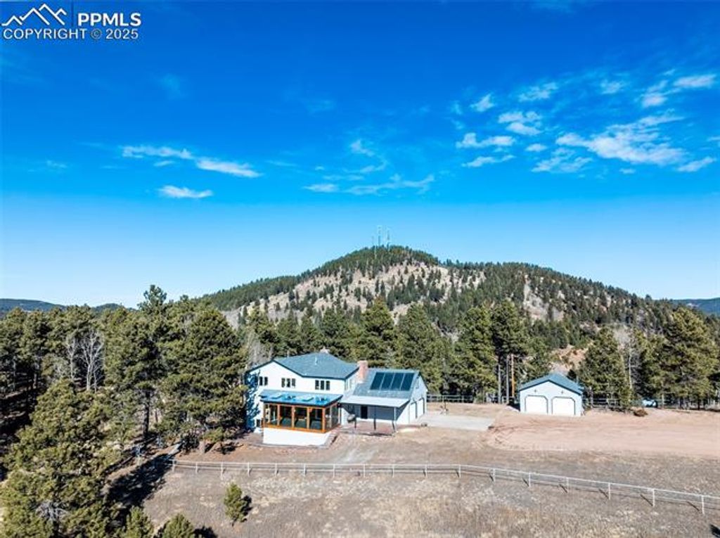 This stunning property showcases breathtaking unobstructed Pikes Peak views & offers the perfect blend of luxury living & exceptional equestrian amenities! Situated on 23.73 agricultural acres, the property features a 6-stall barn, 2 loafing sheds with separate corrals, & an additional outbuilding with 3 stalls & 2 private rooms ideal for an office & additional tack room. The barns have their own well & electric with a private gated entrance off of Hwy 24, creating the potential for a boarding facility or rental income opportunity. The home has been extensively updated, beginning with the beautiful new sunroom. This inviting space features a new electric fireplace, new vinyl windows, tile flooring, stucco, custom log accents, & an active solar temperature control which helps regulate temperature. The Family room has been refreshed with new LVP flooring, paint, & a 3-panel sliding door which opens up to the sunroom. The welcoming living room features a new gas insert fireplace with battery backup providing warmth even during a power outage. The kitchen has been beautifully updated with a new refrigerator, dishwasher, trach compactor, quartz countertop, backsplash, & newly painted cabinetry with new hardware. The primary bath features dual vanities with granite counters & new flooring. The basement has all new carpet & paint. It would make a great game room. Additional improvements include new electrical panels, GFCIs, 220V service to detached garage, & a new main sewer line. This Home is sold mostly furnished with beautiful furnishings. The home is on city water plus there are 2 wells (one is domestic). It offers 3 fireplaces, one is electric, one is gas & one is wood burning . There ae 3 family rooms, a formal living room, a loft with Pikes Peak views, attached 2-car garage & oversized detached 2-car garage. Fully fenced & walking distance to Woodland Park! This property would make a great wedding venue or vacation rental. Properties like this are hard to come by.
