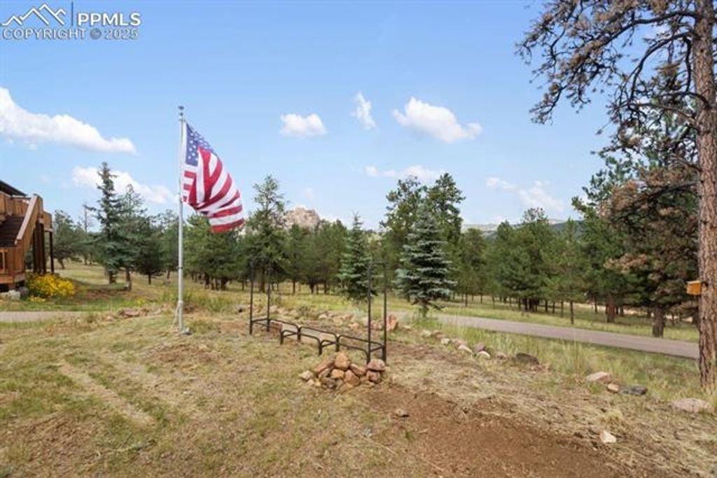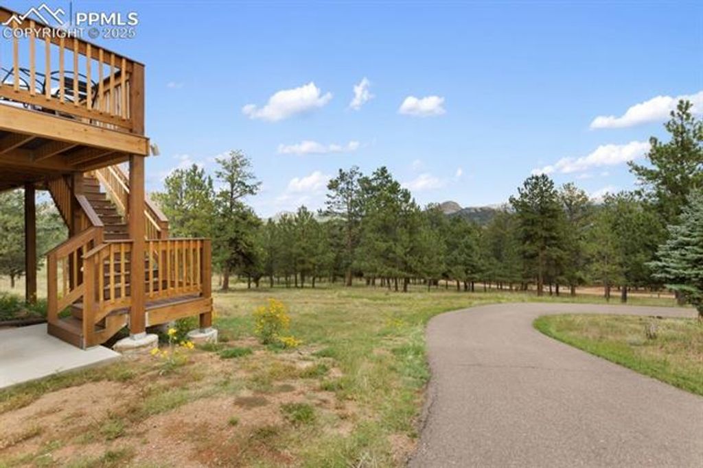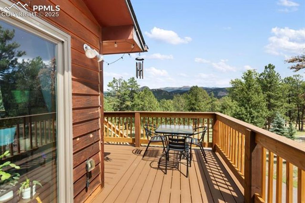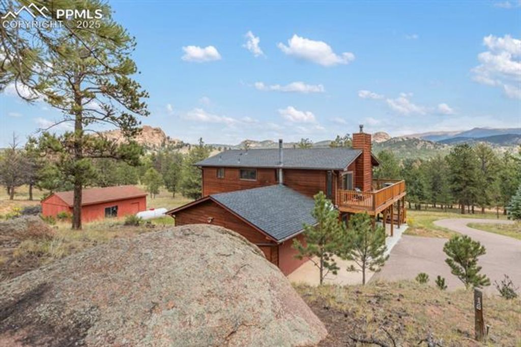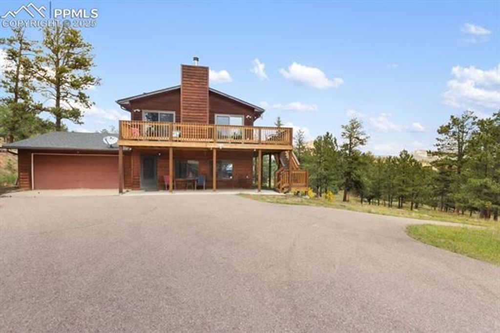 COME SEE THIS BEAUTIFUL AND MAJESTIC HOME AND MAKE IT YOUR OWN! EVERYTHING FROM THE GORGEOUS VIEW, THE SPACIOUS OPEN- FLOOR PLAN, AND THE NATURAL LIGHT IS PERFECT FOR HANGING OUT AND ENTERTAINING. Tucked away on a spacious 2.02-acre lot filled with towering pines and mature trees, this mountain raised ranch home offers privacy, beauty, and room to explore right outside your door. Whether it's summer barbecues, kids' adventures in the trees, or quiet evenings on the deck, this property truly delivers an outdoor Colorado lifestyle. Inside, vaulted pine ceilings and a striking stone fireplace create a warm, cabin-like atmosphere, while the modern kitchen is perfect for gatherings. The large family room is cozy with upgraded flooring. Custom blacktop driveway, 2 car garage and workspace, additional detached garage w/concrete floor makes great storage for those toys and tools. There is plenty of room to park that RV! Come home to beautiful mountain living!