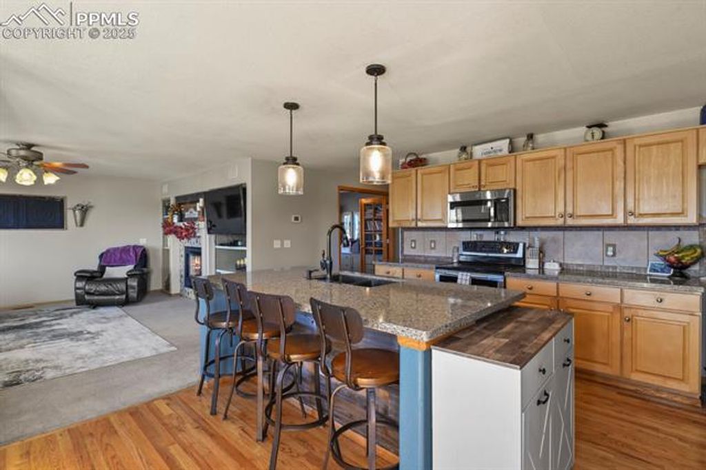 Don't miss out ! Come see this priced-to-sell property in the desirable Falcon area with breathtaking mountain views ! Start your mornings with coffee outdoors, or unwind around the fire pit with s'mores in the extra-large backyard while watching the sunset. This 4-bedroom, 4-bath home offers plenty of space for a growing family"”or one just starting out. With no enforced HOA, you have the freedom to plant your own garden, raise chickens, or simply enjoy the open possibilities. Inside, you'll love the two double-sided fireplaces"”one between the primary bedroom and the primary 5 piece bathroom while another on the main level between the living room and office "”perfect for those cozy evenings watching your favorite move or working on the next project there is also A bonus room downstairs "” perfect for a 2nd office, gym, or movie space . Another great amenity is the access to the neighborhood rec center with membership included. A very interesting fact that's worth mentioning is that the Unique wood accents over the fireplace and bar made from 100-year-old Broadmoor fence boards "” a true piece of local history! While the home could use a little TLC to make it truly yours, major updates are already underway like a new roof is being installed on or before closing. The spacious gourmet kitchen is a chef's dream, featuring a granite island, ample counter space, and three ovens"”perfect for hosting and cooking like a pro. And when you do venture out, you're just minutes from three grocery stores, great restaurants, and more"”though with all of what this home has to offer , you may never want to leave.