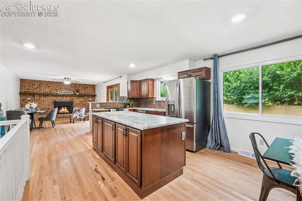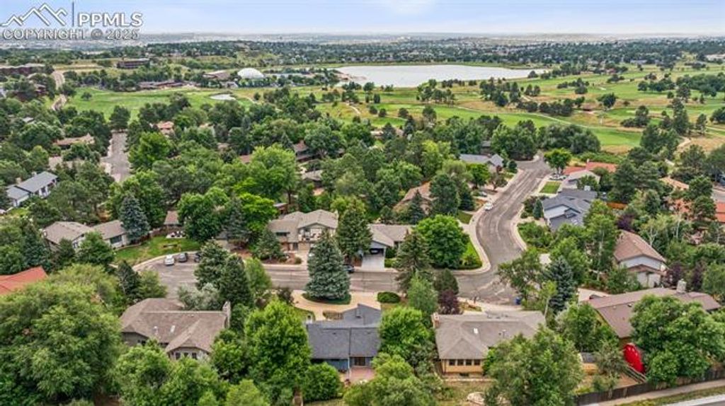 Walk to the Country Club of Colorado from this ranch home located in the heart of Cheyenne Mountain. Circular driveway & front pergola set the stage where cul-de-sac living answers the quest for calm. Open concept living, dining, kitchen AND hearth room lend to flexible living. Three large bedrooms located on the main level include the primary bedroom with ensuite bath. A full, hall bath with double vanity eliminate the battle for sinks! Just refinished, hardwood floors highlight the new granite kitchen counters. Gas fireplace in hearth room readies you for the Colorado crisp air. From here, walkout to the private, tiered back yard. Primary bathroom features custom tile work & fixtures. Bonus! The ceramic tile floor is radiantly heated. The fourth of 6 bedrooms is downstairs. It has a gas fireplace to warm a bedroom, office or study. Large entertainment area in basement with round, wood-burning fireplace and pillow den! Spacious laundry room provides space for a second frig and has 3 storage closets. Two additional bedrooms and a full bath in basement max this bedroom count to 6! Conveniently entertain many guests in the large lower back yard with spacious deck, gas line for grill, and smaller deck for potential hot tub. Storage shed and gated back yard (both wings) for access. Short commute to Fort Carson, close to parks, schools and shopping.