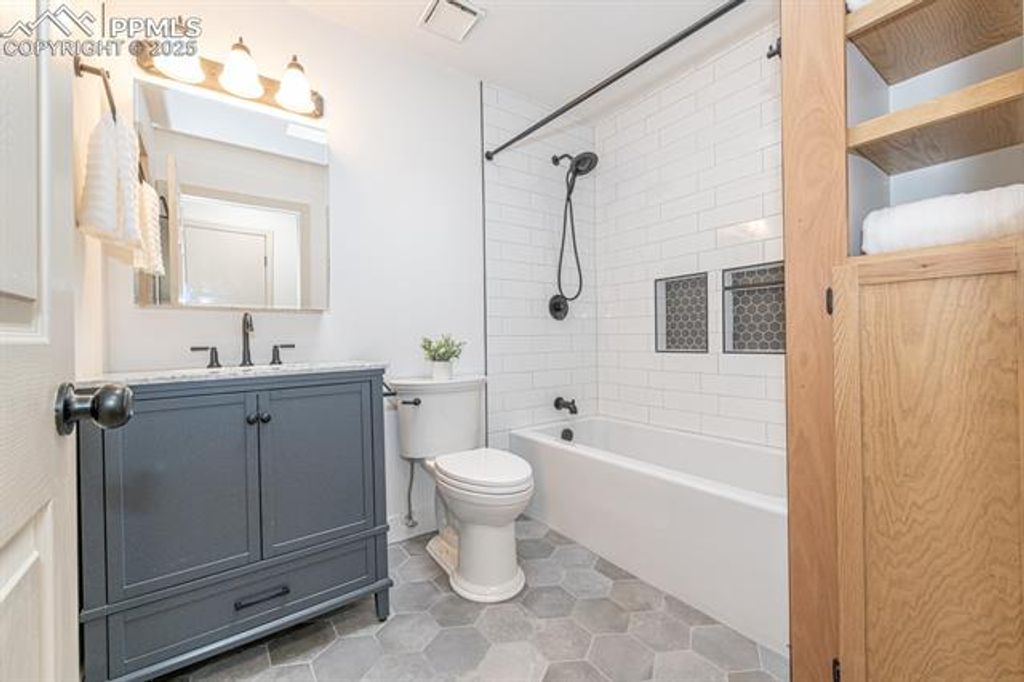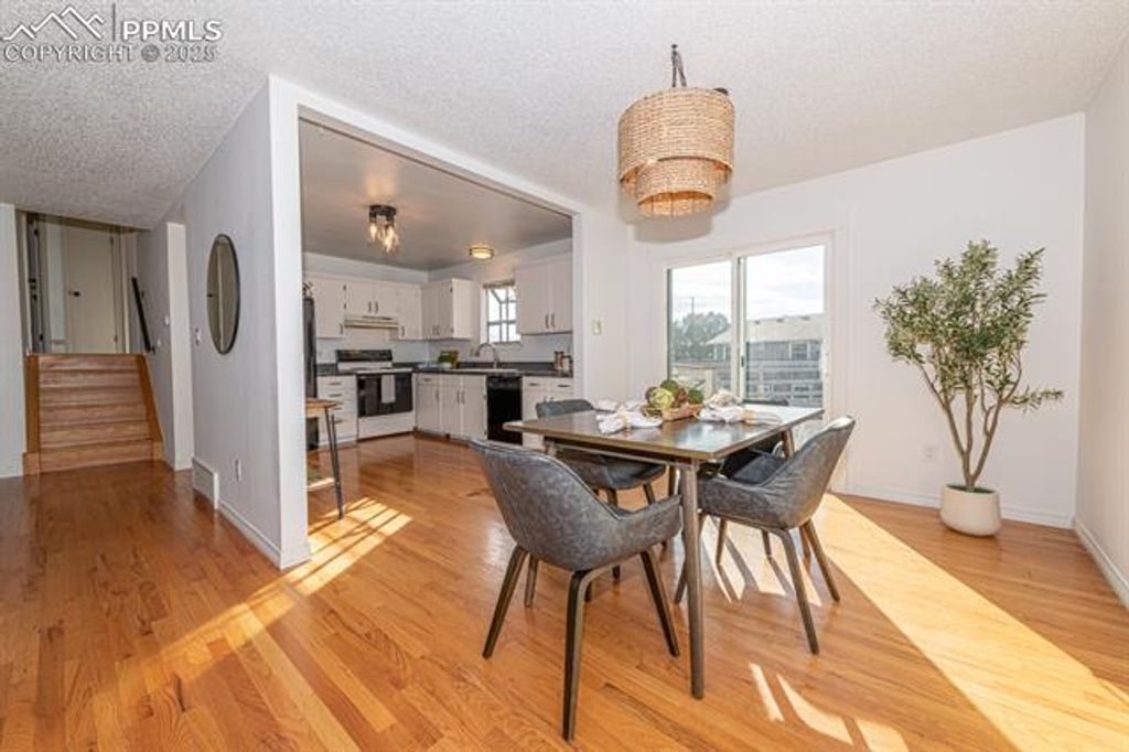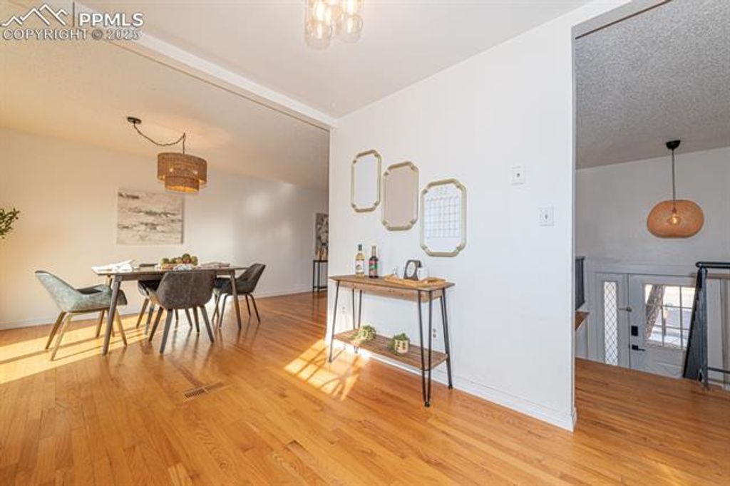 Welcome to this beautifully updated home nestled on a quiet cul-de-sac street, offering comfort, style, and sweeping views of the Front Range and iconic Pikes Peak. From the moment you step inside, you'll appreciate the thoughtful upgrades and inviting layout designed for both everyday living and effortless entertaining. The main level features genuine hardwood floors and elegant wrought iron railing, complementing the bright dining room (10×11) and a well-planned kitchen (13×10) equipped with newer refrigerator and dishwasher. The spacious family room (13×16) offers a warm and welcoming gathering space, while the expansive 25×21 composite deck"”perfect for entertaining"”provides a stunning backdrop of mountain views. Upstairs, the primary bedroom (13×12) includes a walk-in closet, carpet, ceiling fan, and is connected to the bath. Two additional bedrooms (13×10 and 11×9), each with a ceiling fan, offer flexible living arrangements. The remodeled upstairs bath is a standout, featuring a quartz countertop, tile flooring, subway tile surround, an tile inset niche for shampoo, and a sun-filled skylight. The lower level delivers even more living space with a newly carpeted 22×14 rec room, ideal for movie nights, hobbies, or a play area. Practical improvements throughout the home include a new electrical panel (2024), a new hot water heater (2025), and fresh exterior paint (2025), adding peace of mind and lasting value. Outside, the large, level fenced backyard is perfect for pets, play, and outdoor enjoyment. The oversized 2-car garage (21×24) provides exceptional space for vehicles, storage, or workshop needs. Beautifully maintained and packed with meaningful upgrades, this move-in-ready home blends charm, function, and an unbeatable location. Don't miss the opportunity to make it yours!