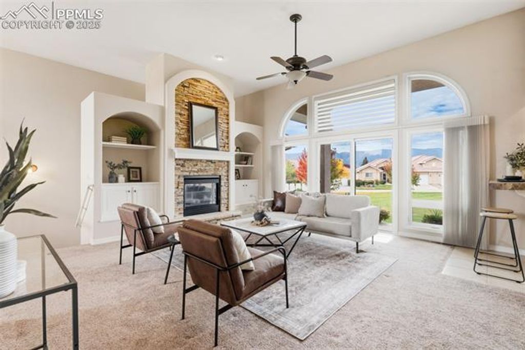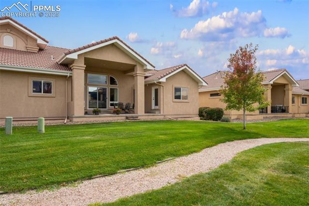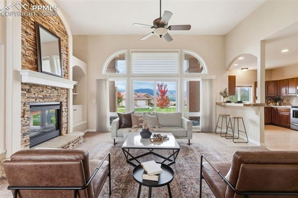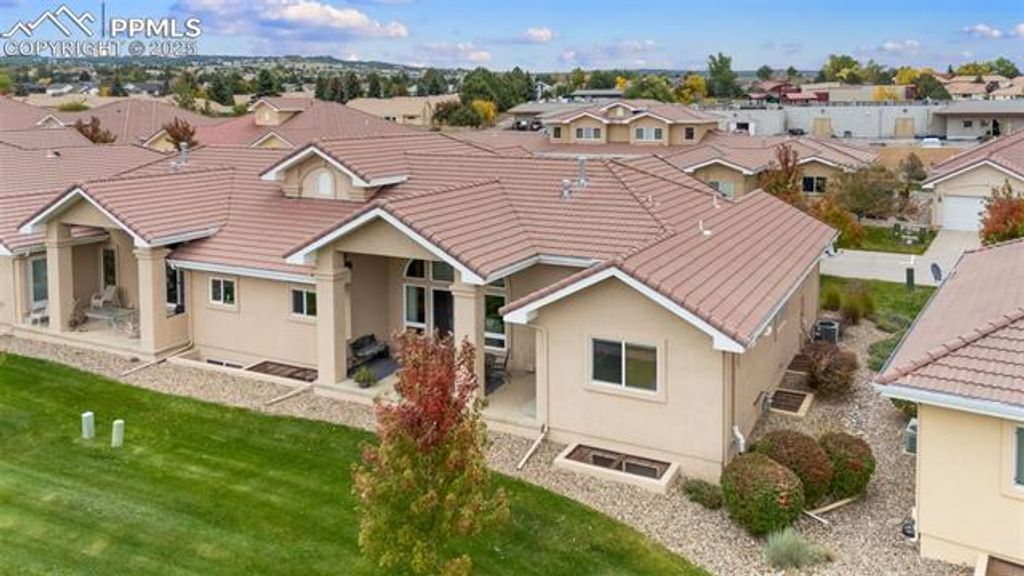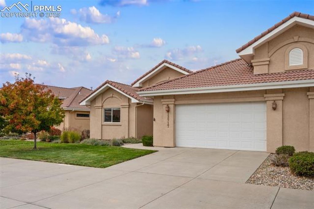 Welcome to Paradise Villas"”a rare blend of comfort, security, and breathtaking scenery. This beautifully maintained 4-bedroom, 4-bath ranch-style home with an oversized 2-car garage offers over 3,600 sq ft of refined living space in an exclusive gated community near the U.S. Air Force Academy. A covered front porch welcomes you into an open, light-filled floor plan with soaring 12' ceilings and stunning views of Pikes Peak. The spacious living room features abundant windows, a gas fireplace with a natural stone surround, and a walkout to a covered patio overlooking community open space and commanding Front Range views"”perfect for morning coffee or evening gatherings. The kitchen offers stainless steel appliances, ceramic tile flooring and counters, a pantry with custom wooden shelving, and equally impressive mountain vistas. The main-level primary suite boasts panoramic views, a walk-in closet with generous storage, and a luxurious 5-piece bath with garden tub. A second main-level bedroom and another full bath with tile and ample cabinetry complete this level. The finished basement expands your living options with a large family room, dry bar, two additional bedrooms sharing a Jack-and-Jill bath, and a convenient half bath. Enjoy the ease of gated security, professional landscape maintenance, and a beautifully kept neighborhood just minutes from shopping, dining, I-25, and the Academy. Paradise Villas offers the best of Colorado living"”spacious design, mountain views, and peace of mind in a private, upscale setting.