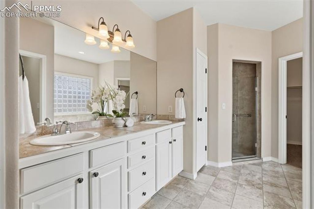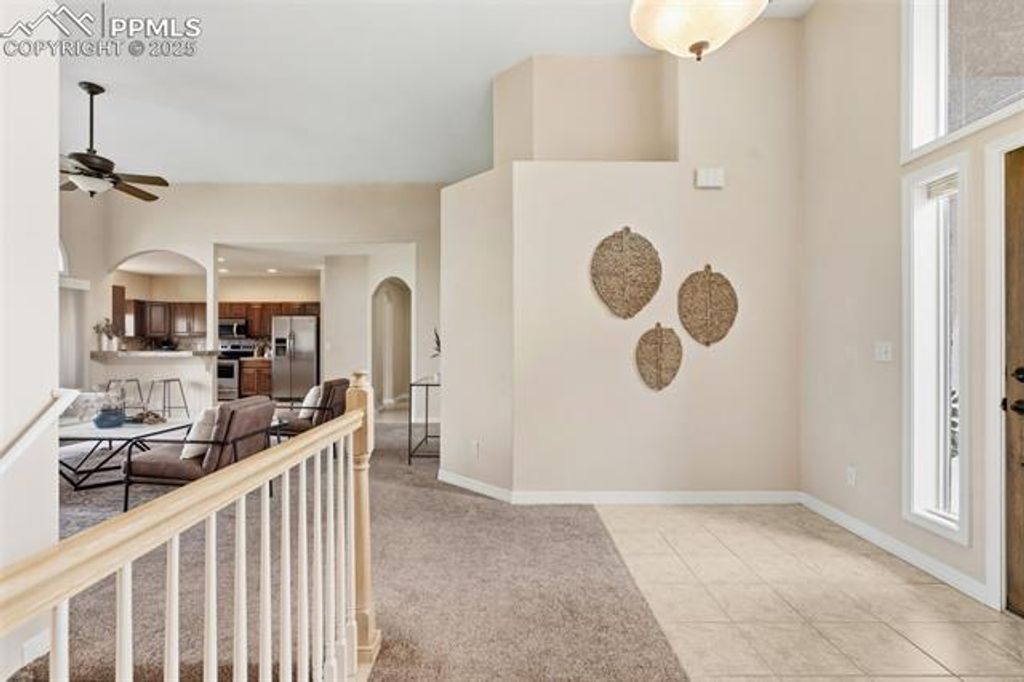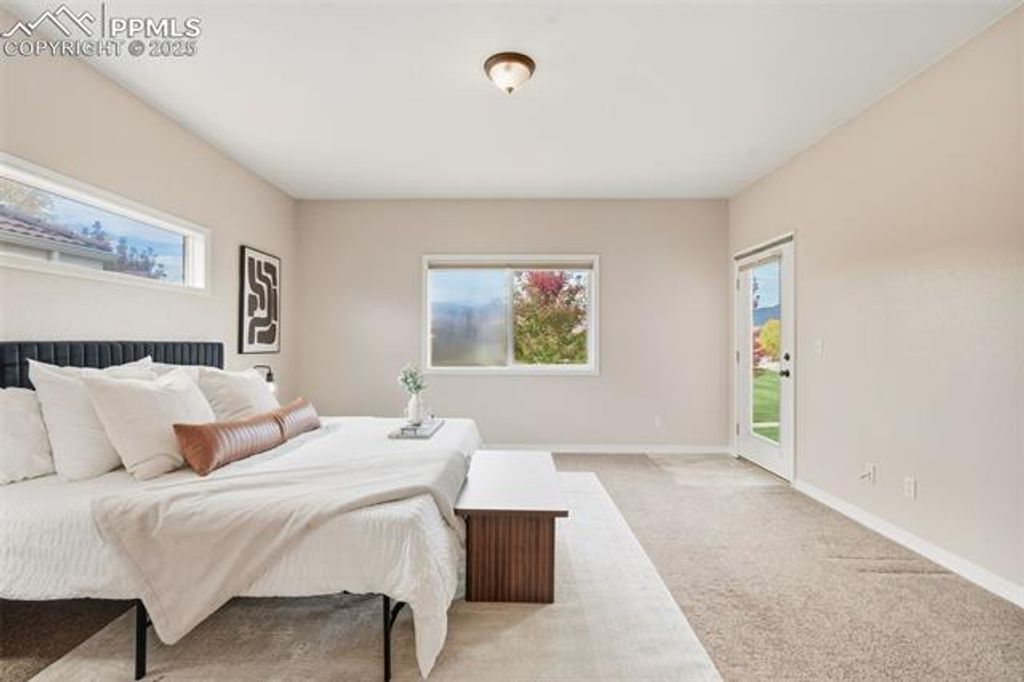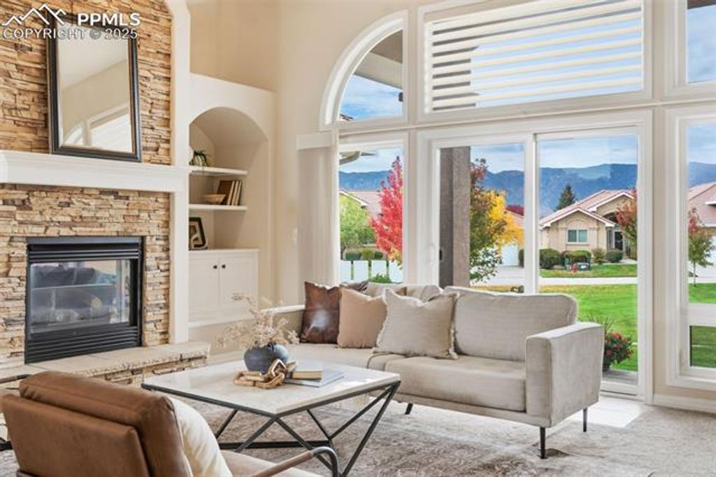 Welcome to Paradise Villas"”a rare blend of comfort, security, and breathtaking scenery. This beautifully maintained 4-bedroom, 4-bath ranch-style home with an oversized 2-car garage offers over 3,600 sq ft of refined living space in an exclusive gated community near the U.S. Air Force Academy. A covered front porch welcomes you into an open, light-filled floor plan with soaring 12' ceilings and stunning views of Pikes Peak. The spacious living room features abundant windows, a gas fireplace with a natural stone surround, and a walkout to a covered patio overlooking community open space and commanding Front Range views"”perfect for morning coffee or evening gatherings. The kitchen offers stainless steel appliances, ceramic tile flooring and counters, a pantry with custom wooden shelving, and equally impressive mountain vistas. The main-level primary suite boasts panoramic views, a walk-in closet with generous storage, and a luxurious 5-piece bath with garden tub. A second main-level bedroom and another full bath with tile and ample cabinetry complete this level. The finished basement expands your living options with a large family room, dry bar, two additional bedrooms sharing a Jack-and-Jill bath, and a convenient half bath. Enjoy the ease of gated security, professional landscape maintenance, and a beautifully kept neighborhood just minutes from shopping, dining, I-25, and the Academy. Paradise Villas offers the best of Colorado living"”spacious design, mountain views, and peace of mind in a private, upscale setting.