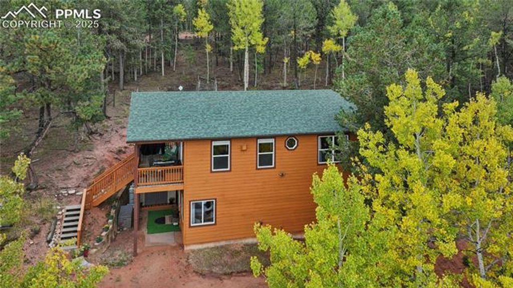 Discover the perfect blend of mountain charm and convenience in this beautifully maintained cedar-sided home. Just minutes from town, this retreat offers vaulted ceilings, rich wood flooring, and an abundance of natural light throughout. Step outside from the living room onto a covered 192 sq. ft. deck "” an ideal spot to soak up the sunshine and mountain air. The open kitchen is spacious and inviting, perfect for entertaining or everyday living. On the main level, the primary suite provides comfort and privacy with sweeping views of the Rampart Range. The lower-level family room offers a cozy walk-out space accented by striking log banisters. Enjoy the comfort of a newly installed ventilation system paired with light and heating in the master bath. Practical upgrades include a high-producing well and completed fire mitigation for peace of mind. With a voluntary annual road maintenance fee and no restrictions on Airbnb, this property has excellent potential as a personal getaway or income-producing rental. Two additional lots are also available, giving you room to expand or enhance your investments.