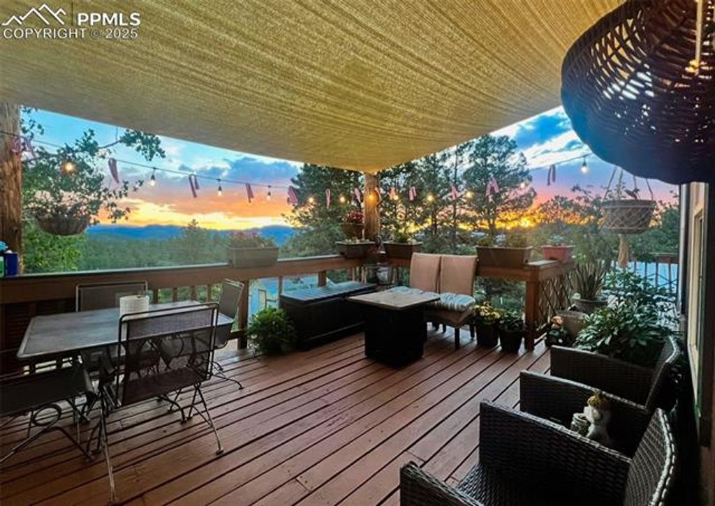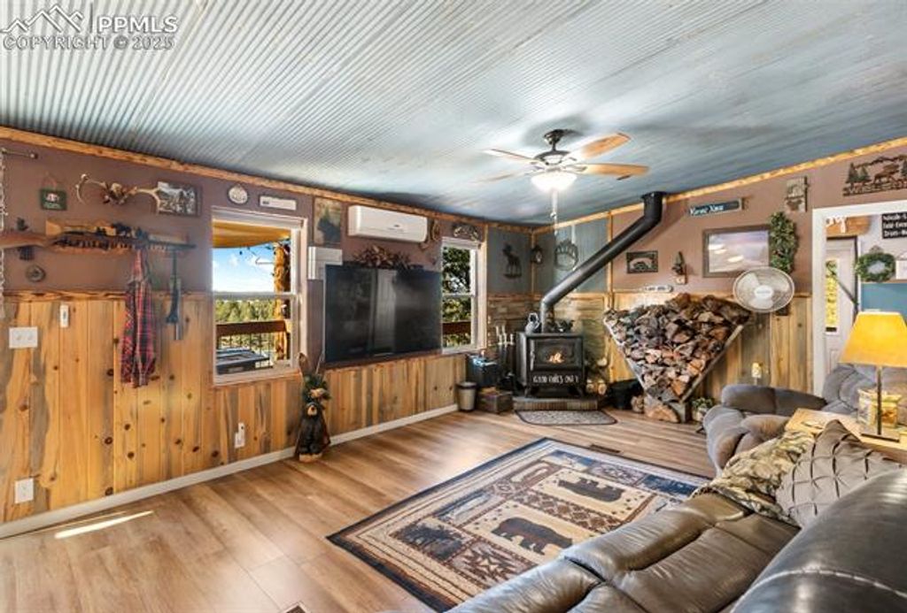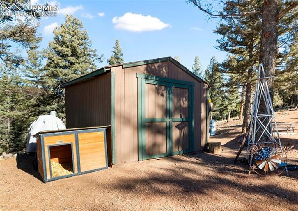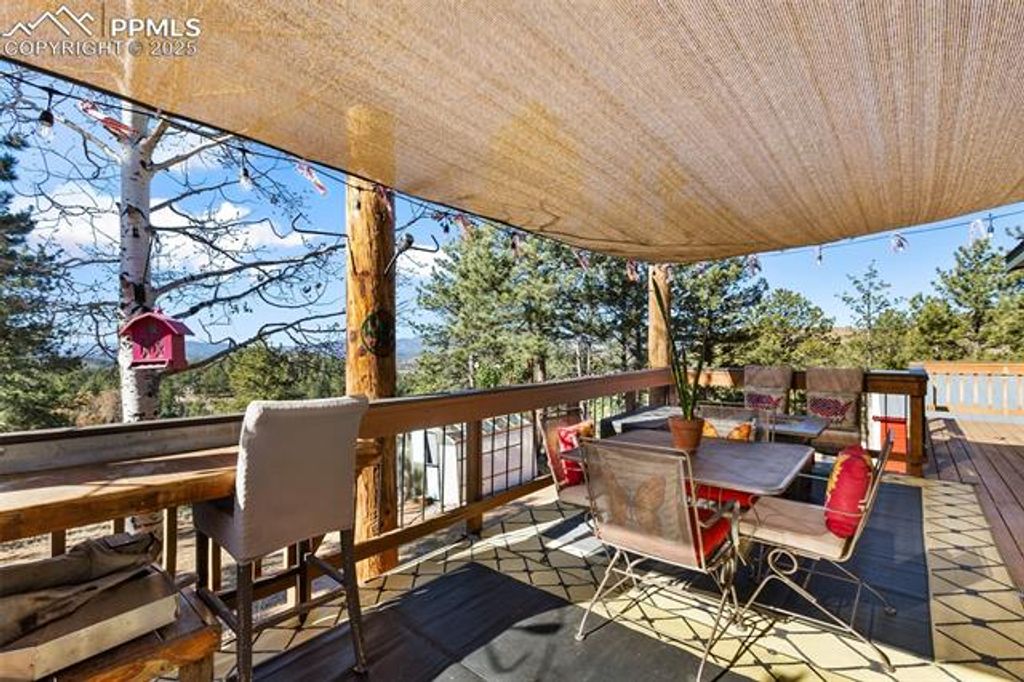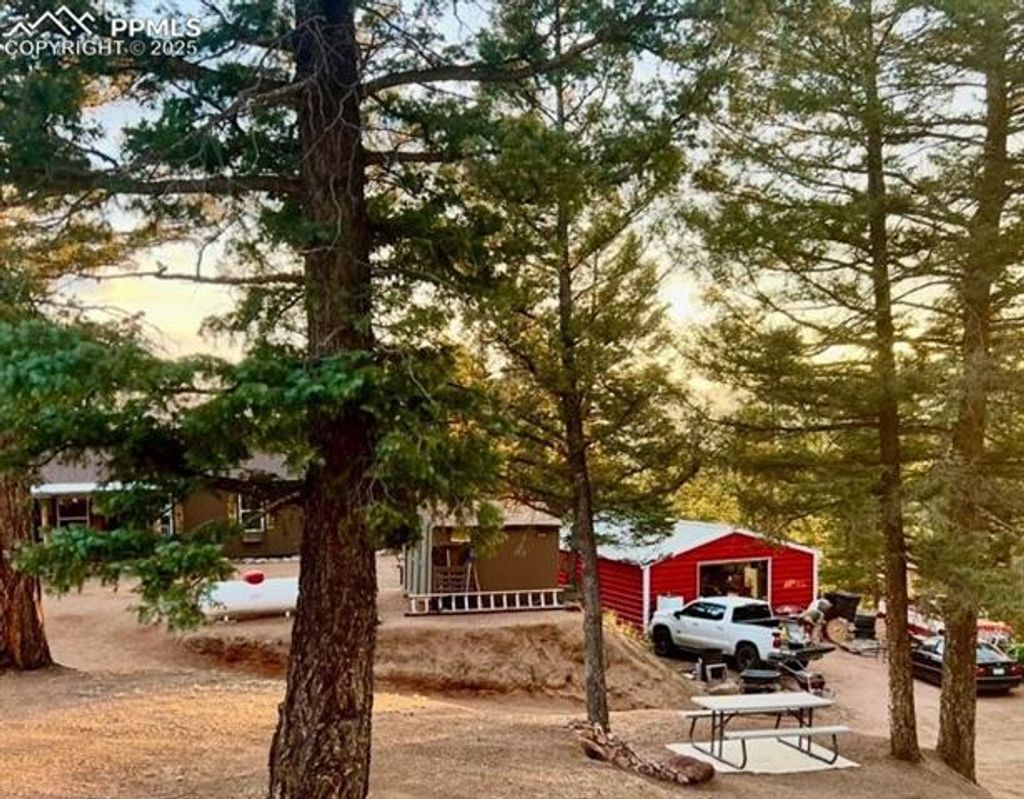 Serene mountain escape set-up with almost 5 acres, located just moments away from National Forest access trails for endless hiking, & recreating! Situated among the trees in a peaceful, tranquil setting and just 25 minutes from Woodland Park, 5 minutes from Highway 24, & only 1 hour to snow skiing, & just 10 minutes to trophy trout fishing in Eleven Mile Canyon! Spacious one level living w/ living area and family room areas, the home has been remodeled in 2020 w/ a "country charm", including a new free-standing wood-burning stove in the family room set in a masonry stacked rock hearth, w/ sheet metal backing; Beetle kill knotty pine tongue and groove; barn wood shiplap accent walls and doors; Mini split A/C and heater in family room; large owners suite adorned w/ electric wall fireplace, attached to 5pc bath w/ a freestanding soaking tub, and two walk-in closets; Kitchen includes stainless appliances, & Butcher block and granite countertops; dining area is surrounded by sheet metal chair rail; Re-roofed in 2018; new rustic redwood covered deck; new exterior paint; covered rear wraparound deck w/ awning & new deck spindles, overlooking views to the South and Western sunsets; Additional features include new electrical service to house; new 24' x 50' pole barn/shop w/ an attached studio apartment living quarters w/ shiplap walls, wood ceilings, and 3/4 bath; 2 heated chicken coops; livestock fenced area with electricity and water running to the pen; greenhouse; Lookout at "Pride Rock" w/ firepit, and electrical in place, in addition to a seating area; RV parking, and beautifully maintained and fire mitigated 5 acres, with a circular driveway; 2/3 of the yard is fenced on the perimeter; Septic was pumped Fall 2024. Voluntary HOA; This property is set-up as a small ranchette and ready for your livestock, pets, and the whole family! Comfortably set-up for a wonderful mountain escape! Adjacent vacant land parcel is also available for sale under MLS #3229859.