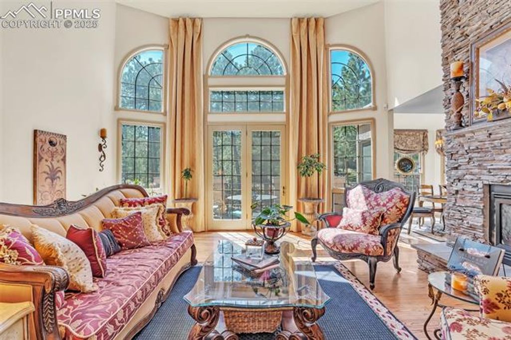 Tucked away on a private, tree-lined acre inside the prestigious Broadmoor Resort Community, this 6-bedroom two-story home offers a rare combination of space, comfort, and setting. Step inside to a vaulted entryway with an elegant curved staircase, opening to a light-filled great room with oak hardwood floors and a beautiful two-way stone fireplace. The heart of the home is the open kitchen"”complete with a gas range, pantry, large island, and connected informal dining space that makes entertaining easy. The main-level primary suite is a true retreat, featuring a five-piece bath and its own double-sided fireplace. Also on the main floor is a spacious office or flex space with vaulted ceilings, built-ins, and another fireplace"”ideal for working from home, a music room, or library. Upstairs you'll find additional bedrooms with plenty of space, while the finished basement adds even more to love: a theater area, stone-accented wet bar with slab granite, bonus room for a gym or hobby space, and a third fireplace to keep things cozy. Step out back to a quiet deck surrounded by mature evergreens"”perfect for relaxing or hosting gatherings in total privacy. Located behind a 24-hour staffed guard gate with an additional residents-only back gate, this home offers easy access to The Broadmoor Hotel, Country Club of Colorado, restaurants, shopping, and Hwy 115. Residents also have the option to join the Broadmoor Golf Club. All of this in the award-winning Cheyenne Mountain D12 School District, consistently ranked #1 in the state.