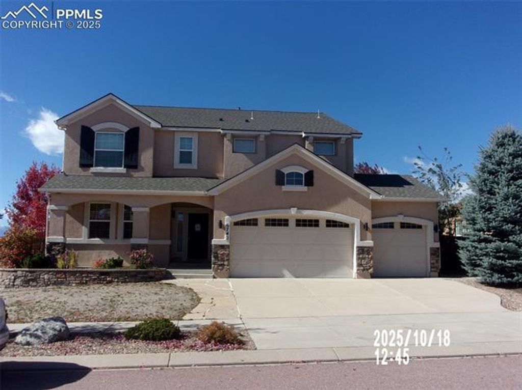 Open, spacious home with 2 stories, plus finished, walk-out basement on just under a 1/4 acre (10,198 sq ft), fully landscaped lot with concrete walk leading from garage side door to backyard, privacy fence, and views of Pikes Peak and Front Range from great room, covered deck, casual dining and master suite. 4,536 square feet 6 bedrooms, including large mastersuite with sitting room, generous walk-in closet, luxurious bath with with glass surround shower and bench, double vanity, over-sized tub, linen closet and French doors at bath and sitting room. 3 full baths, plus powder room. Site finished hardwood floors throughout 1st floor and wood-shelving in all closets 9-foot ceilings, soft neutral colors, hand-troweled walls, custom faux wood 2-inch blinds throughout home. Covered front porch, entry with double closet Study/Den with French doors Dining room with arched openings to front hallo and great room Kitchen with tall, soft white, Merillat Shaker-style cabinets, pull out shelves, soft close drawers, built-in wine rack, faux marble quartz countertop, farmhouse sink and bridge faucet, new Bosch dishwasher, slide-in LG electric range with dual-oven and warming drawer, walk-in pantry. Dining nook off kitchen with bank of French doors/glass sidelights leading to covered patio. Covered patio features Aztec composite decking, spindles and rails...looks new, with gas line Insulated and painted 3-cargarage with utility sink and overhead electric heater, epoxy floor 2nd floor features loft at top of stairs; large master suite, laundry room including lower cupboards, open shelving laundry sink and counter, two additional bedrooms Whole house fan with two-speed wall switch, whole house humidifier Finished walk-out