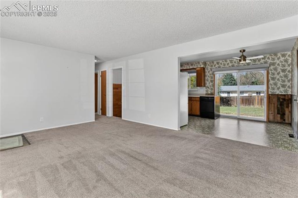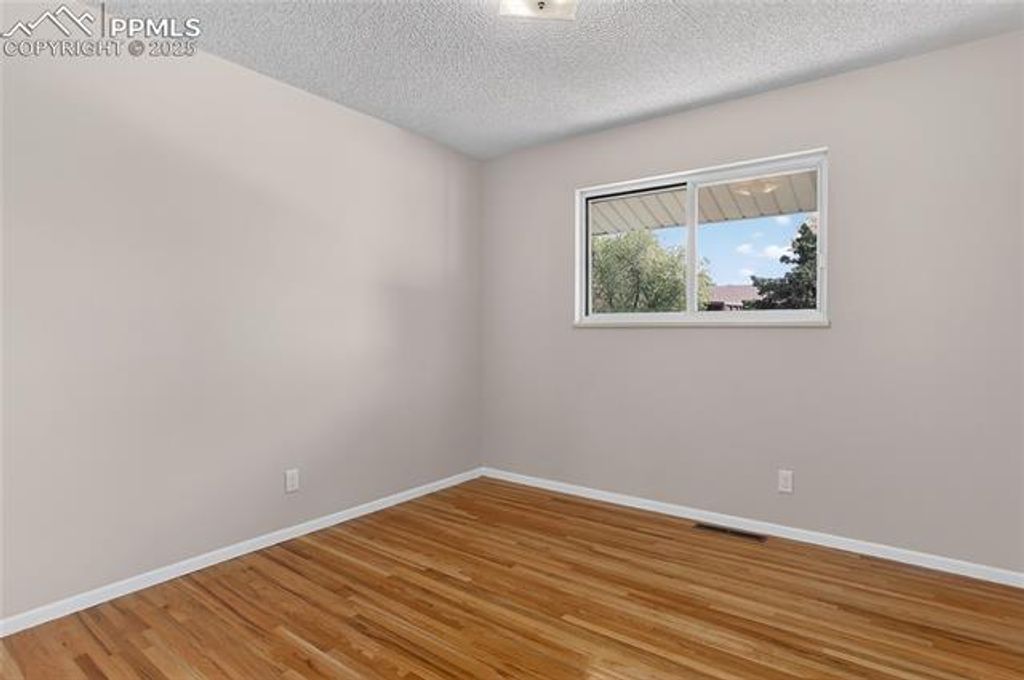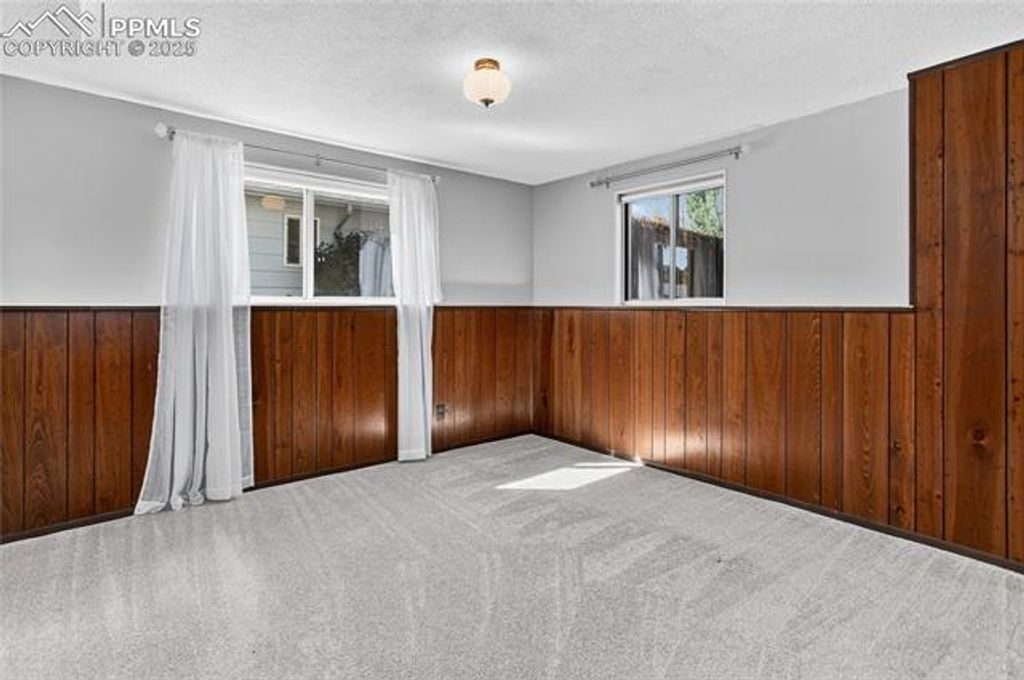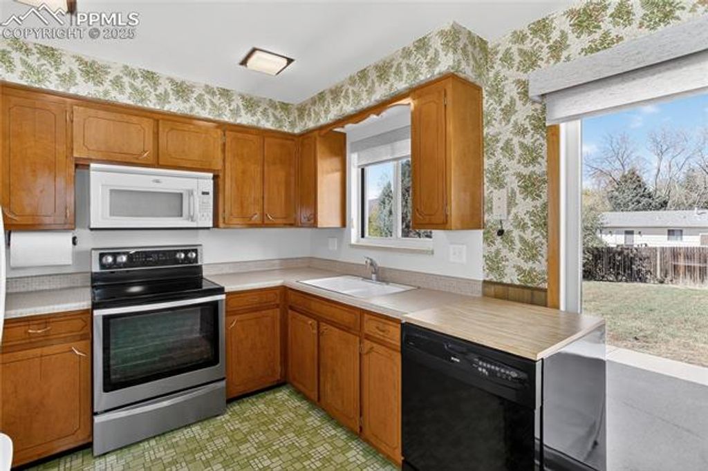Meticulously maintained rancher just minutes from UCCS! This lovingly cared for home features...a sunny, south-facing 15'x17' living room with bay window, original paneling, and hardwood floors underneath the newer carpet...charming eat-in kitchen with gleaming original cabinetry and scrollwork detail, window that overlooks the backyard, all appliances including electric smooth-top range, French door refrigerator and rolling dishwasher, and automated shades on the door out to the concrete patio...primary bedroom with hardwood floors under the newer carpet, two windows to let in the light, step-in closet and direct access to the roomy full hall bath with solid surface extended countertop and vanity seat space, built-in linen cabinet and marble-look tub/shower surround...2 additional main level bedrooms, both freshly painted and with refinished hardwood floors. In the basement you'll enjoy the cozy 12'x37' family room with original paneling, new carpet, two storage closets and plenty of space to use as a game/office/TV/playroom/gym...4th bedroom with above-grade windows, newer carpet, original paneling and ensuite 3/4 bath...laundry/mechanical room with included W/D...and 10'x11' workshop with ample built-in cabinetry and extra refrigerator. Outside, you'll enjoy the...spacious backyard with cherry tree and partial mountain views...and extra parking on the side of the driveway. Just a short distance to Portal Park, UCCS, University Village shops and restaurants, and access to several bike trails. Furnace, AC, storm door ('24); garage door opener ('22); roof ('19); 50 gallon water heater ('14); almost all vinyl windows, too!