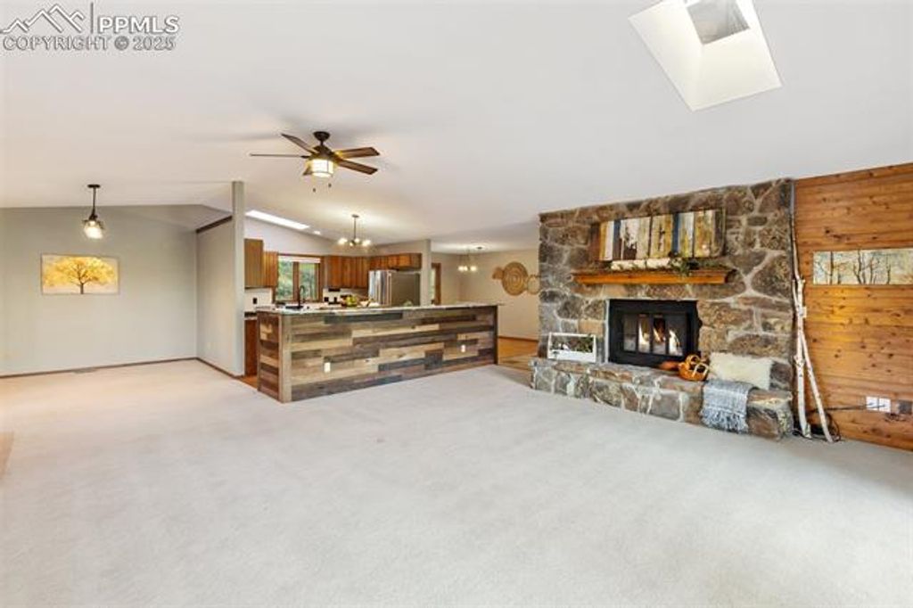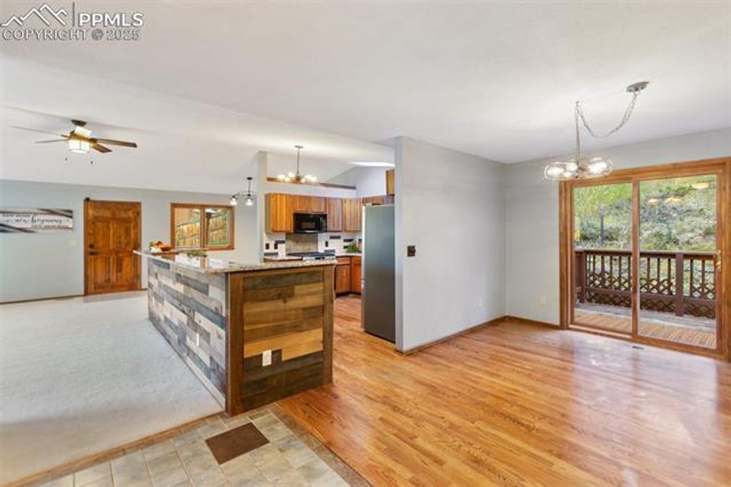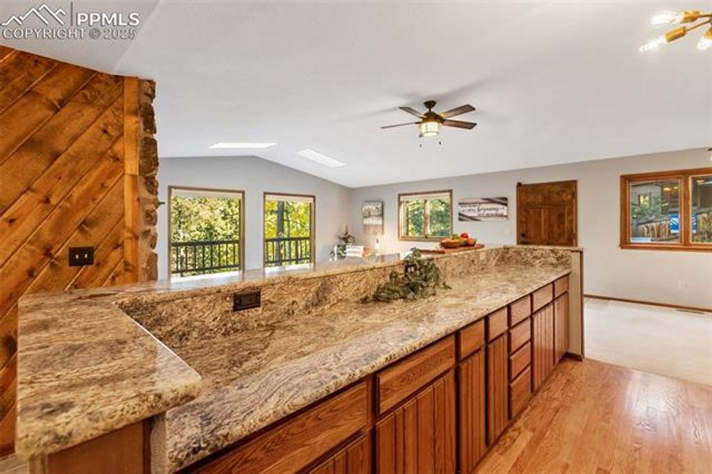 Just two minutes from downtown Woodland Park, yet worlds away in feel, this stunning raised ranch home offers privacy, tranquility, and beautiful westerly views. Perfectly perched among the trees in the desirable neighborhood of Paradise Estates. With views of Woodland Park, and Pikes Peak, you'll enjoy breathtaking sunsets. Set on a treed 0.61-acre lot, this cedar-sided 4-bedroom, 3-bath home has been upgraded throughout. A recently installed, 50-year rated metal roof with skylights enhances both durability and natural light. The wraparound deck invites you to relax and entertain! Inside, the great room features vaulted ceilings and a striking moss rock natural gas fireplace"”ideal for cozy winter nights. The kitchen is a cook's dream, showcasing newer stainless steel appliances, granite countertops, a deep composite sink, and an impressive 12-foot granite breakfast bar with a stylish shiplap accent wall overlooking the living room. Pella windows throughout the home, complemented by new interior paint, refinished oak hardwood floors, a rustic pine stairway, solid pine doors and trim, and all-new light fixtures. Additional highlights include a formal dining room, breakfast nook, and remodeled bathrooms with updated fixtures. The lower level offers new carpet in the bedroom and a Schrader wood-burning stove for added comfort. Tech-savvy amenities include Wi-Fi garage door openers and a Tesla electric car charger. 11-inch-thick newly paved asphalt driveway, and a storage shed for extra space. Just minutes from the conveniences of town, and with National Forest access nearby for hiking and adventure, this home delivers an unbeatable combination of seclusion, and accessibility. possibility to be a wonderful 2nd home, and easy access and proximity to the schools. Terrific mountain bike riding throughout the region, and hiking in nearby National Forest.