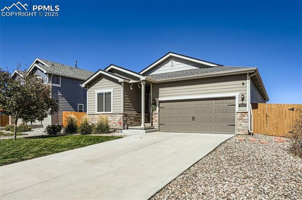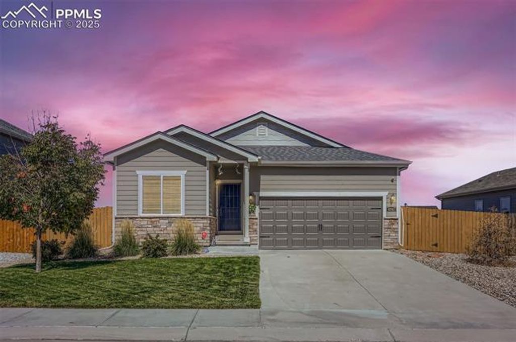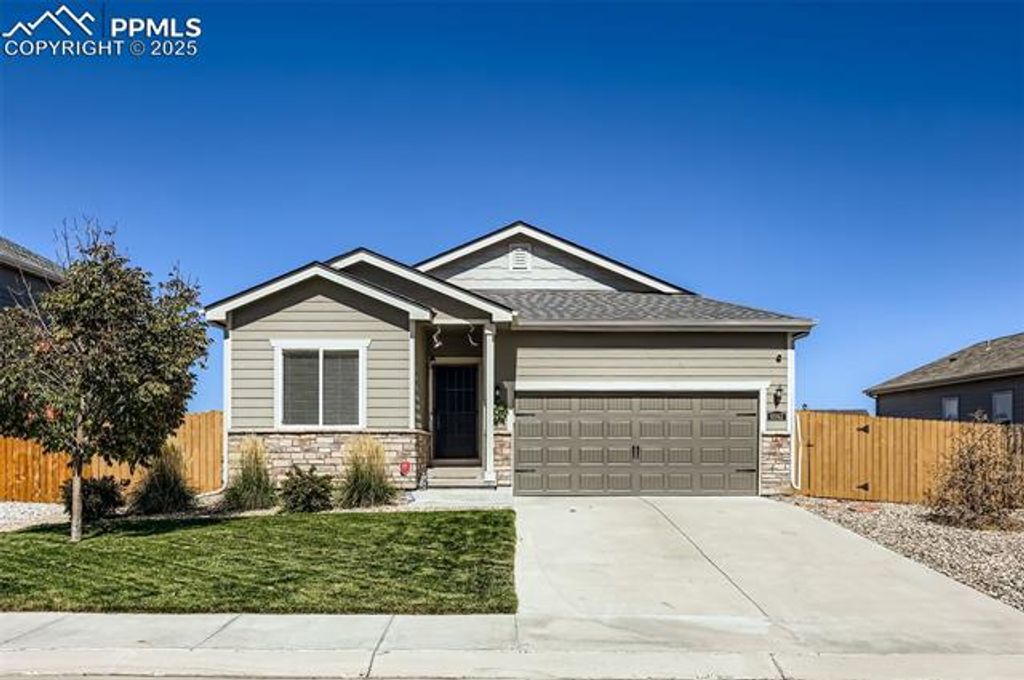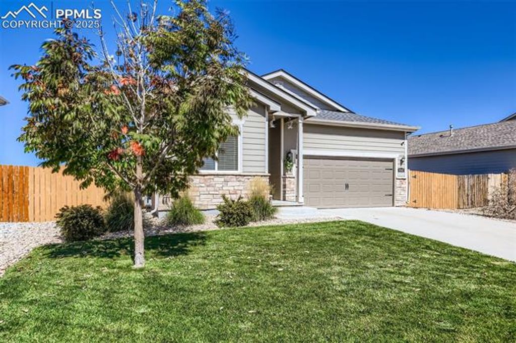 Welcome to this beautifully maintained ranch-style home in the desirable Lorson Ranch neighborhood, offering main level living and Colorado charm. This thoughtfully designed three bedroom, two bath residence features a spacious great room and large dining area"”ideal for everyday living and entertaining alike. The kitchen is the heart of the home, showcasing an oversized island, gas cook top, walk-in pantry, and abundant counter space. The expansive laundry room includes a washer and dryer with plenty of storage to keep things organized. The primary room is a peaceful retreat with an oversized tub/shower and large walk-in closet. Step outside to a lovely backyard deck with mountain views, the perfect backdrop for morning coffee or evening gatherings. The landscaped, and fenced yard includes sod with sprinklers, and a mature tree and shrubs. Multiple upgrades to this home include stone-accented siding, a new roof, a new garage door, GE stainless fridge and new disposal, window coverings, regularly serviced mechanical systems, air conditioning, and ceiling fans for year-round comfort. Stylish extended wood laminate flooring flows throughout much of the main level, complementing the home's open, airy feel. With close proximity to military bases, new schools, parks, and shopping centers, this home blends modern layout with everyday convenience.
