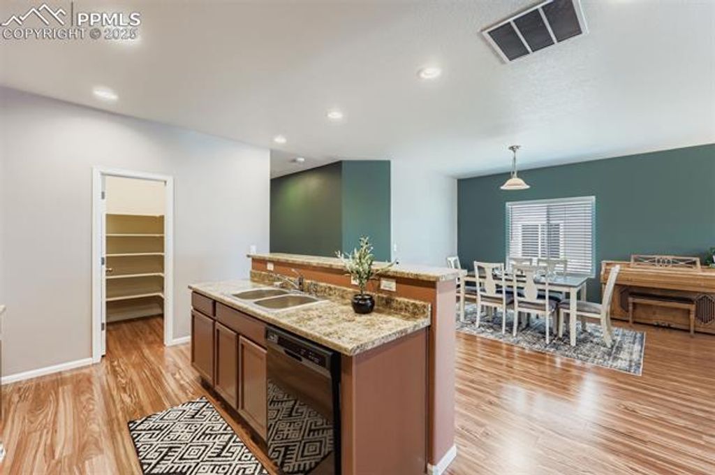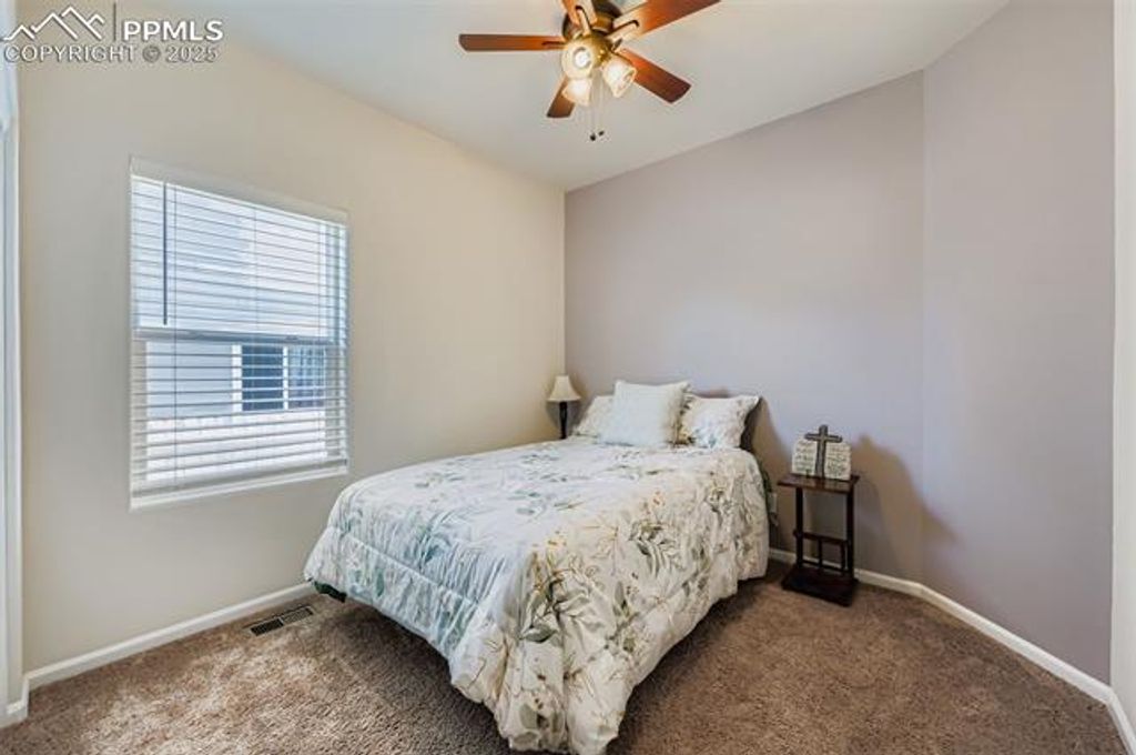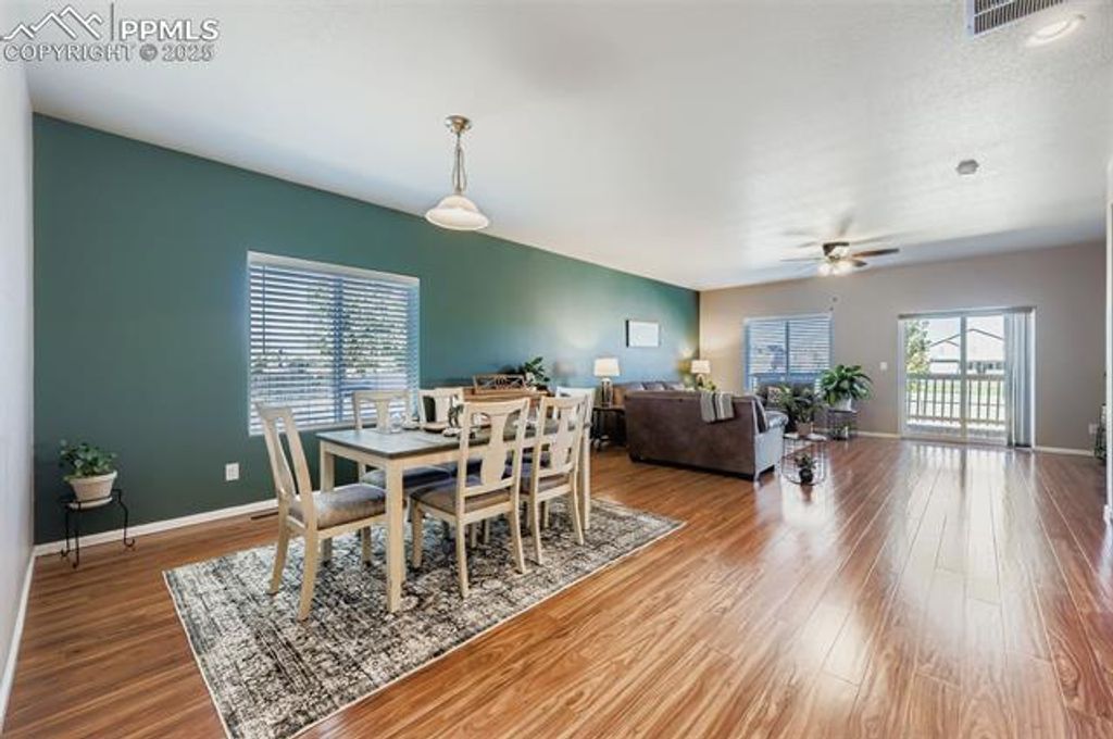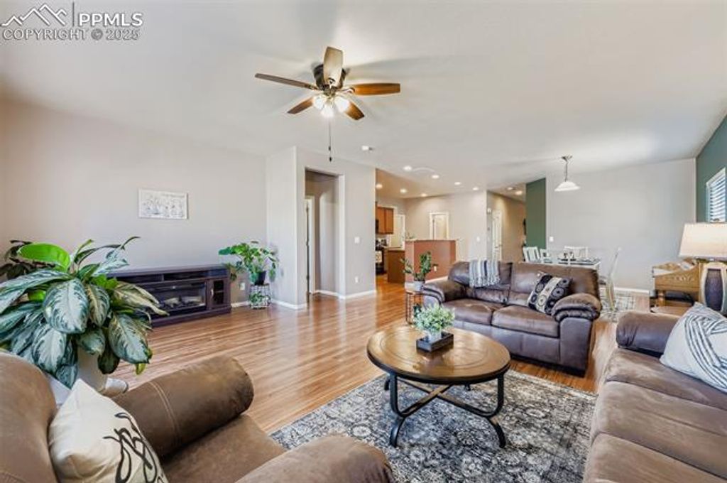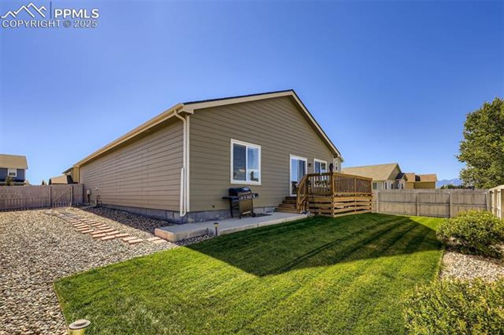 Welcome to this beautifully maintained ranch-style home in the desirable Lorson Ranch neighborhood, offering main level living and Colorado charm. This thoughtfully designed three bedroom, two bath residence features a spacious great room and large dining area"”ideal for everyday living and entertaining alike. The kitchen is the heart of the home, showcasing an oversized island, gas cook top, walk-in pantry, and abundant counter space. The expansive laundry room includes a washer and dryer with plenty of storage to keep things organized. The primary room is a peaceful retreat with an oversized tub/shower and large walk-in closet. Step outside to a lovely backyard deck with mountain views, the perfect backdrop for morning coffee or evening gatherings. The landscaped, and fenced yard includes sod with sprinklers, and a mature tree and shrubs. Multiple upgrades to this home include stone-accented siding, a new roof, a new garage door, GE stainless fridge and new disposal, window coverings, regularly serviced mechanical systems, air conditioning, and ceiling fans for year-round comfort. Stylish extended wood laminate flooring flows throughout much of the main level, complementing the home's open, airy feel. With close proximity to military bases, new schools, parks, and shopping centers, this home blends modern layout with everyday convenience.