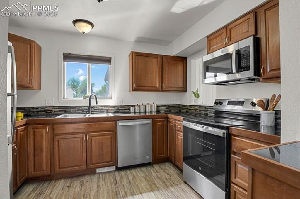 Welcome to the former model home of the Crosstrail neighborhood in Stratmoor in Southwest Colorado Springs! Built in 1984 as the first home in the neighborhood this home proudly sits on an oversized corner lot of more than a quarter acre with unbeatable mountain views from both the front and backyard. The finished 2-car-garage (once the sales office) adds incredible flexibility with extra windows, skylights, heating, extra outlets, plus room on the upgraded electrical panel for an EV charger. Inside, enjoy peace of mind with major systems updated: new roof (2024), furnace and A/C, (2017), and water heater (2019) as well as brand new appliances in the kitchen! Fresh carpet in the basement bedroom and professionally cleaned carpet in the rest of the home as well as window covers throughout make this home move-in ready. The fenced in side yard with patio is a great place to BBQ or a convenient dog run, space to garden, play, or simply relax. Put up a fence around the huge backyard and you get even more of all this space for entertaining and more! The prime location is ideal to military bases, shopping, trails, the Broadmoor, I25, and all daily needs while the home sits on a quiet cul-de-sac - ready for its next chapter with you!